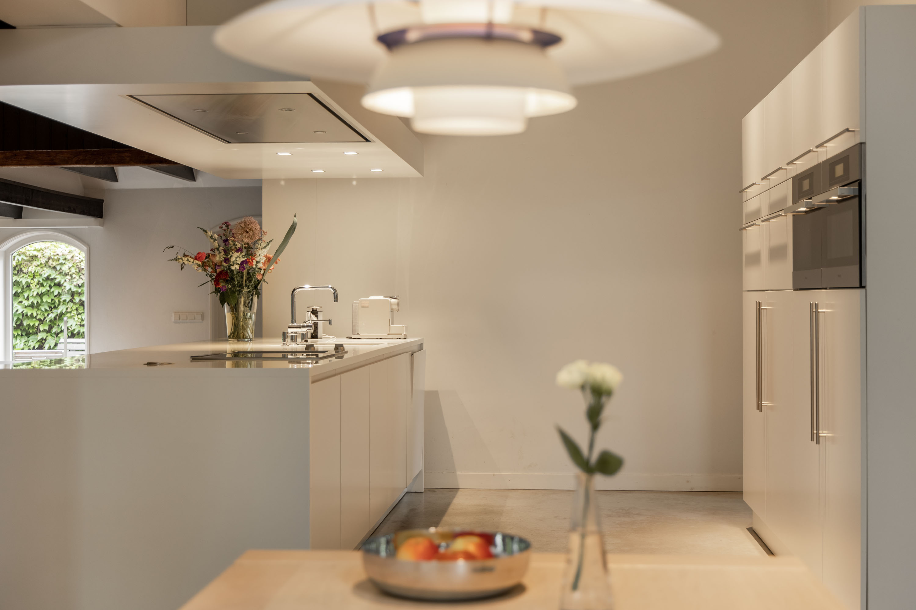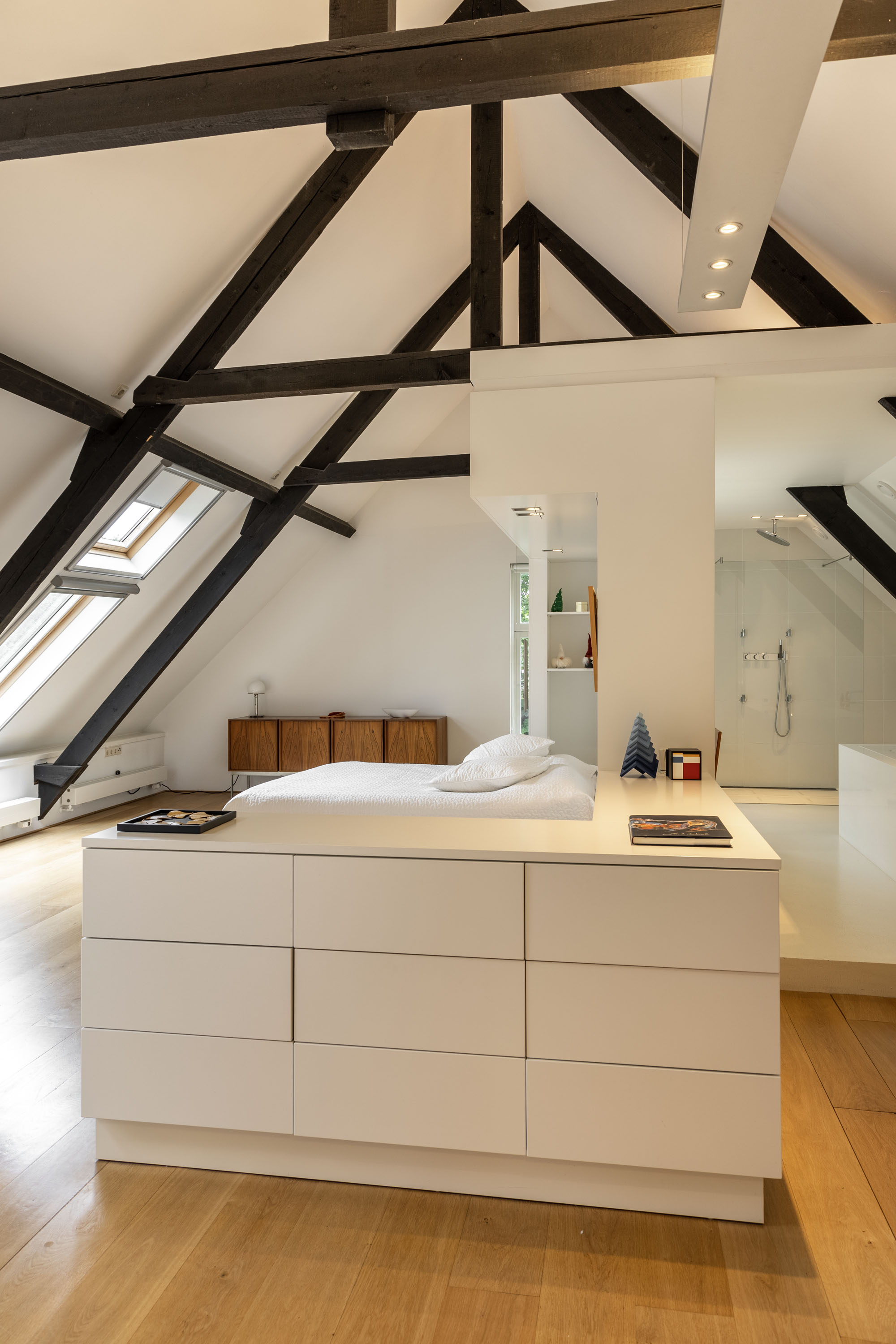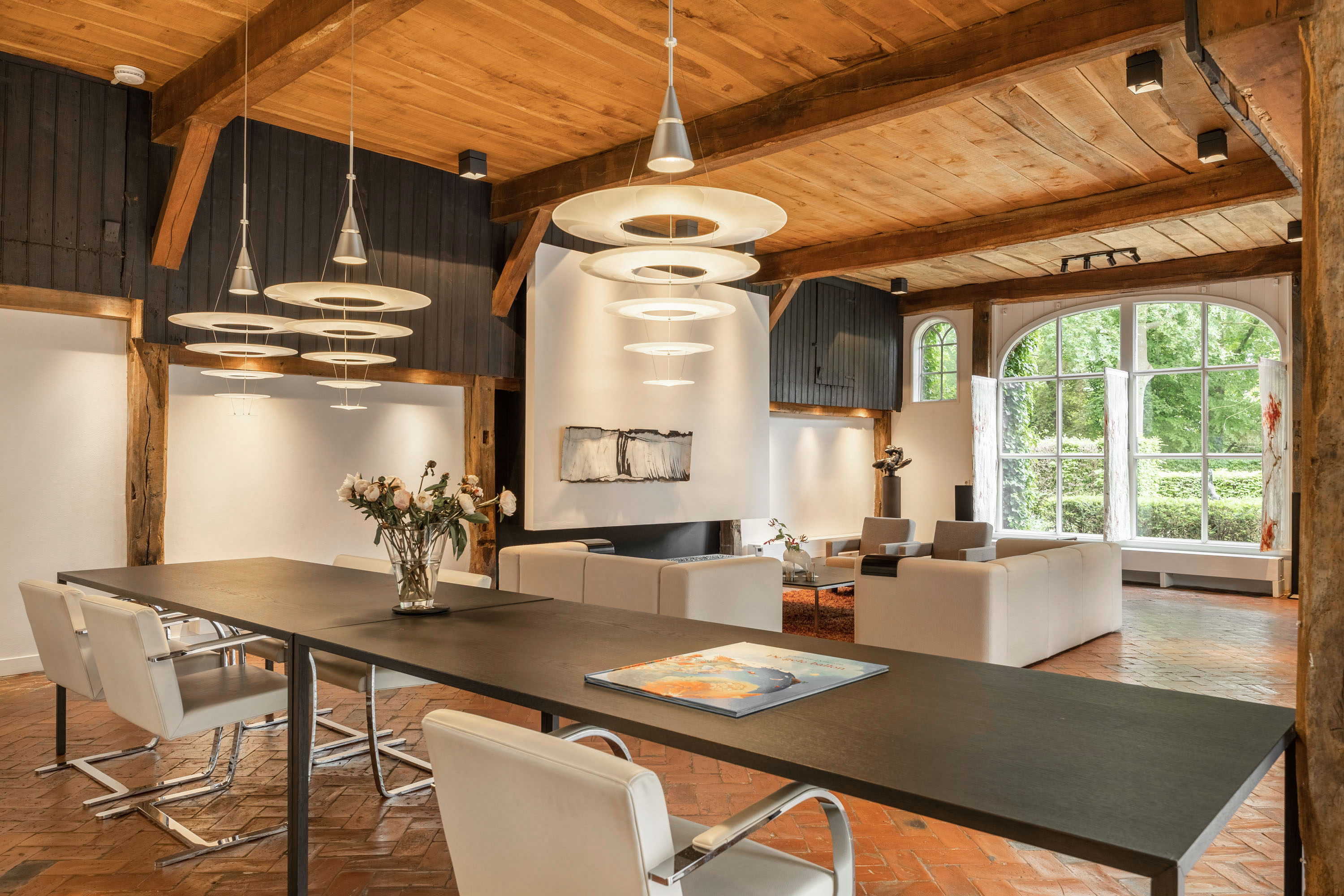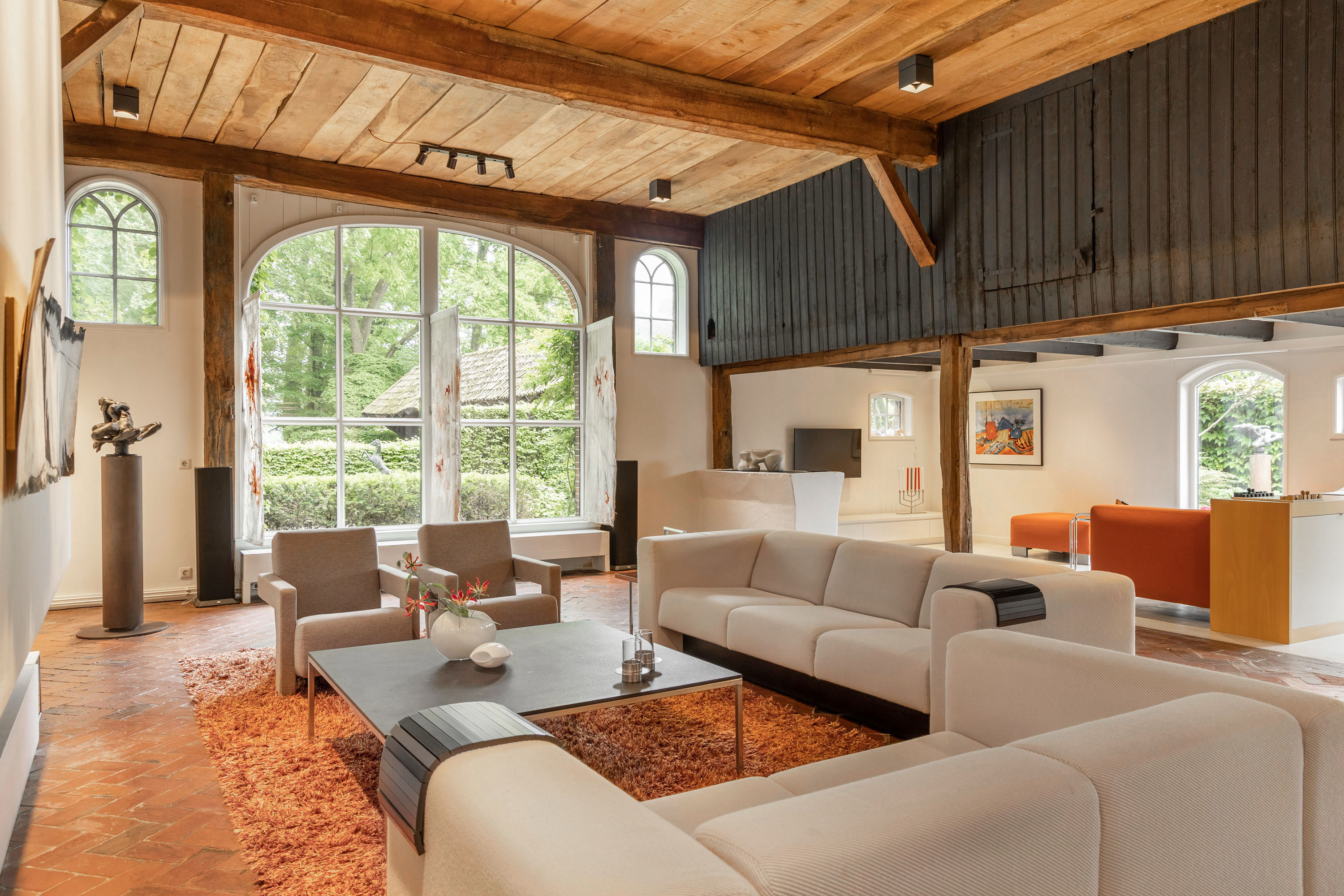 The original barn area has been transformed into a breathtaking living space with an adjoining open kitchen. The area is "more than generous," yet, thanks to the well-thought-out layout, it feels cozy and inviting. In the living room you can find the original floor and the interior doors with glass allow for phenomenal views from inside. The old beams have been wonderfully incorporated into the modern interior and the contemporary gas fireplace is a stunning centerpiece, providing warmth and ambiance during the winter months. The space offers various options for relaxing or dining. The centrally placed, built-in kitchen with a modern white high-gloss finish anchors the dining area, where there is ample space for an XL dining table. This area has a concrete cast floor with underfloor heating.