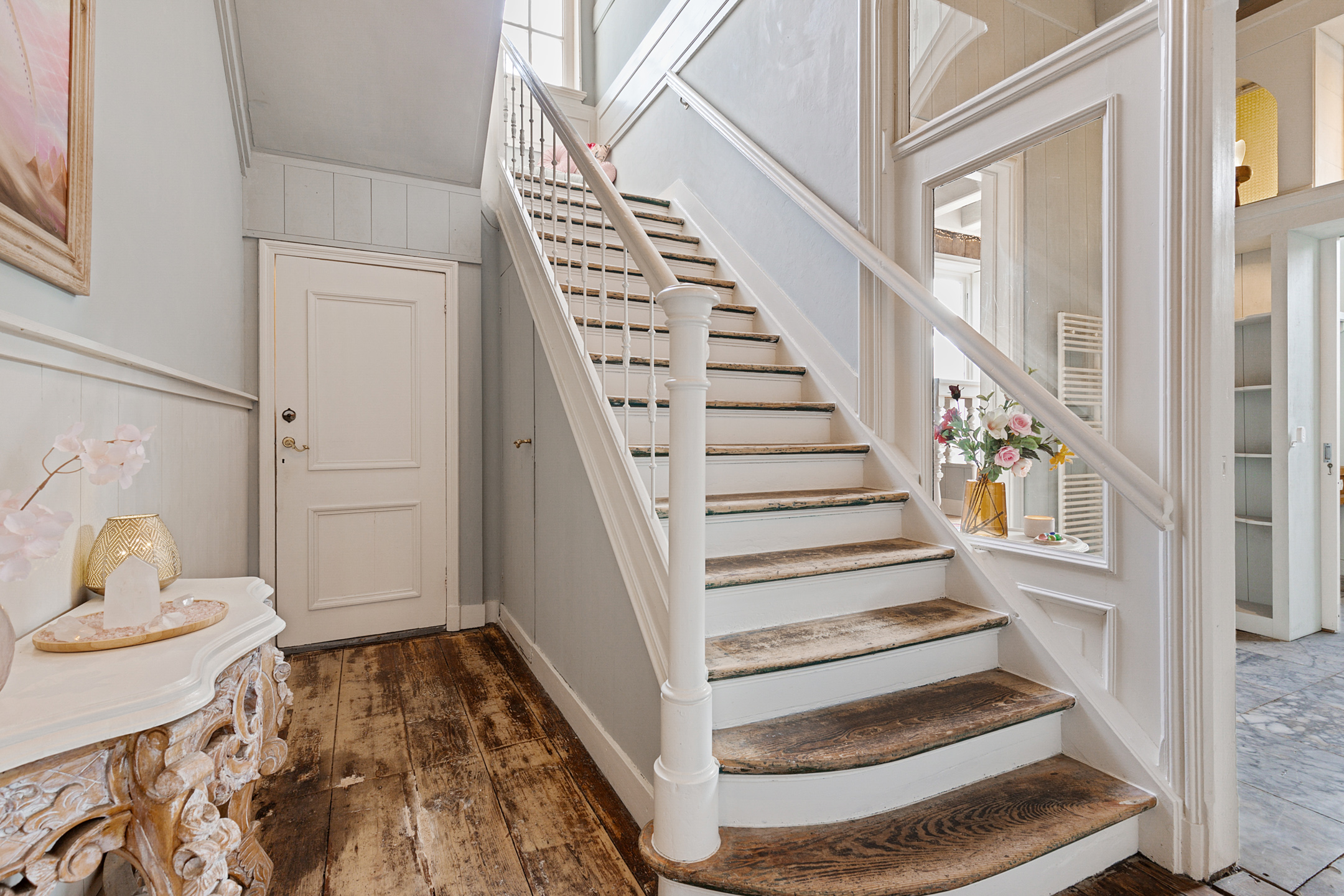 The monumental staircase leads to a generous landing on the first floor. At the front lies the atmospheric living kitchen with canal view and ample space for a large dining table and seating area.
