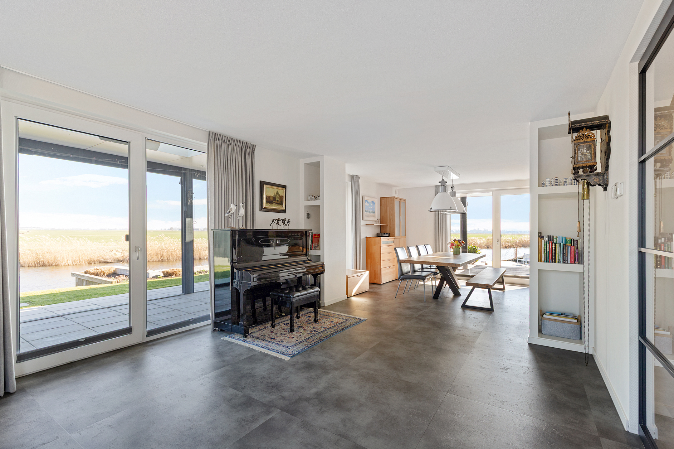 Thanks to the corner location on the water, the property enjoys a generous sun deck flanked by two luxury mooring docks, one with a swimming ladder. The enclosed stylish outdoor shower is a welcome addition for swimmers. The water in front of the property is calm, partly private, and connects directly to the Bolswardervaart.