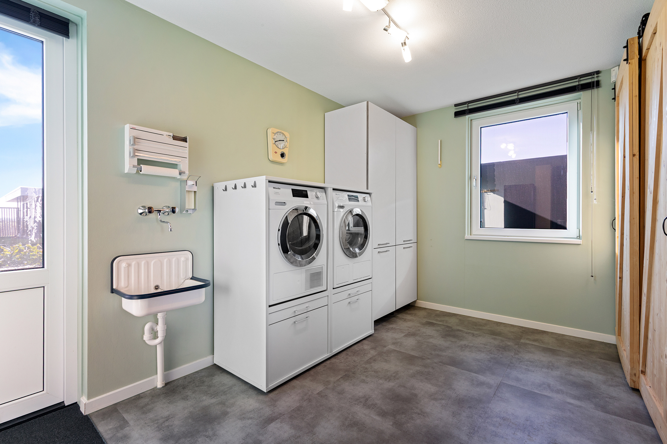 The open kitchen is generously sized and features a cooking/cleaning island and a wall of built-in cabinets with Miele appliances, including a coffee machine, combination microwave oven, combination steam oven, fridge, freezer, and plenty of storage. A hot-water cooker and an induction hob with integrated extractor are also included. The kitchen provides direct access to the spacious utility room with laundry facilities at work height, garden access, and a connection to the garage with heating room. The ground floor has a PVC floor with underfloor heating.