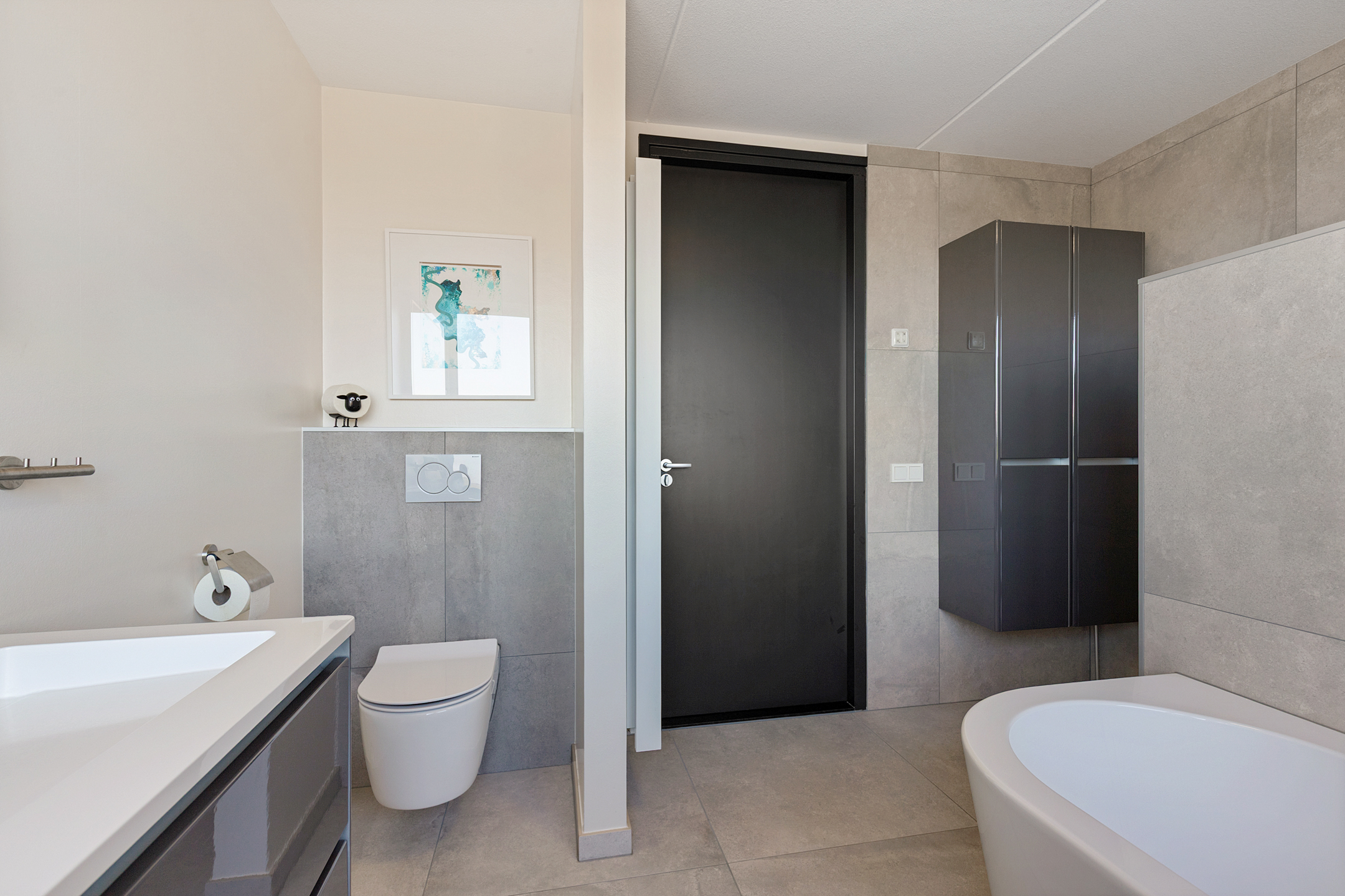 Through the covered entrance, you enter a spacious hall with staircase, guest toilet, and meter cupboard. A glass pivot door provides a beautiful sightline through the living room to the water and open fields.