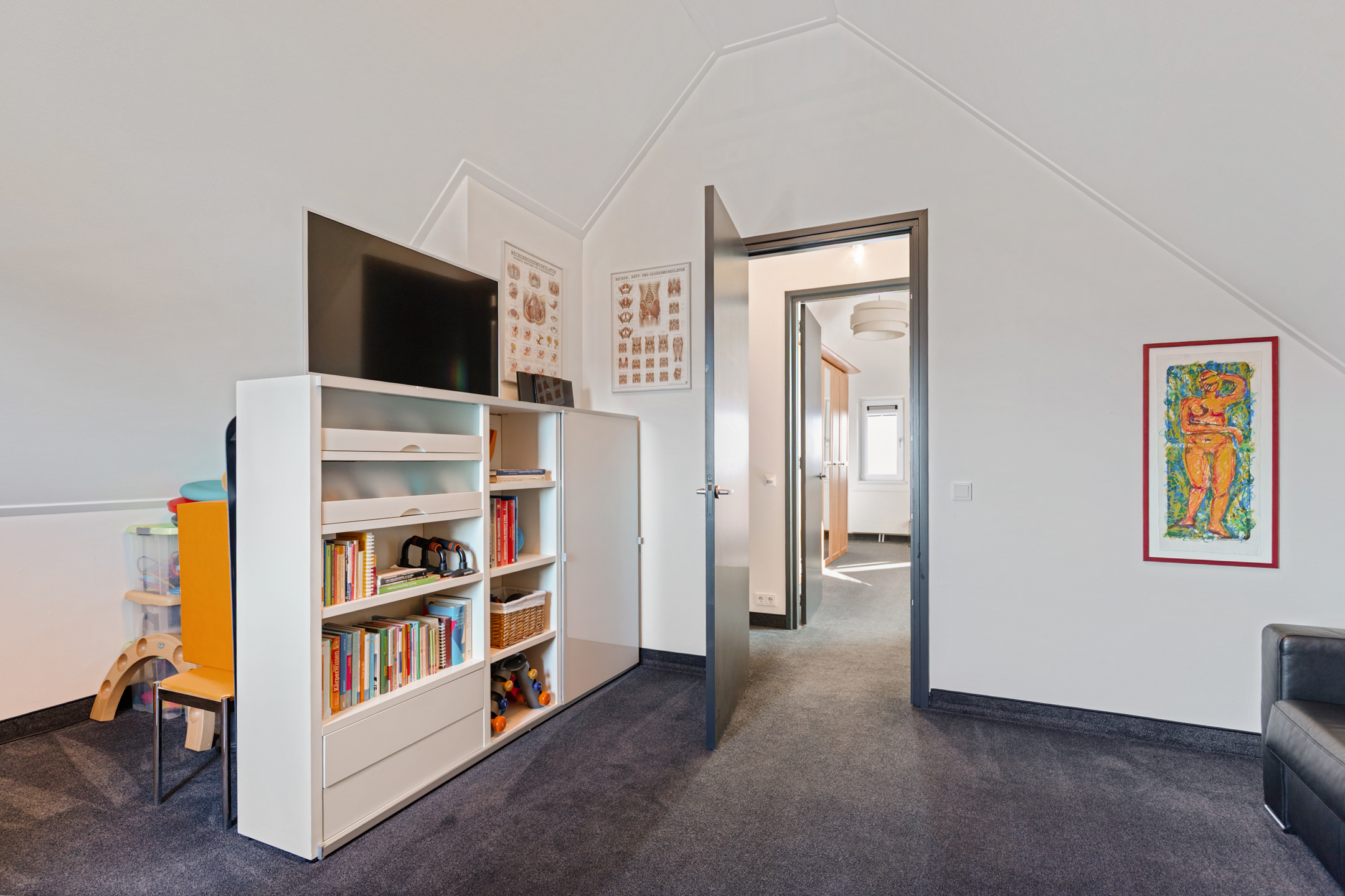 Via a fixed staircase, you reach the second floor, with two bedrooms and a large walk-in storage room (possible additional bathroom). Both rooms have high vaulted ceilings, creating a playful and spacious atmosphere. One room also features its own walk-in closet.
