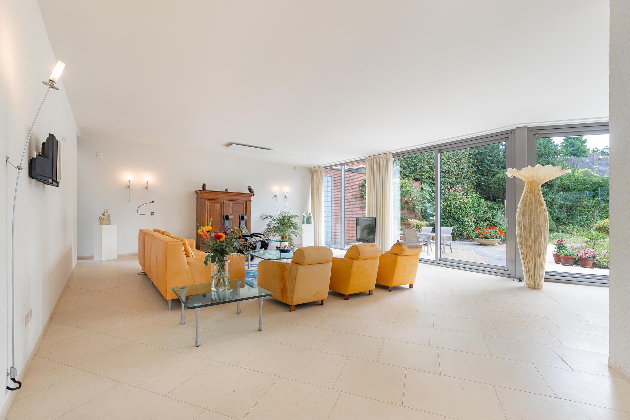 Natural stone stairs to the covered entrance. The spacious reception hall with lots of light provides access to the basement and the first floor. To the left of the hall is the meter cupboard and spacious toilet. The toilet is equipped with floating toilet and stone sink. The spacious toilet room is prepared with a walk-in shower and can serve as a bathroom if the office space is used as a bedroom. Directly adjacent to the hall is located at the front of the villa the office space with a beautiful bay window overlooking the Caumerdalschestraat. An impressive hard glass pivot door to ceiling height provides access to the beautiful living room. The over three meter high ceilings and generous glass doors at the rear of the living room feature two sliding elements.