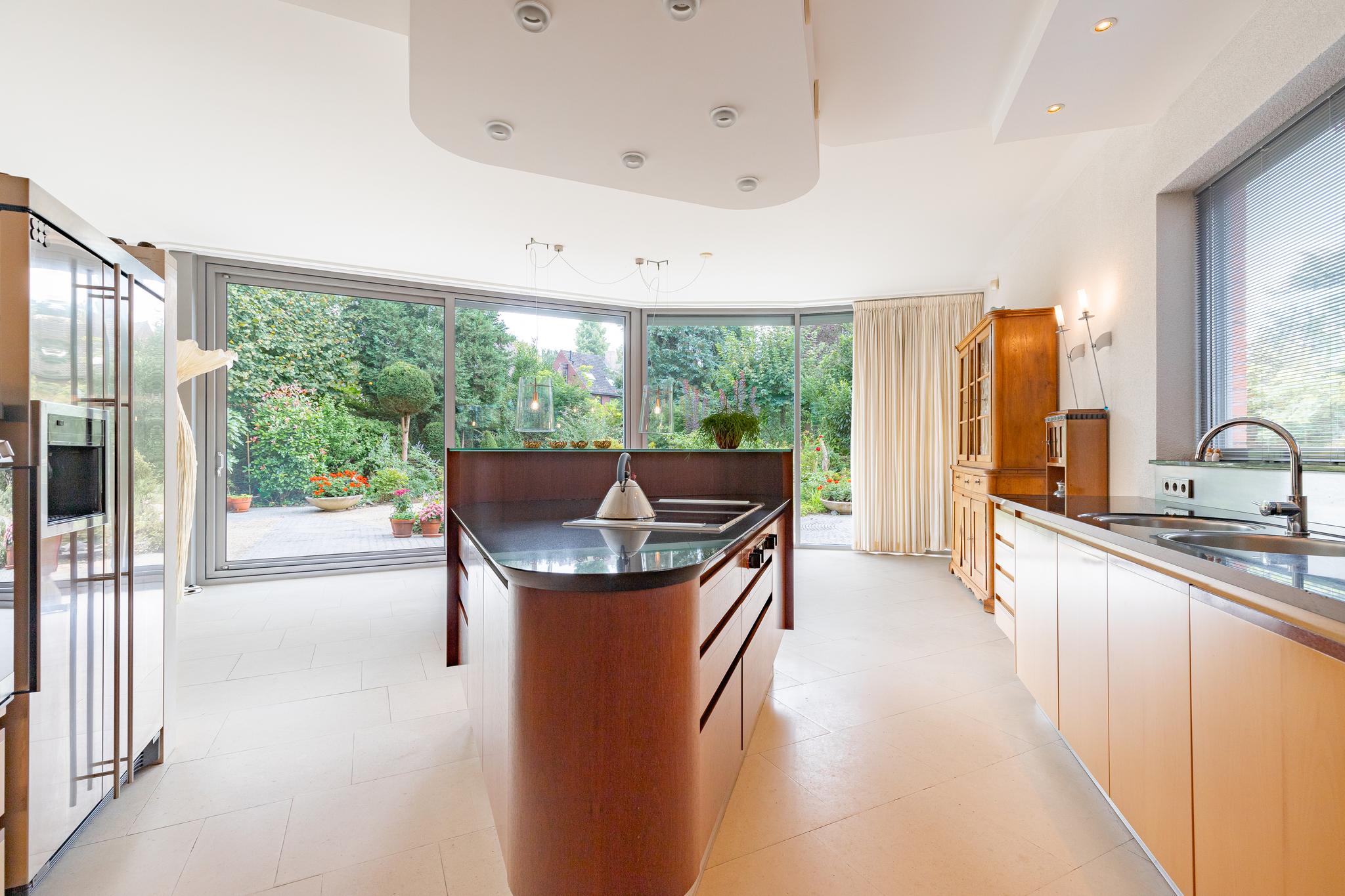 The semi-open kitchen features a beautiful kitchen installation in circular arrangement along the wall and a centrally located kitchen island. Equipped with black granite worktop and the following appliances: convection oven, ceramic hob with integrated double hood, dishwasher and fridge-freezer. The kitchen has attractive recessed lighting in the ceiling.
