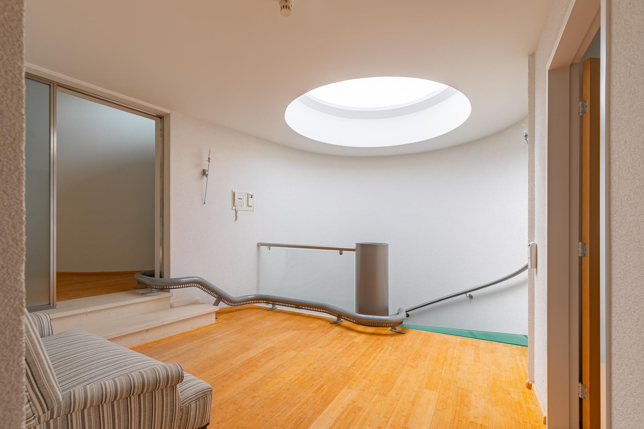 The imposing staircase is built in a circular shape and runs from the basement to the landing on the second floor. The steel tube central serves as a laundry chute and for fixing the hard glass stair treads.