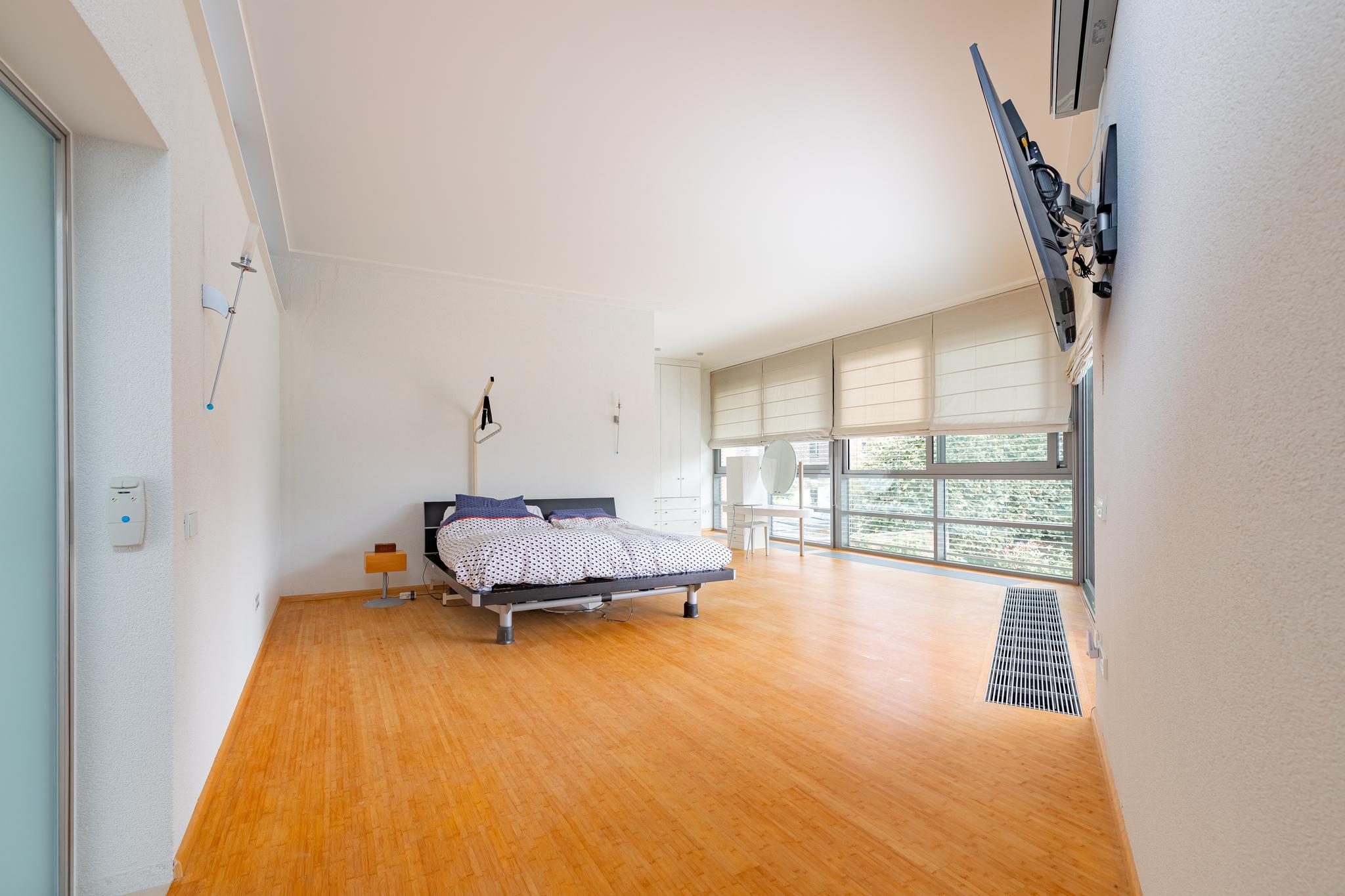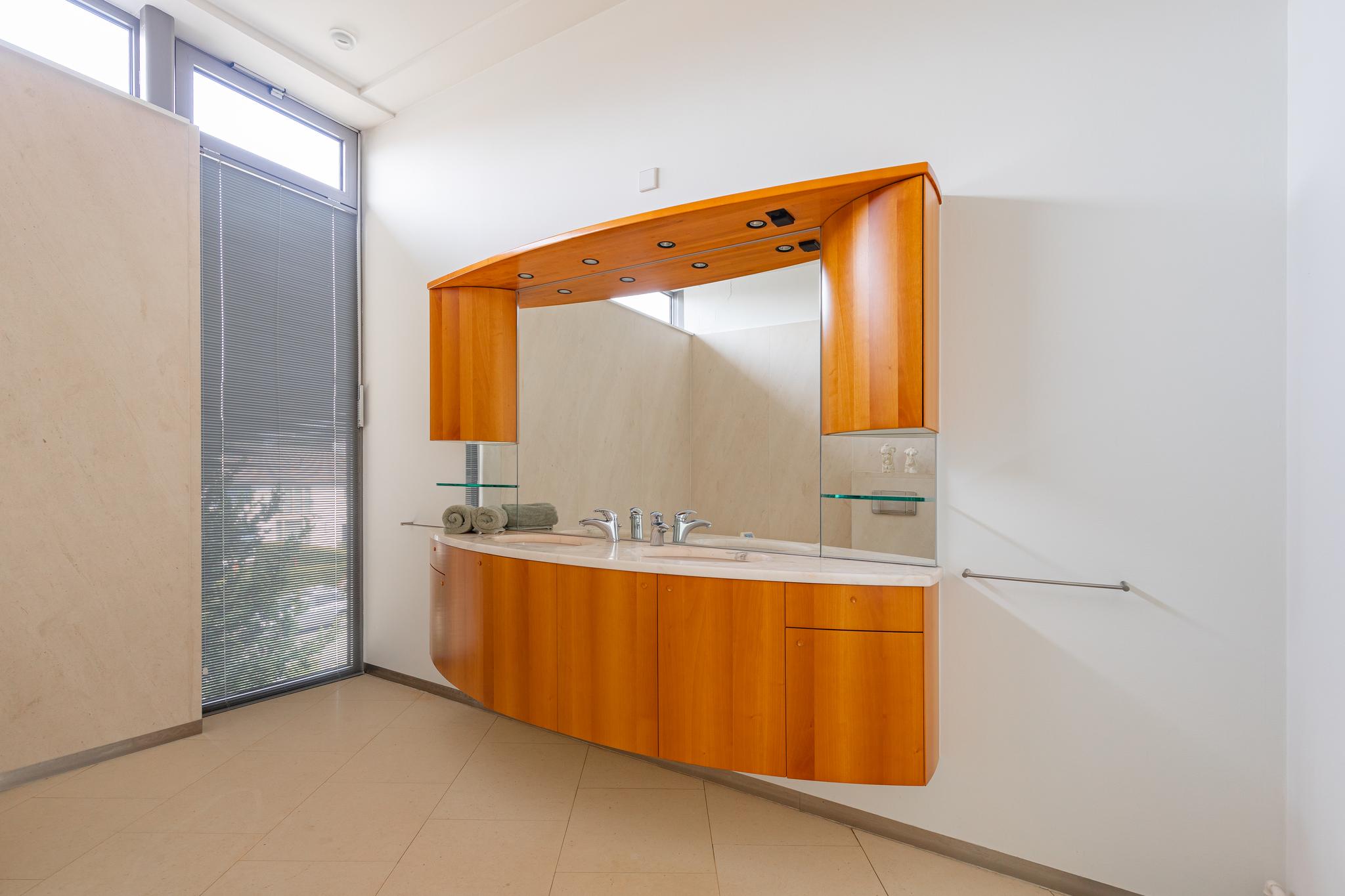 The ground floor and washrooms are finished with a beautiful 'Portuguese slate' floor finish. Aluminum window frames, master bedroom and living room are air conditioned. Underfloor heating available on the first floor and in the bathrooms. The second floor has bamboo parquet. The roof is covered with EPDM reinforced plastic and equipped with twenty solar panels. Fully equipped with aluminum window frames with insulated glass.