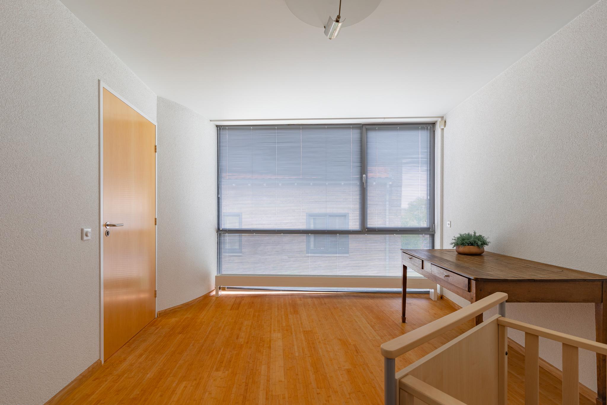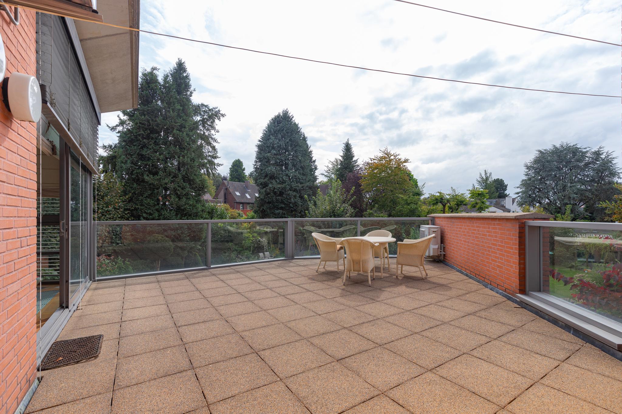 Spacious landing with optimal light through the central skylight. From the landing access to the three very spacious bedrooms and beautiful bathroom with shower, bathroom cabinet and toilet. The bathroom has a skylight. The floor and wall finishes are done in a light color of Portuguese slate. The master bedroom, with large aluminum sliding doors to the sunny terrace, offers plenty of space for both wardrobe and sleeping space. Immediately adjacent to this room is the master bathroom. Accessible through hard glass door with Jacuzzi corner bathtub, shower/steam room, floating toilet and bathroom cabinet with two sinks.