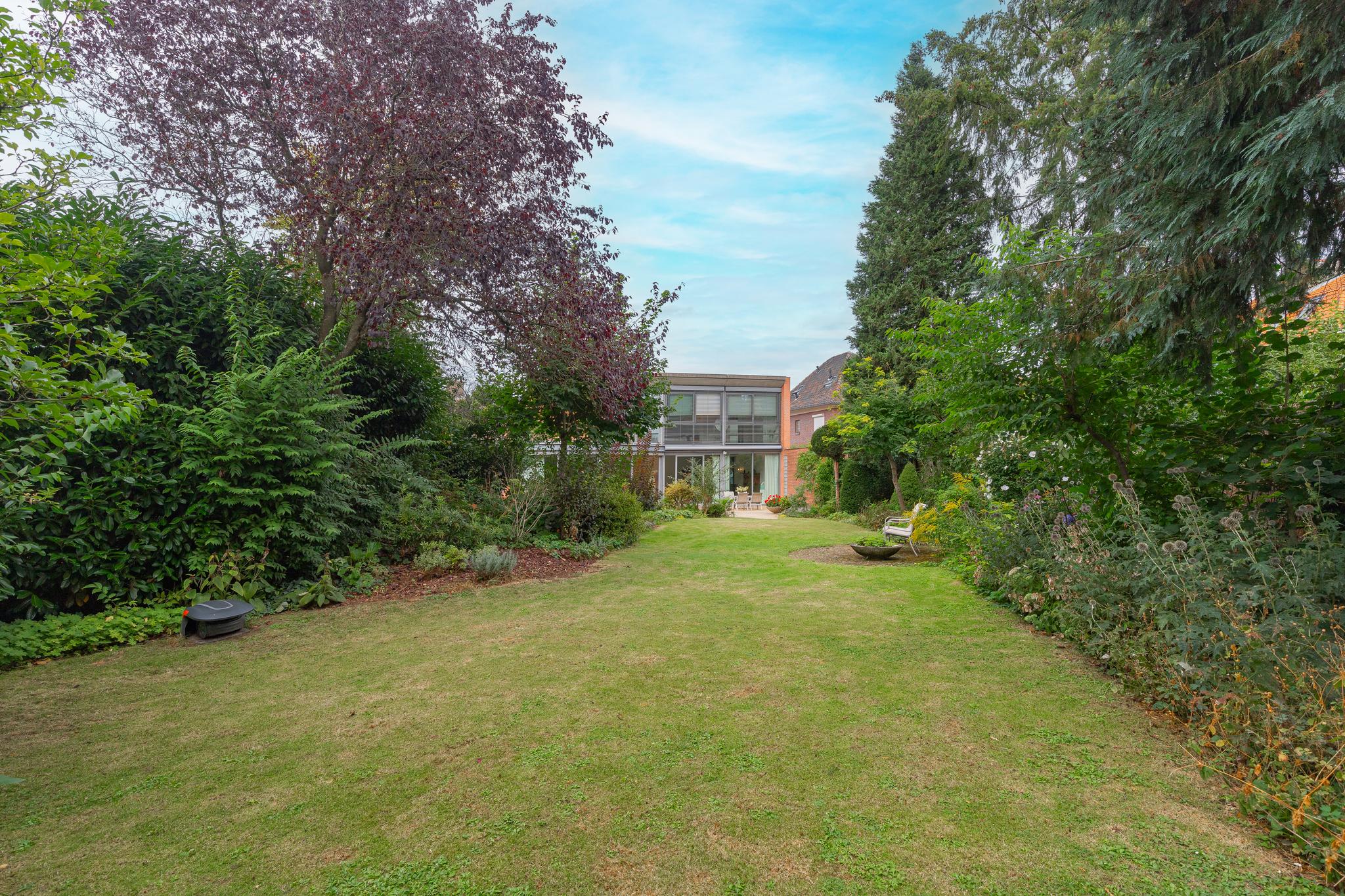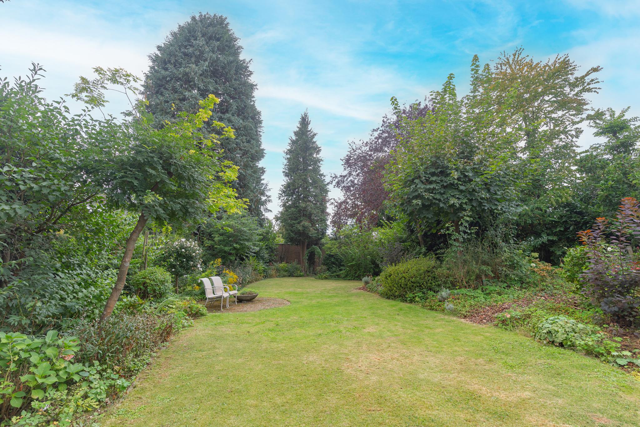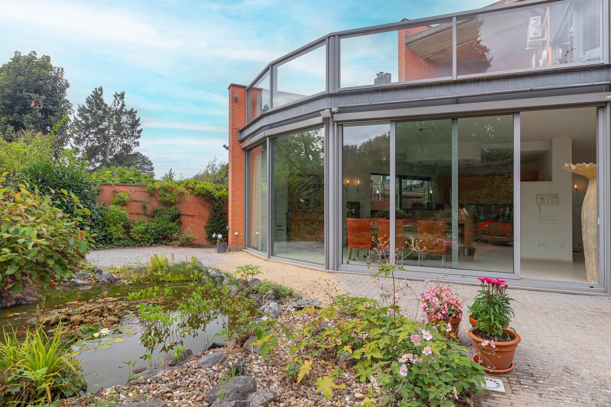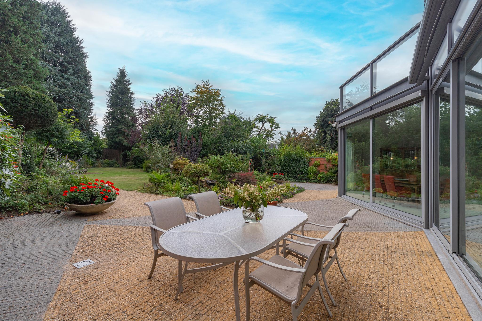 The beautifully landscaped garden with side entrance and lockable steel gate, generous terraces, a pond and fully enclosed for optimal garden enjoyment.