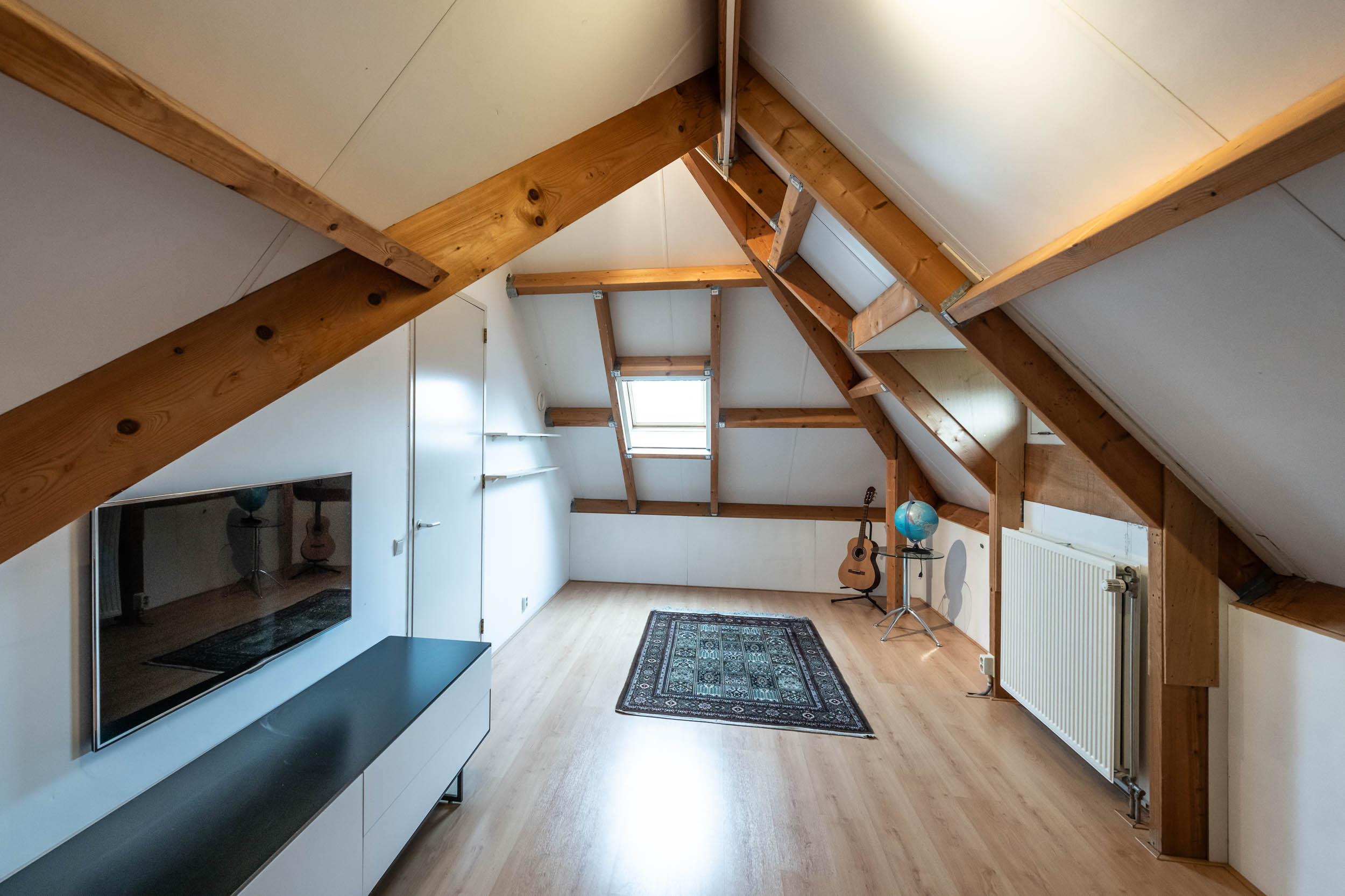 Second floor: The multifunctional attic space, currently serving as a playroom, leads to one bedroom. Both rooms have a dormer window. The bedroom provides access to a storage room.