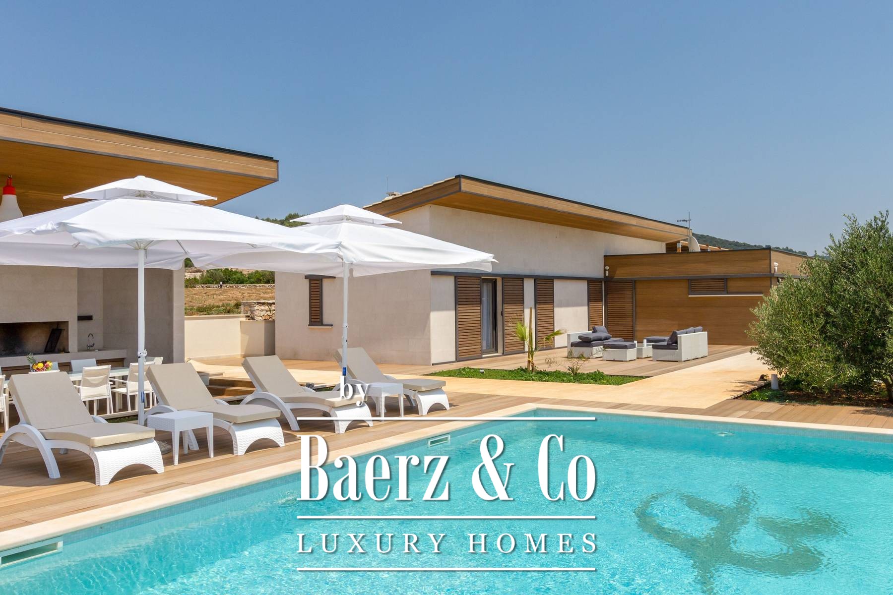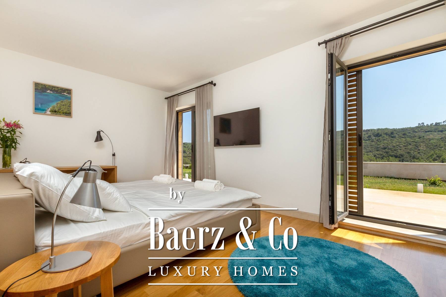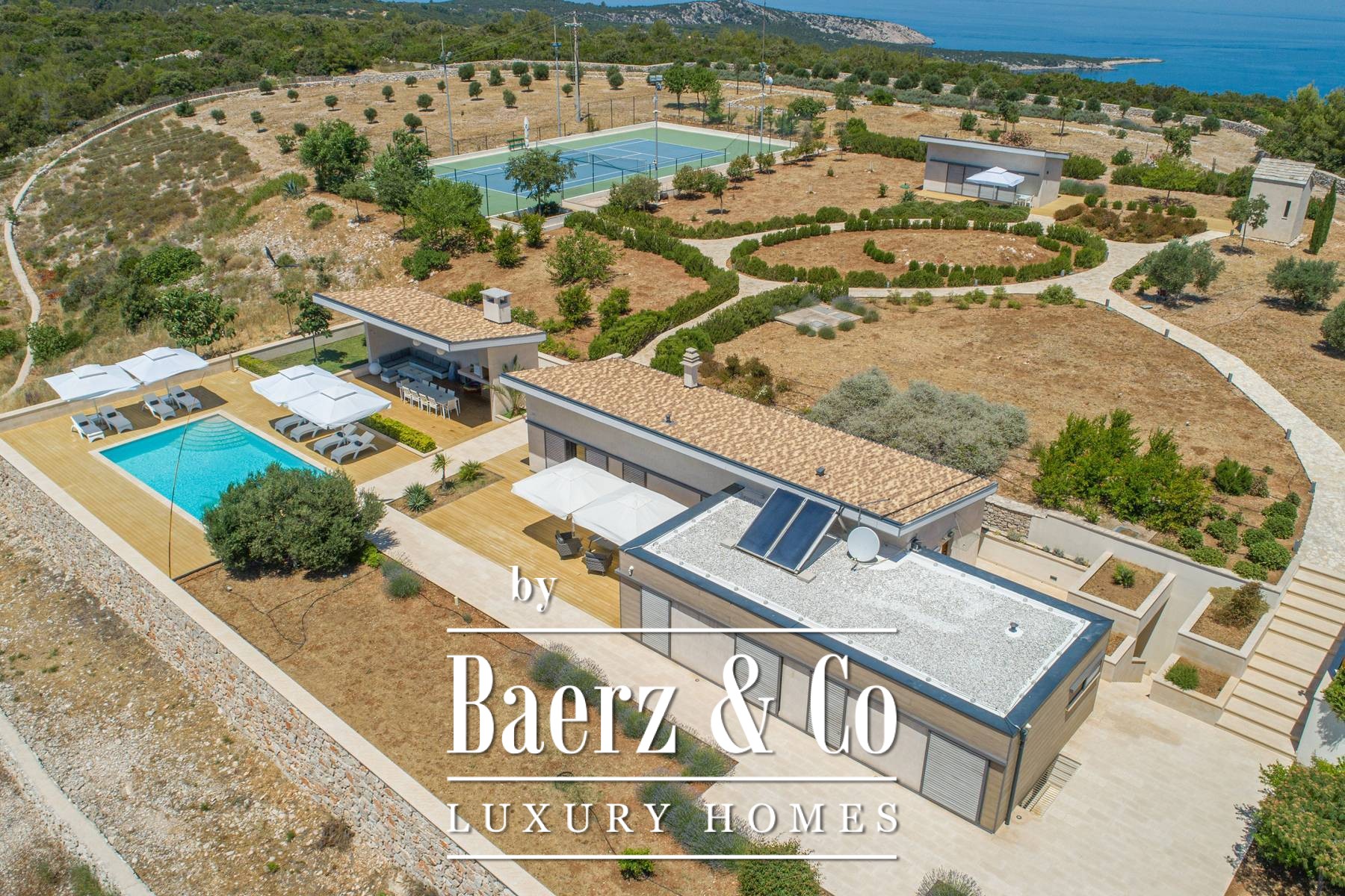 This amazing villa was built in 2014 and is located in a secluded location in the village of Zastražišće on the island of Hvar. It is positioned on a plot of 33,409 m2, while the total land area is 148,083 m2. In addition to complete peace, a view of the sea and untouched nature, it also offers an outdoor pool, tennis court, barbecue, hot tub, wine cellar, sauna and gym - in short, everything you could want for complete rest and enjoyment.The ground floor of the building consists of a living room, a kitchen with a dining room,