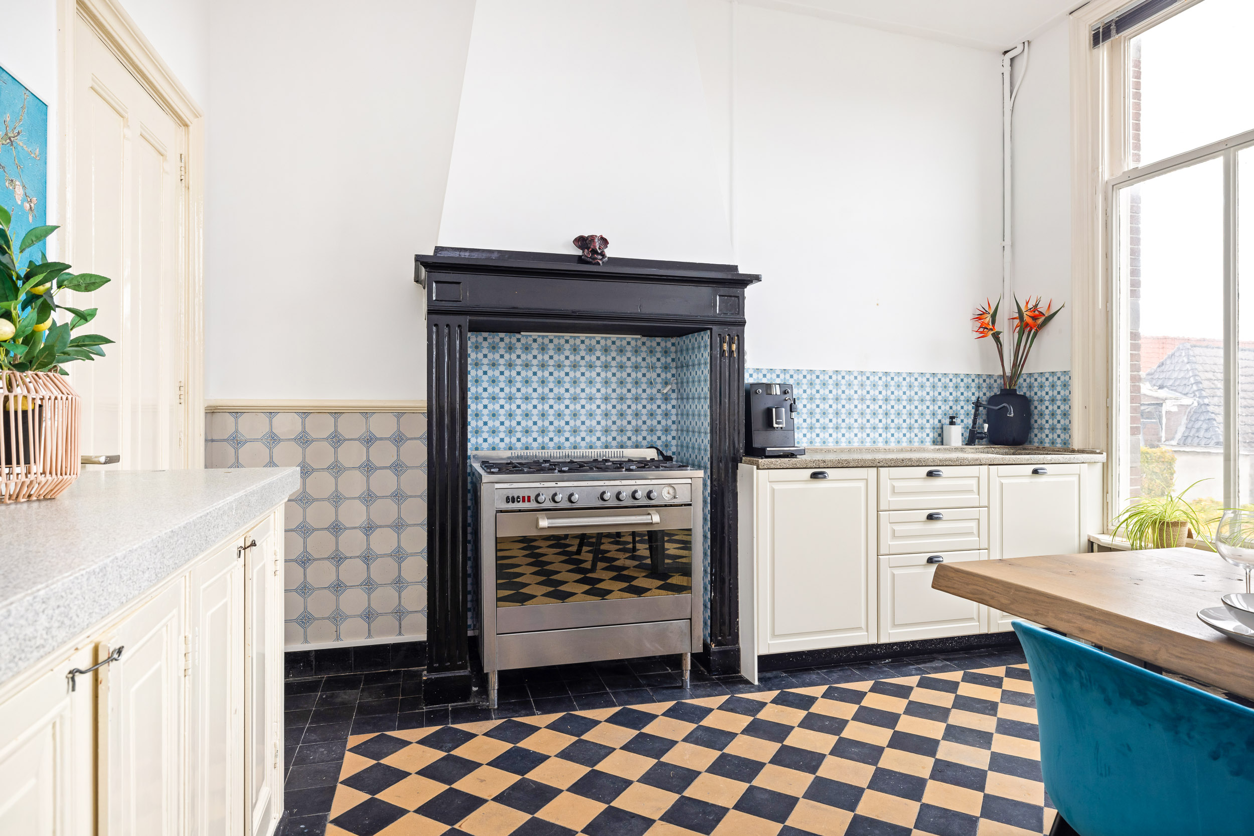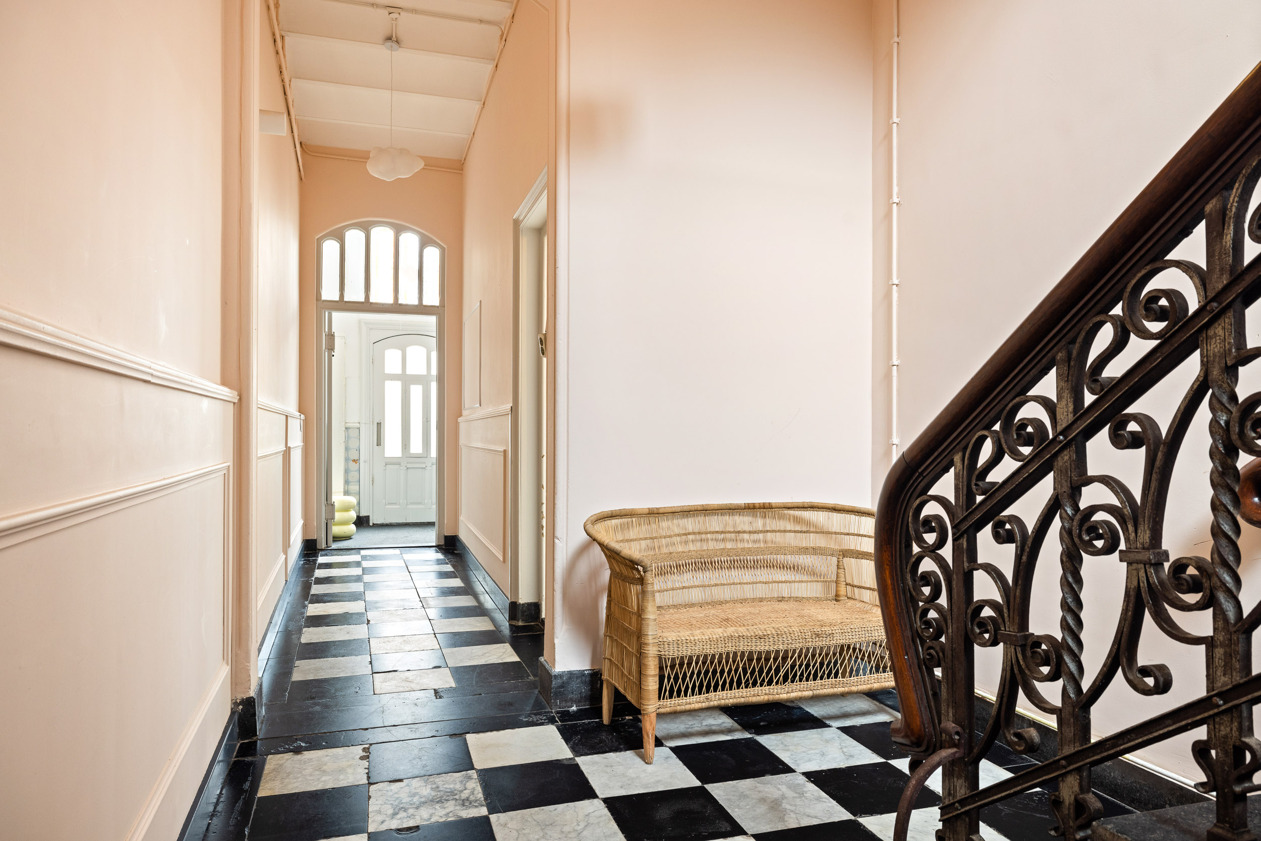 Through the right-hand entrance you enter the residential area, where the original trough vault and characteristic floor tiles instantly set the authentic tone. The charming garden room at the rear features richly decorated French doors opening onto the terrace and the deep, sun-filled patio garden with double rear access. The spacious cellar provides the perfect space for a fine wine collection.