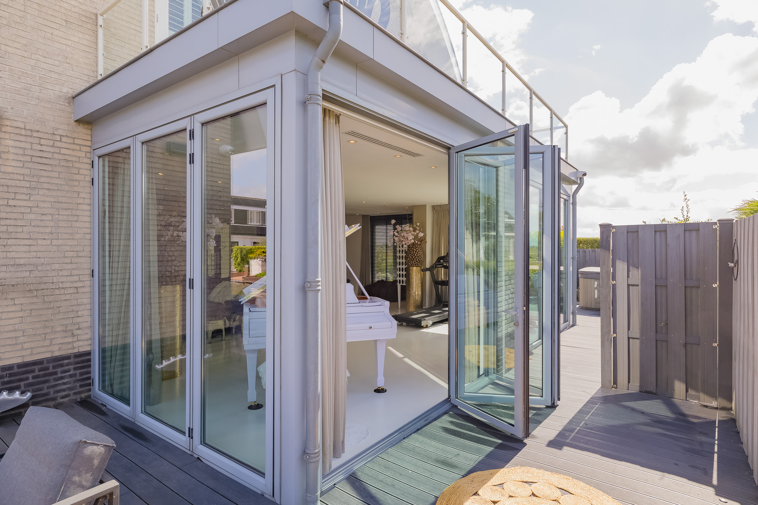 Through the bright entrance you enter a spacious, bright living room with a cozy gas fireplace. The luxurious harmonica doors not only provide a sea of light, but harmoniously connect the interior space with the spacious deck terrace on the water.