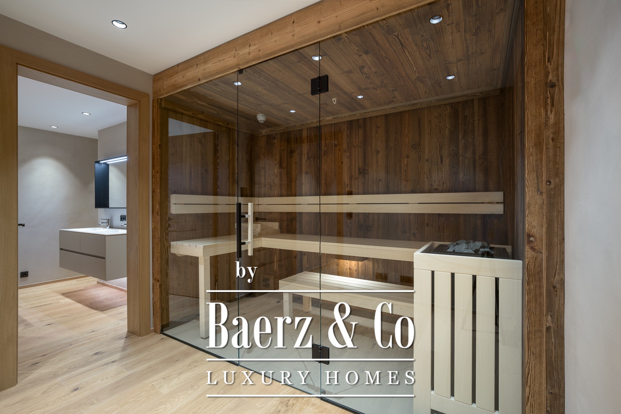 The chalets are delivered fully furnished, showcasing elegant finishes and first-class materials — from reclaimed wood beams and oak parquet flooring to Gaggenau, Miele, Bora and Liebherr appliances. Living spaces open to expansive terraces and balconies, some with private gardens, while amenities include wellness areas with sauna, fireplaces, Dornbracht bathrooms, alarm systems and advanced home technology. Layouts are tailored for comfort and guest privacy, with each unit featuring two underground or carport parking spaces and living room ventilation systems, and most offering elevator access.