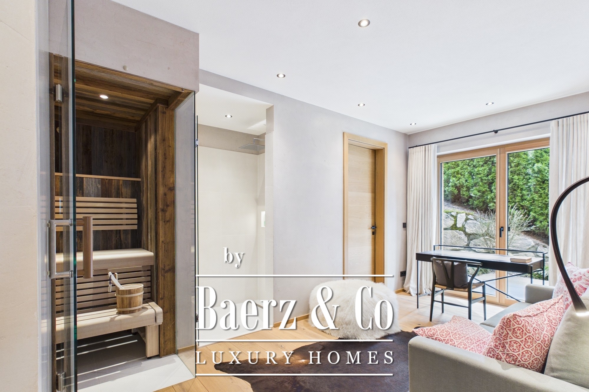 Expansive outdoor spaces are woven into the apartment’s design, including approximately 95 m² of terraces, balcony, and landscaped zones that invite quiet reflection. The living environment is enhanced by thoughtful amenities such as a fireplace, floor heating, smart home system, electric blinds, and an integrated alarm system. Additional offerings include a covered parking space with electric vehicle charging, an outdoor parking bay, and an 8.5 m² storage cellar equipped for winter sports and laundry needs.