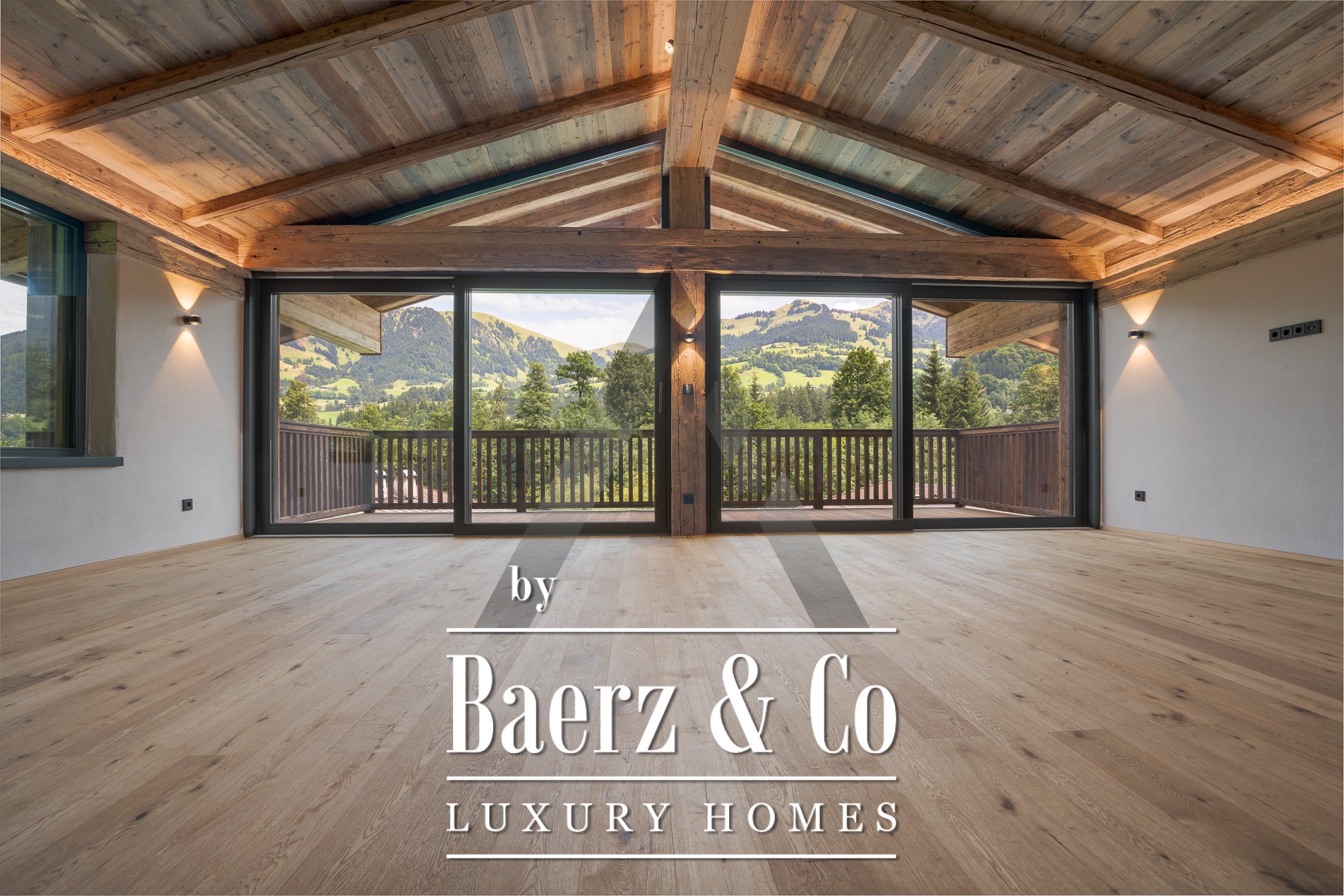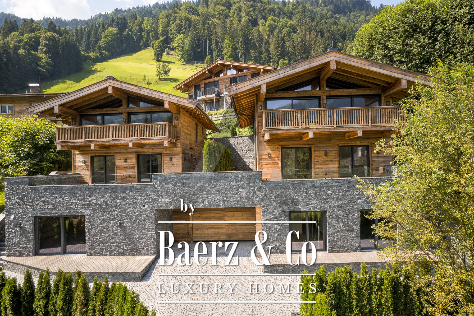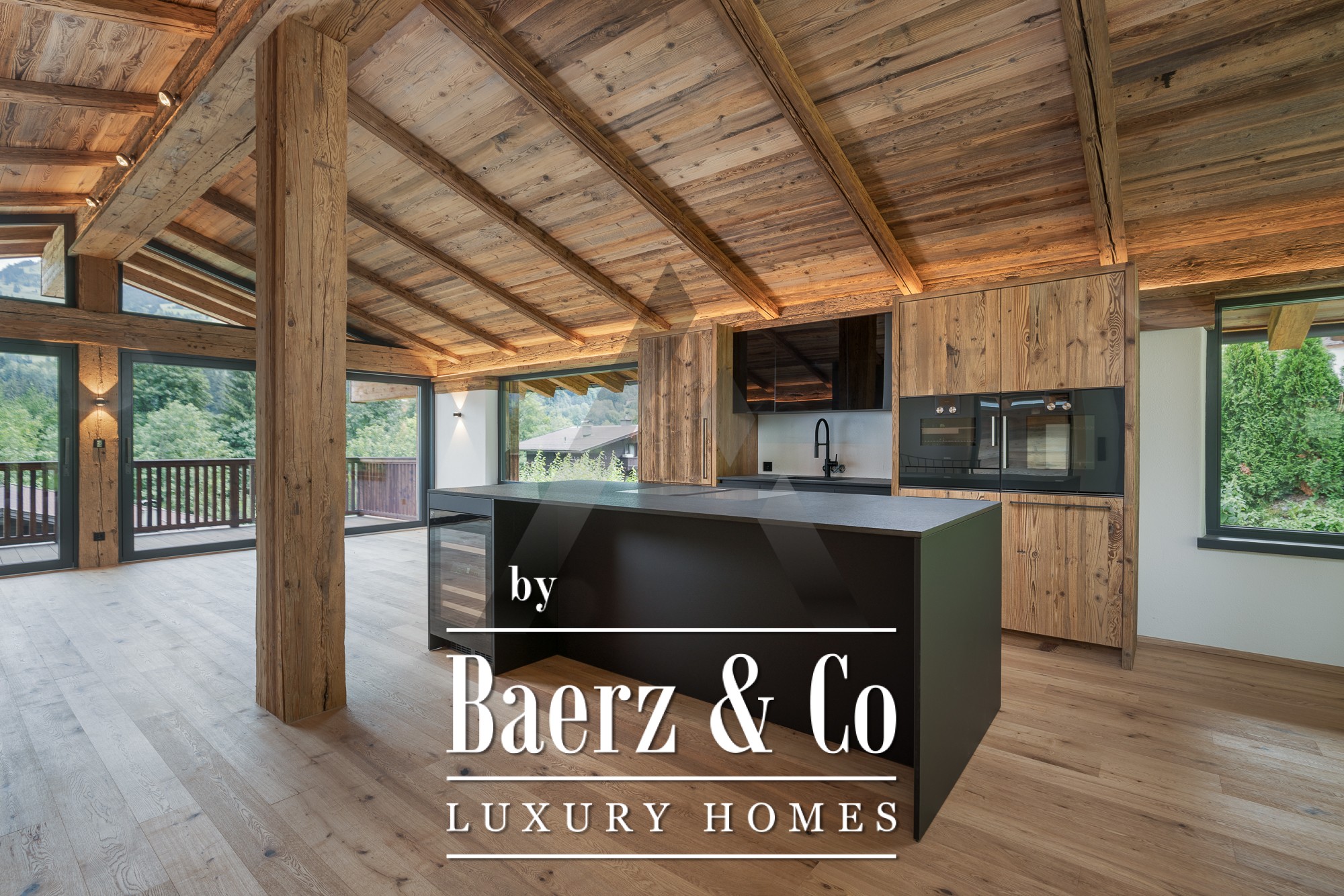 Chalet Kitzbühel with panoramic mountain views offers a modern interpretation of classic alpine design, set against the dramatic backdrop of the Kitzbühel mountains. This residence creates a personal retreat with privacy, distributed over approximately 230 m² of living area and complemented by a generous terrace of 135 m² and an easy-care garden. The property encompasses 3 bedrooms, 3 bathrooms and a guest toilet, each space characterized by traditional materials such as reclaimed wood, natural stone and solid wooden doors.