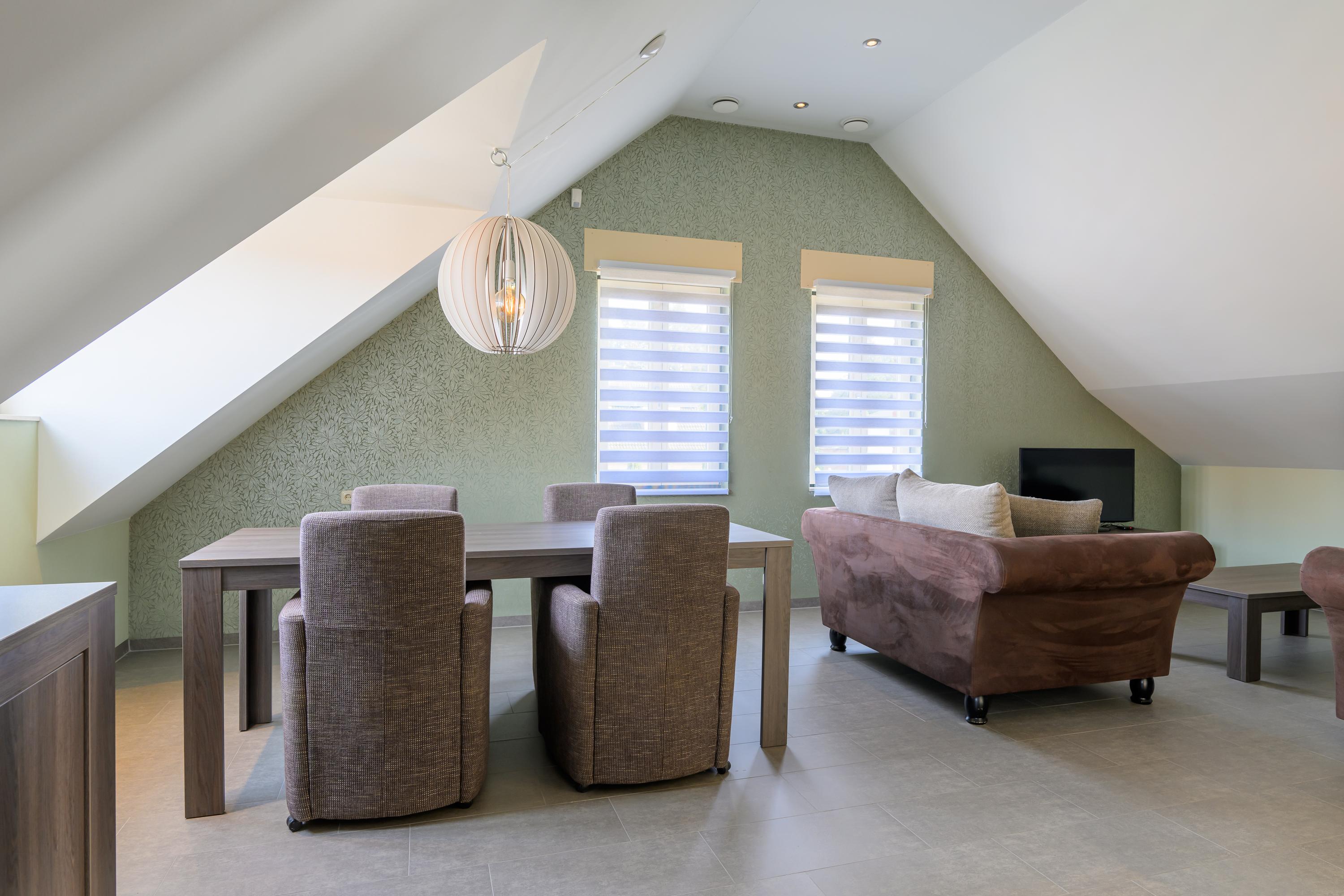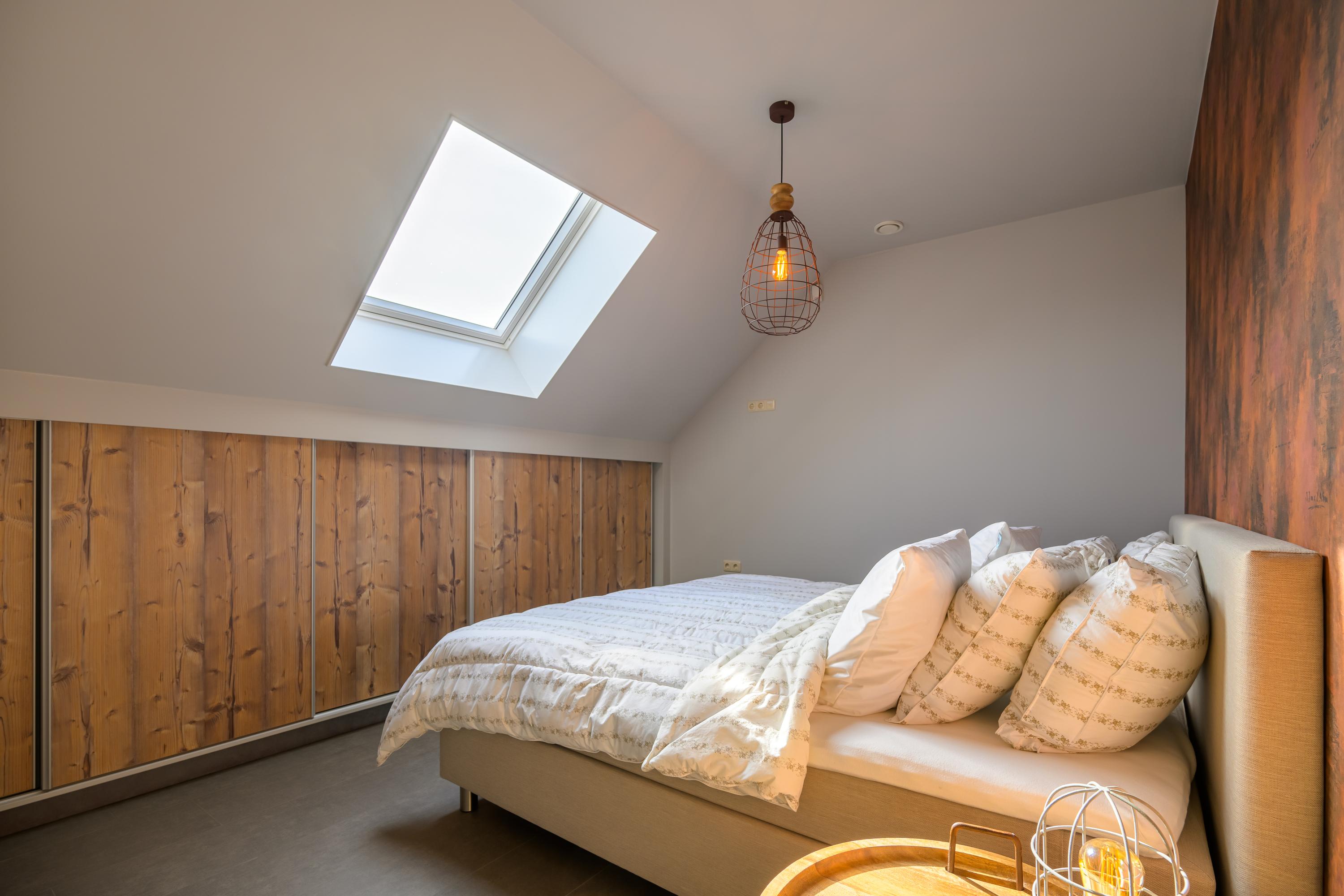 De eerste verdieping is toegankelijk via zowel de binnen- als de buitentrap. Ook hier is de ruimte verdeeld in twee delen. Het ene deel bevat een royale overloop, technische ruimte, zeer ruime slaapkamer en een bergzolder. Aan de andere kant bevindt zich een zelfstandig appartement, compleet uitgerust voor autonoom wonen. Via de buitentrap komen we binnen in een hal met toilet. Vanuit hier bereiken we de royale woon-/eetkamer. Deze is voorzien van een luxe keuken. De badkamer is uitgerust met: een wastafel, inloopdouche en witgoedaansluitingen. De slaapkamer heeft een handige schuifdeurenkast. Ook deze verdieping beschikt over vloerverwarming en profiteert van veel daglicht door de dakramen.