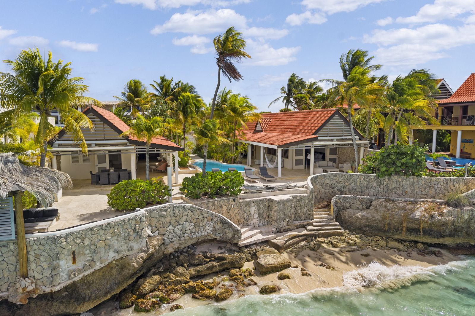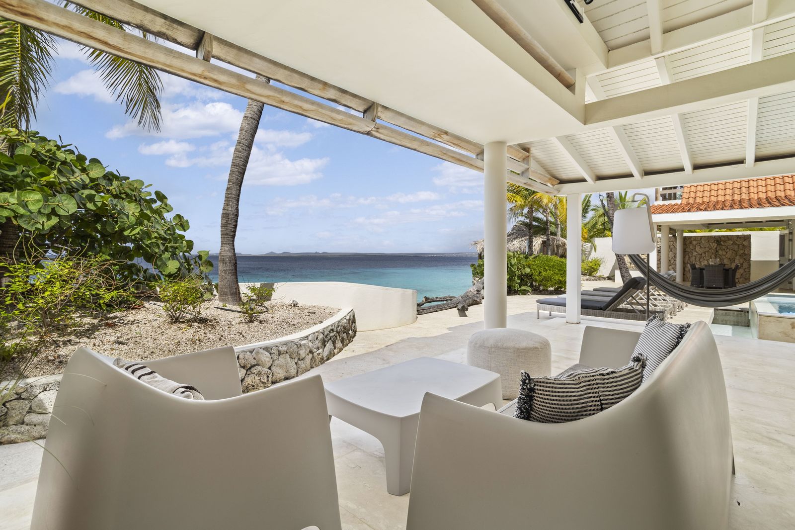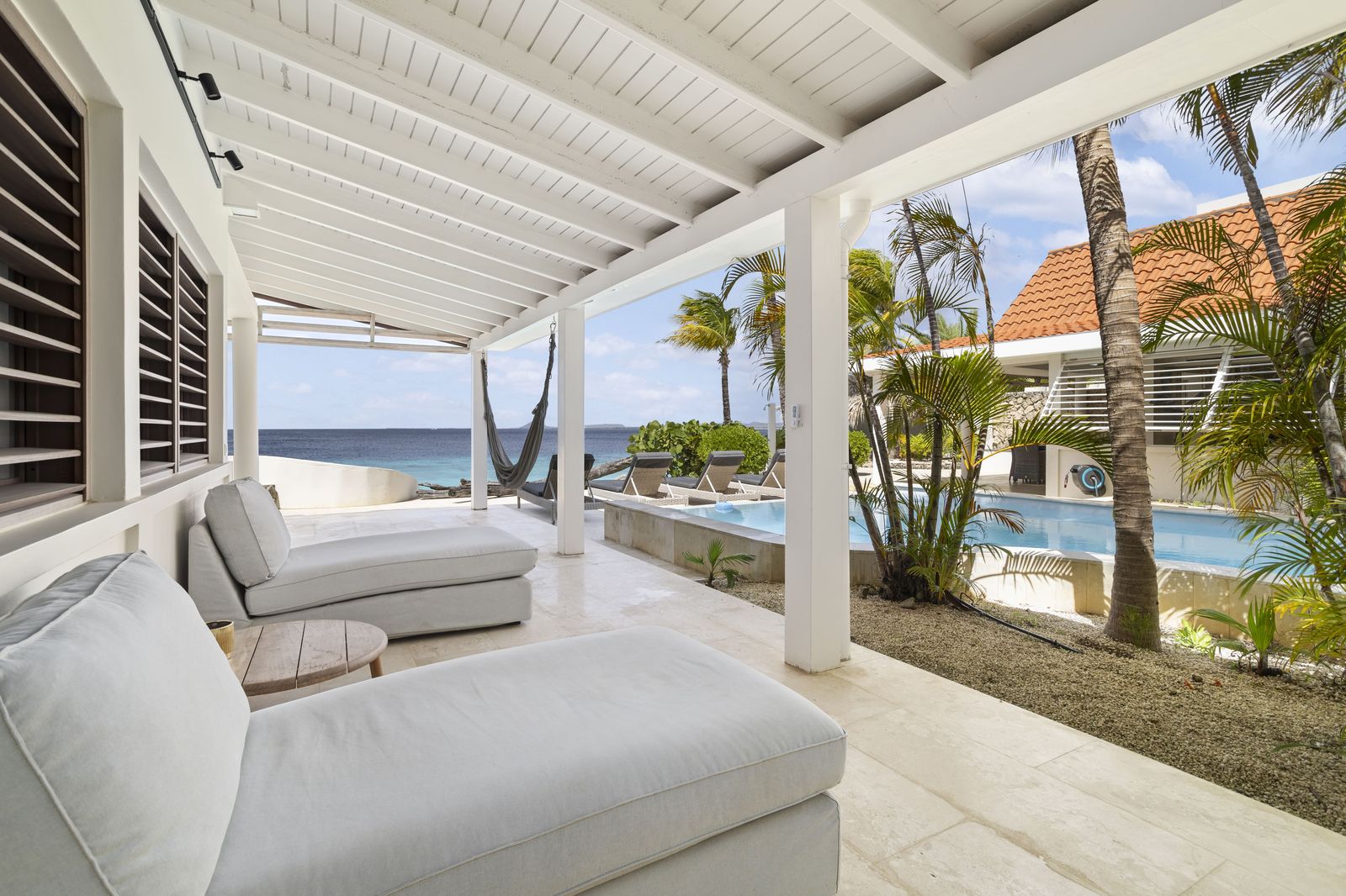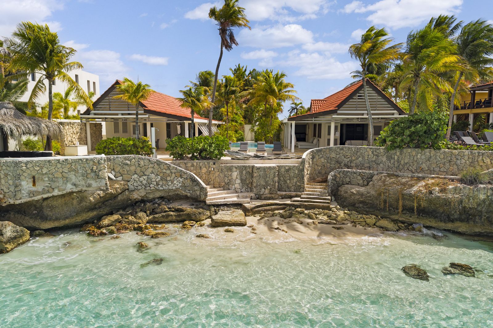 Kas Popchi boasts a beautiful private pool, its own beach, and direct access to the ocean. There are several inviting outdoor areas and a luxurious outdoor shower, perfect for relaxing and fully enjoying the Caribbean sun and stunning surroundings.