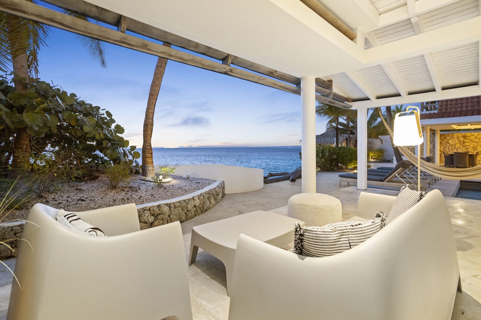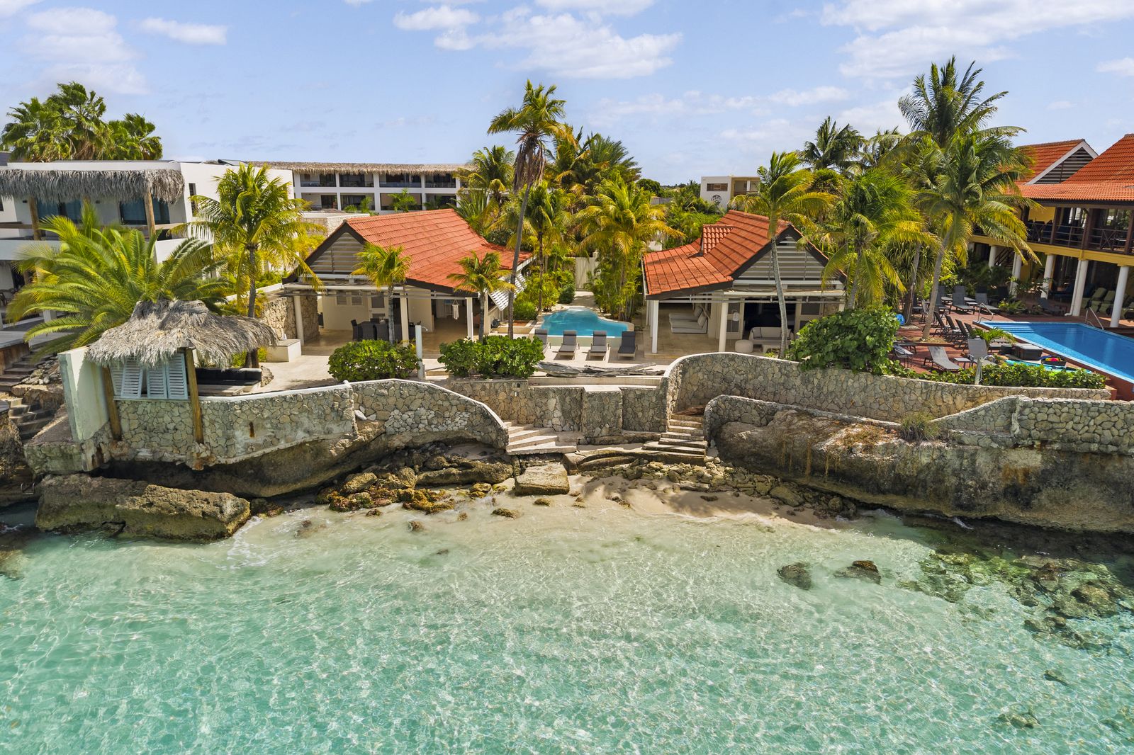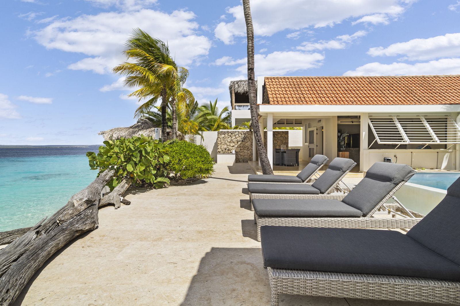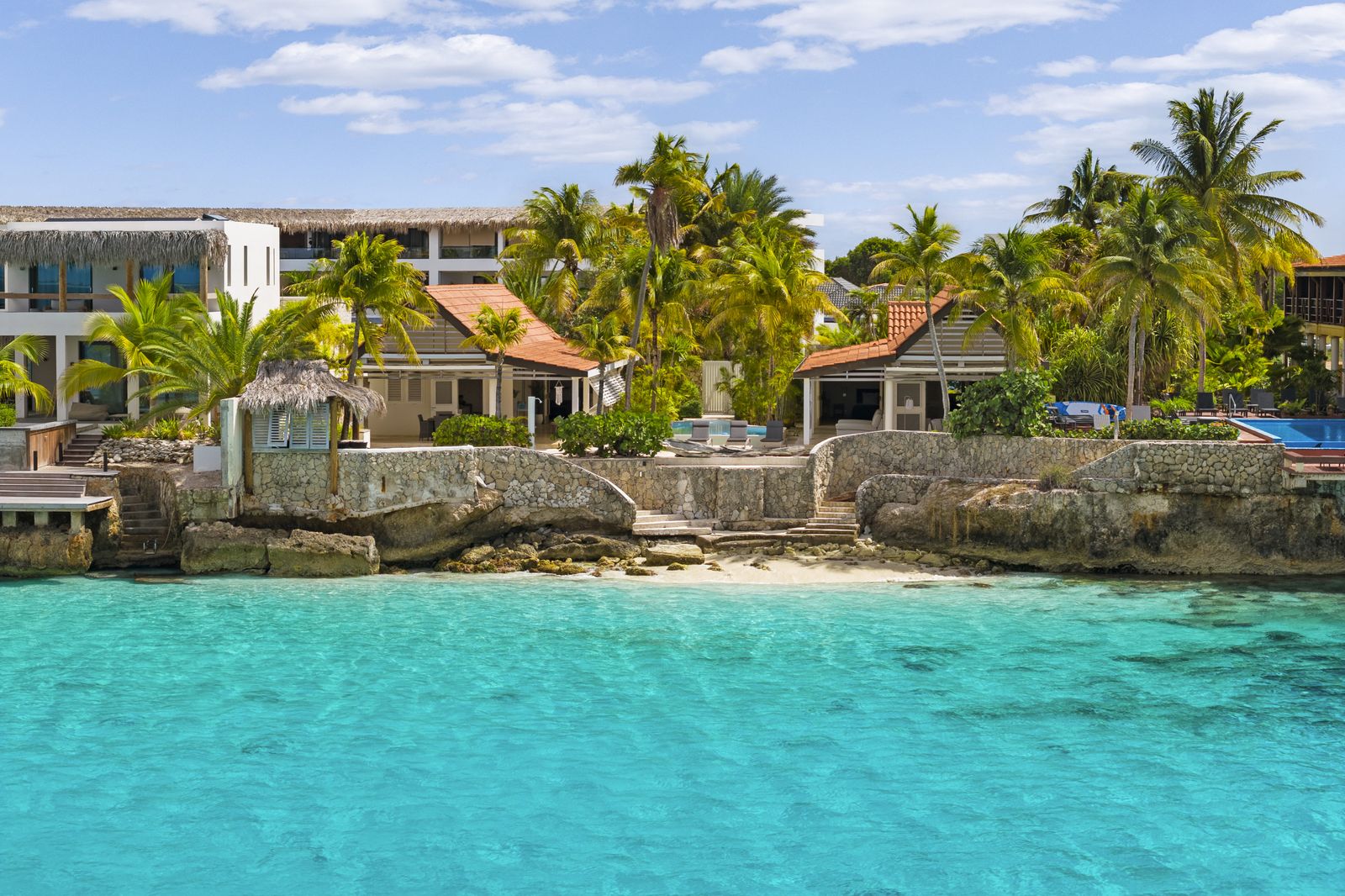 Kas Popchi boasts a beautiful private pool, its own beach, and direct access to the ocean. There are several inviting outdoor areas and a luxurious outdoor shower, perfect for relaxing and fully enjoying the Caribbean sun and stunning surroundings.