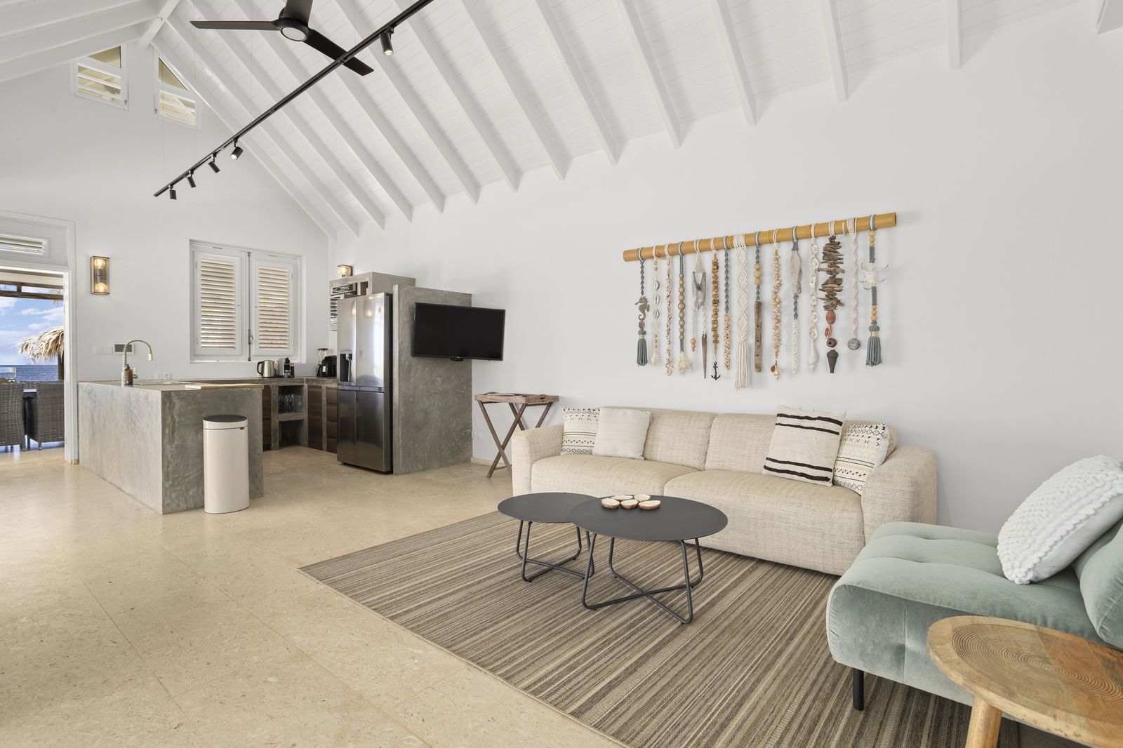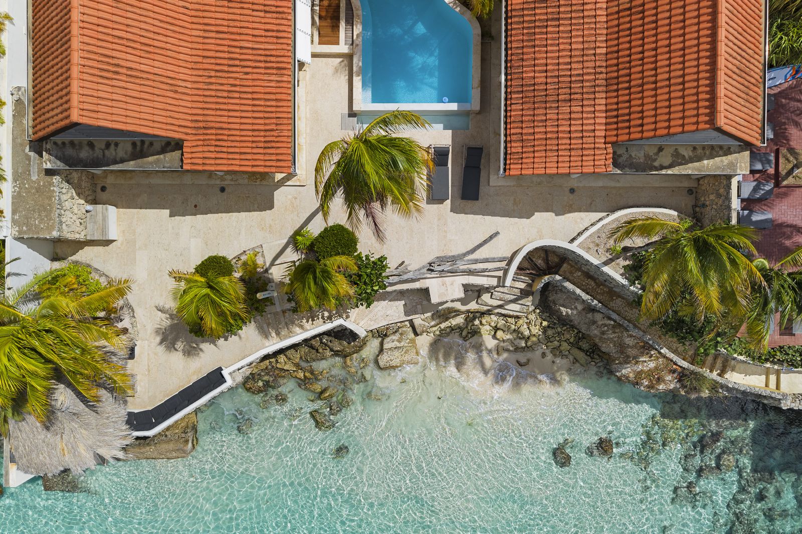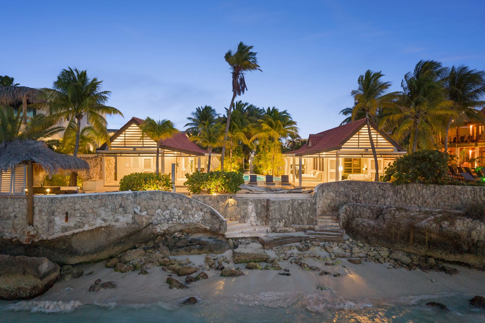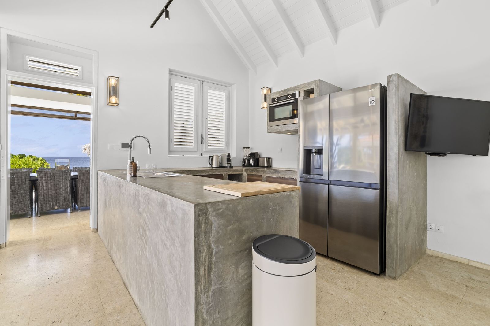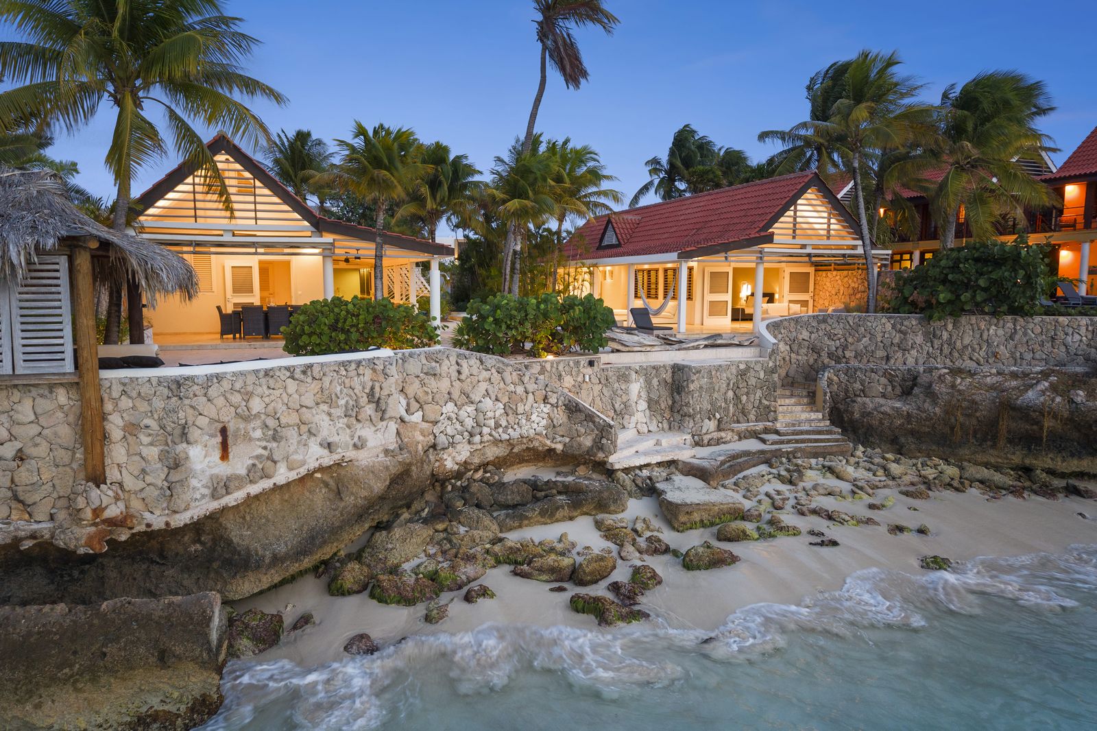 Kas Popchi boasts a beautiful private pool, its own beach, and direct access to the ocean. There are several inviting outdoor areas and a luxurious outdoor shower, perfect for relaxing and fully enjoying the Caribbean sun and stunning surroundings.