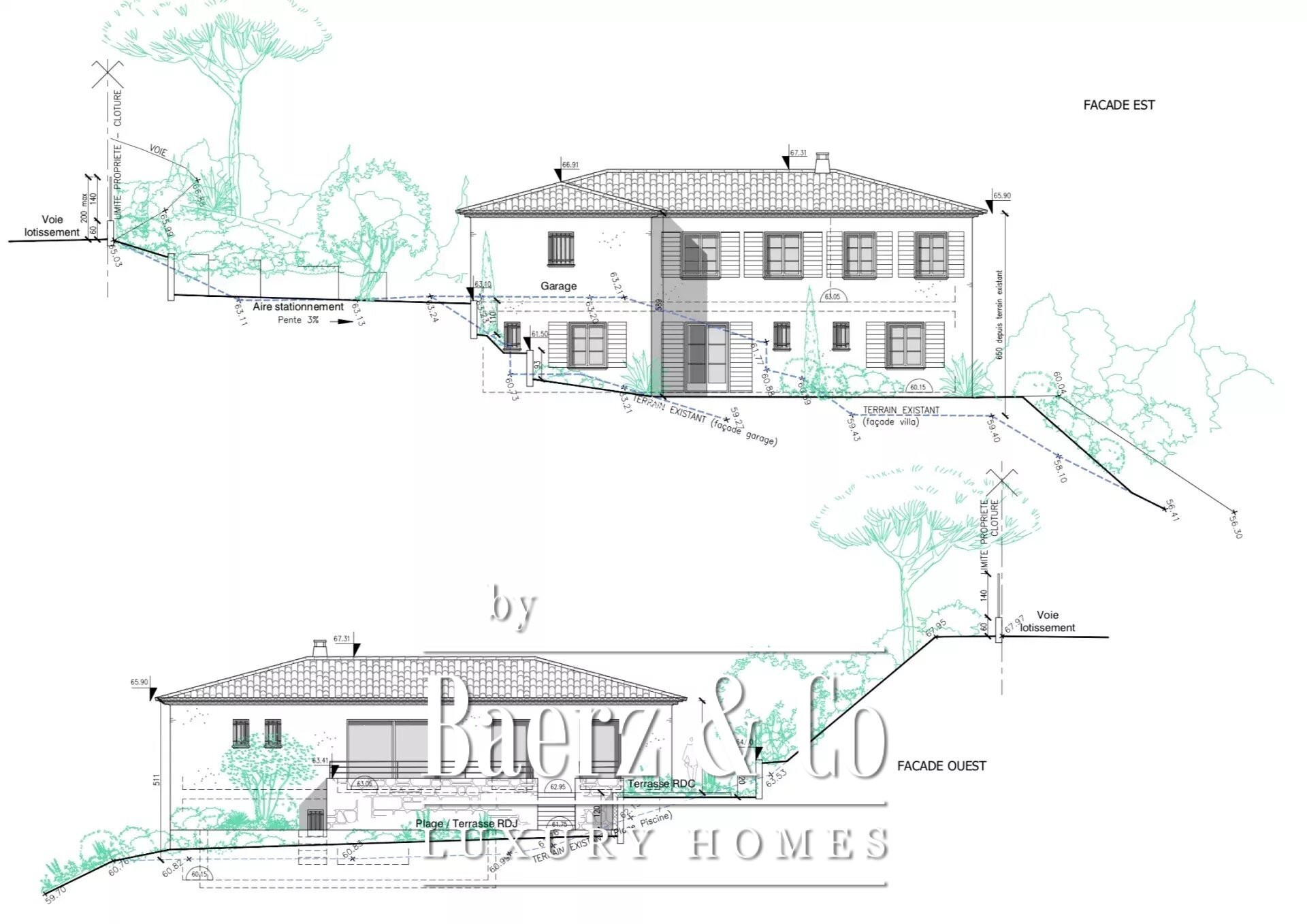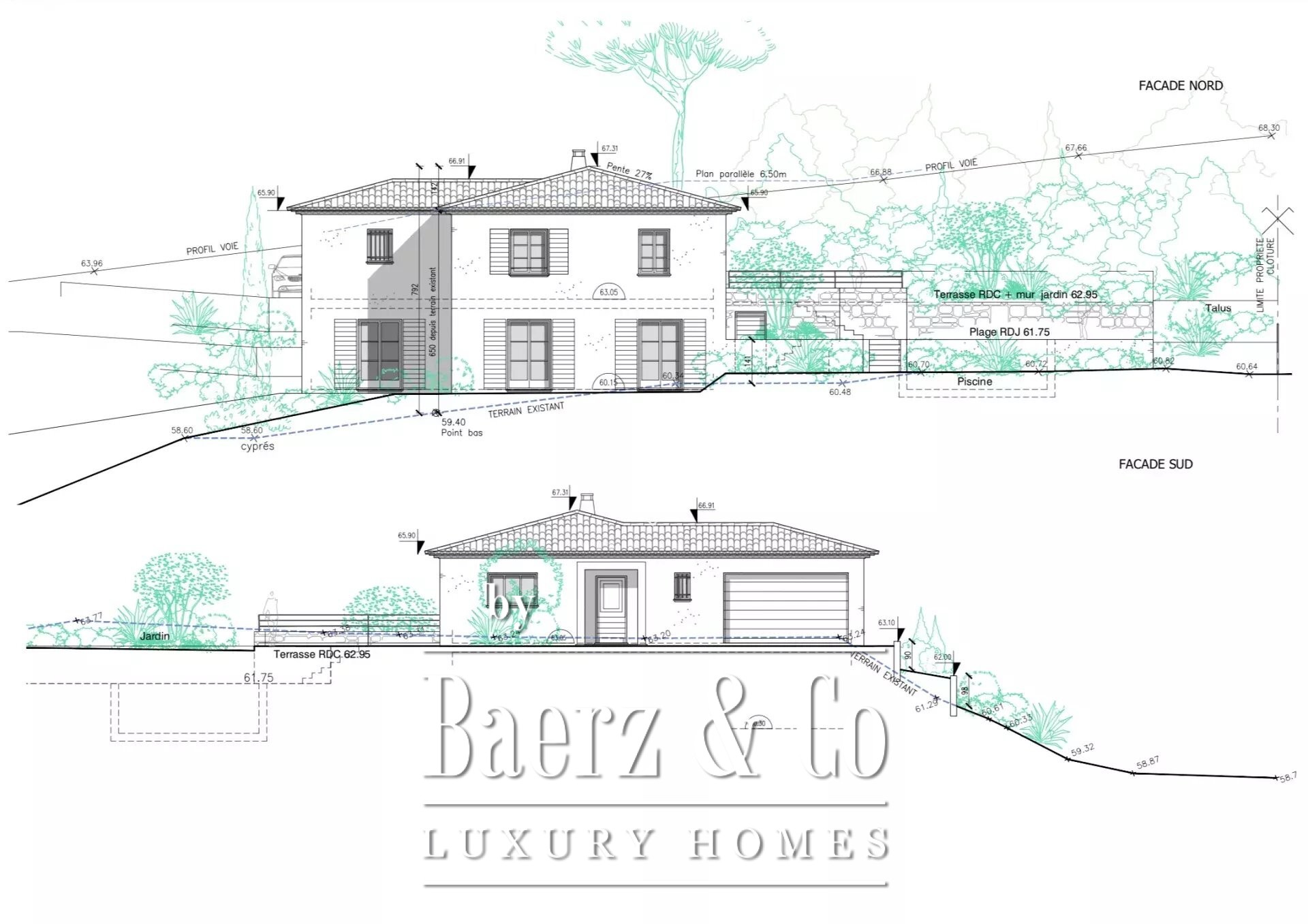 Two fully approved permits invite transformation, enabling either a 241 m² home in dual-level configuration with five bedrooms or a refined alternative layout, both attuned to the Mediterranean landscape. Living spaces, whether for elegant gatherings or tranquil retreat, open onto west-facing terraces that embrace the last of the day's light. The planned 9x4.5 m pool sits within a landscaped garden, framed by unobstructed views across Gigaro’s hills and a protected forest zone.