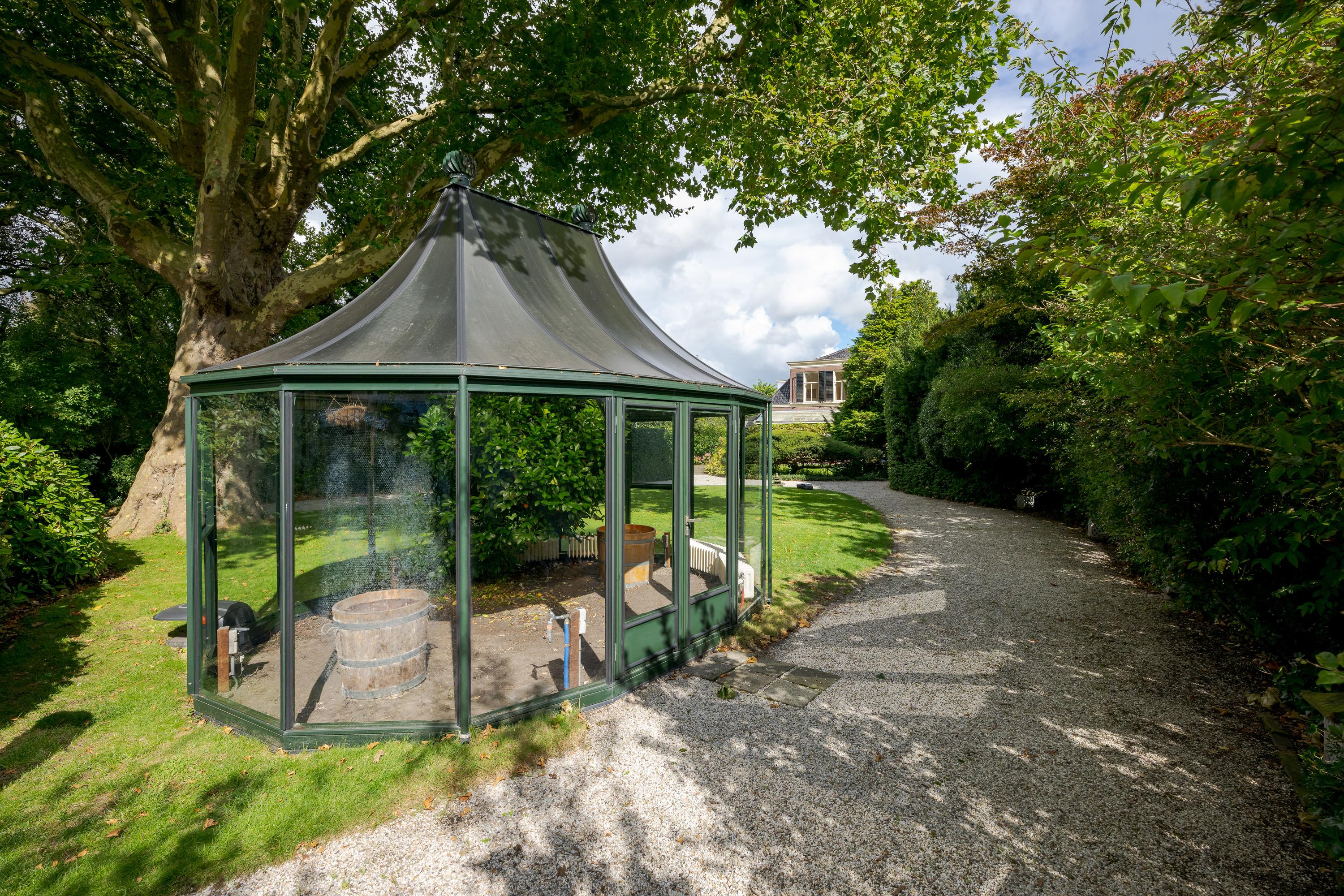 After you have closed the electric gate of the gatehouse behind you, you immediately imagine yourself in a different environment and the peace comes over you. A central lawn with a centuries-old plane tree (1820) forms the heart of the courtyard. Special is the greenhouse with a mandarin tree next to this tree, where you can still sit on a sunny day in the middle of winter. Both to the left and right of the lawn is a gravel path, where you can drive directly to the house if you want. There are now a few corners and seats where you can enjoy the sun or shade at different times of the day. A little further on is a pond that is equipped with a water supply system with Rhine water, with the entrance to the house behind it, flanked on the left by a veranda and on the right by a sunny conservatory. Here too, you can enjoy this large garden all year round.