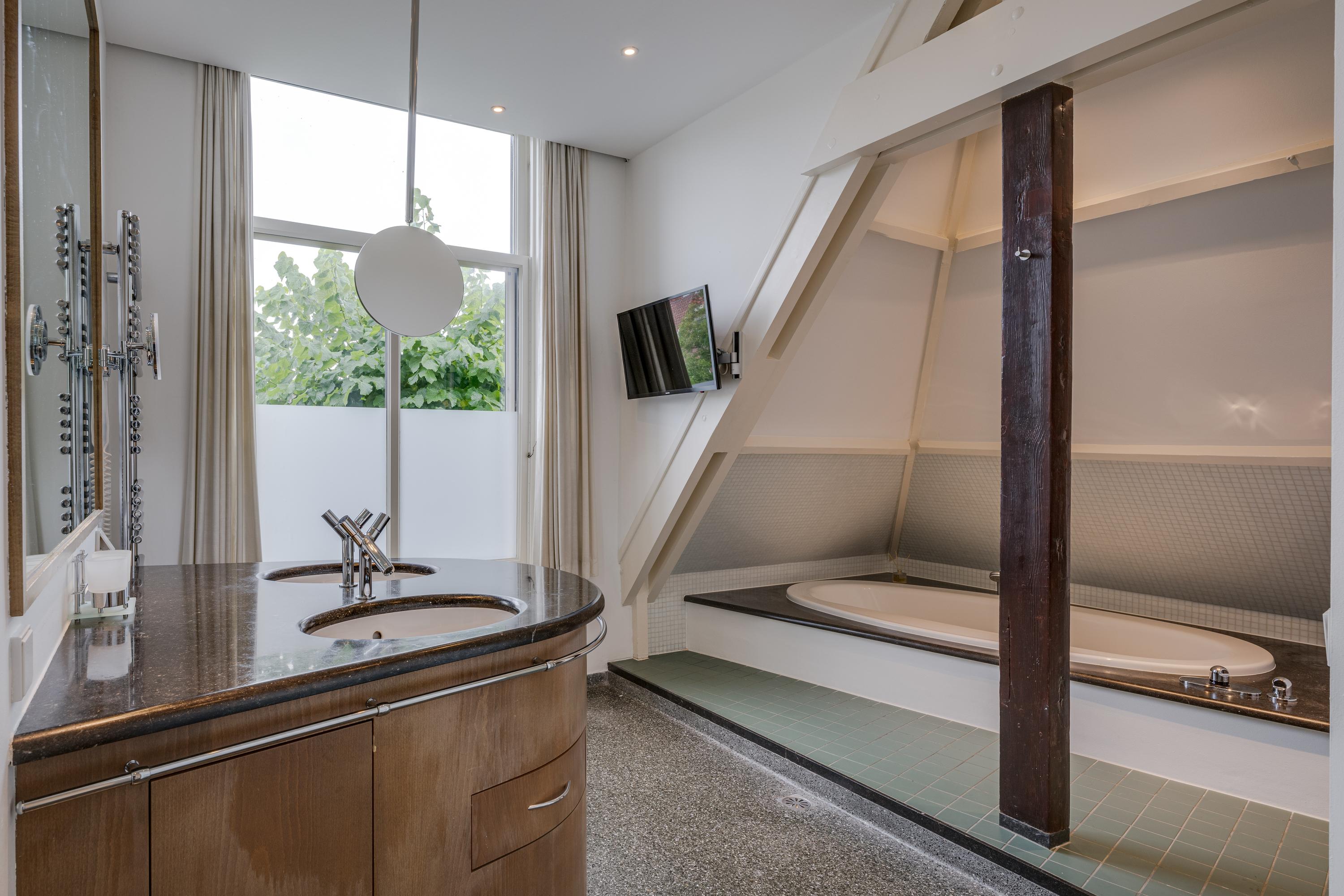 The main building from 1820 is characterised by the classic style elements from that period: a central entrance with two windows with shutters on either side and on the first floor the beginning of the roof with a central facade with three windows with shutters. The characteristics characteristic of this construction period are also present inside; high stately ceilings and windows on all sides provide beautiful light at any time of the day. On the ground floor there is an L-shaped living room en suite, fireplace with a conservatory on the garden side and a view of the Rhine on the water side. The central hall runs from front to back and has French doors to the garden with terrace on the water side. On the left side of the hall are the kitchen with utility room with a passage to the barn, the spacious basement and the formal dining room with again a beautiful view of the Rhine and the passing boats.