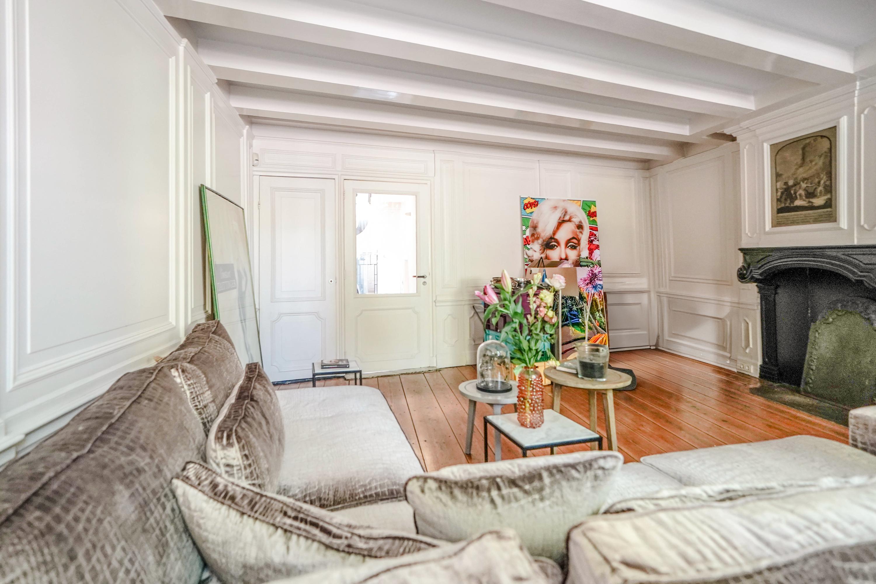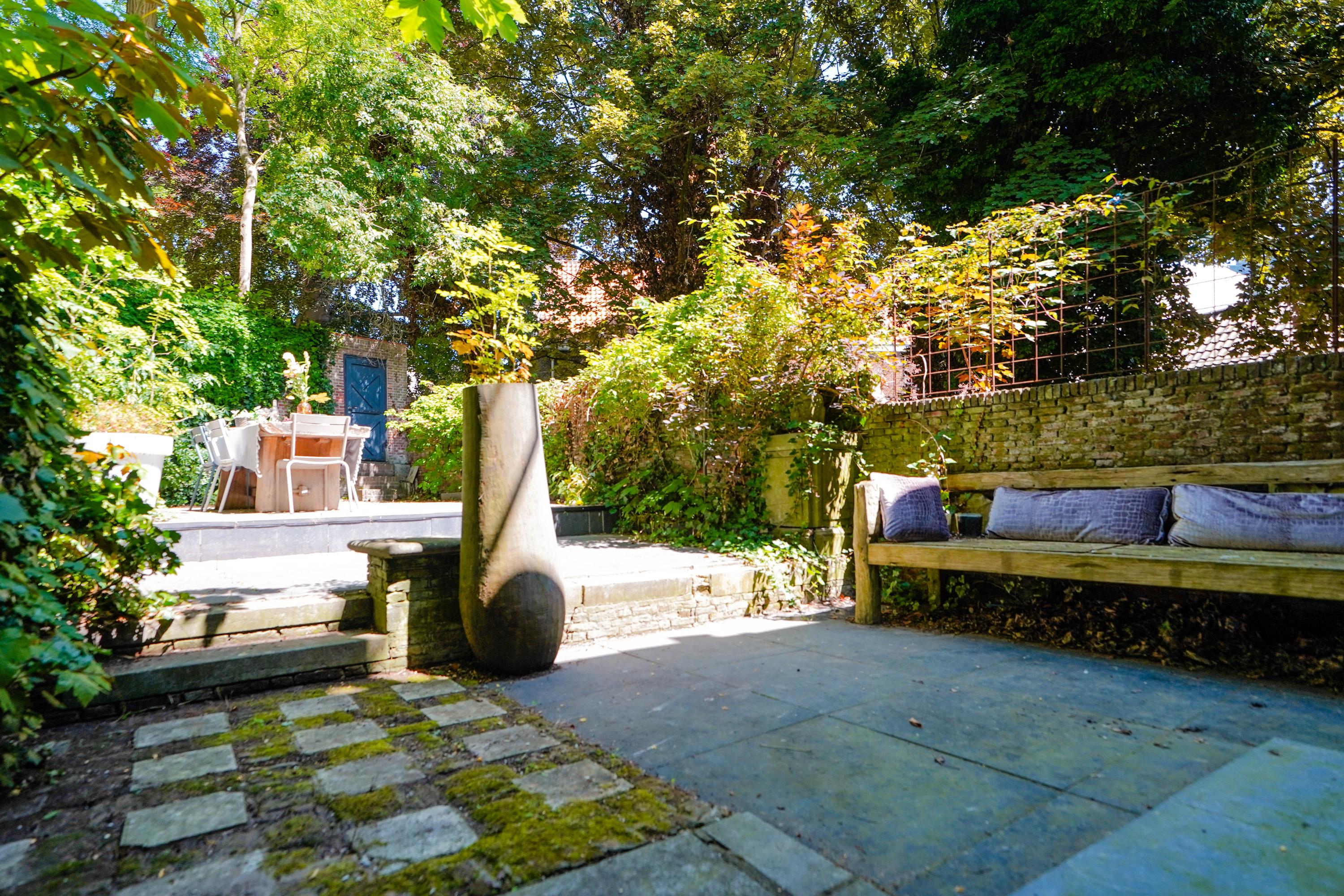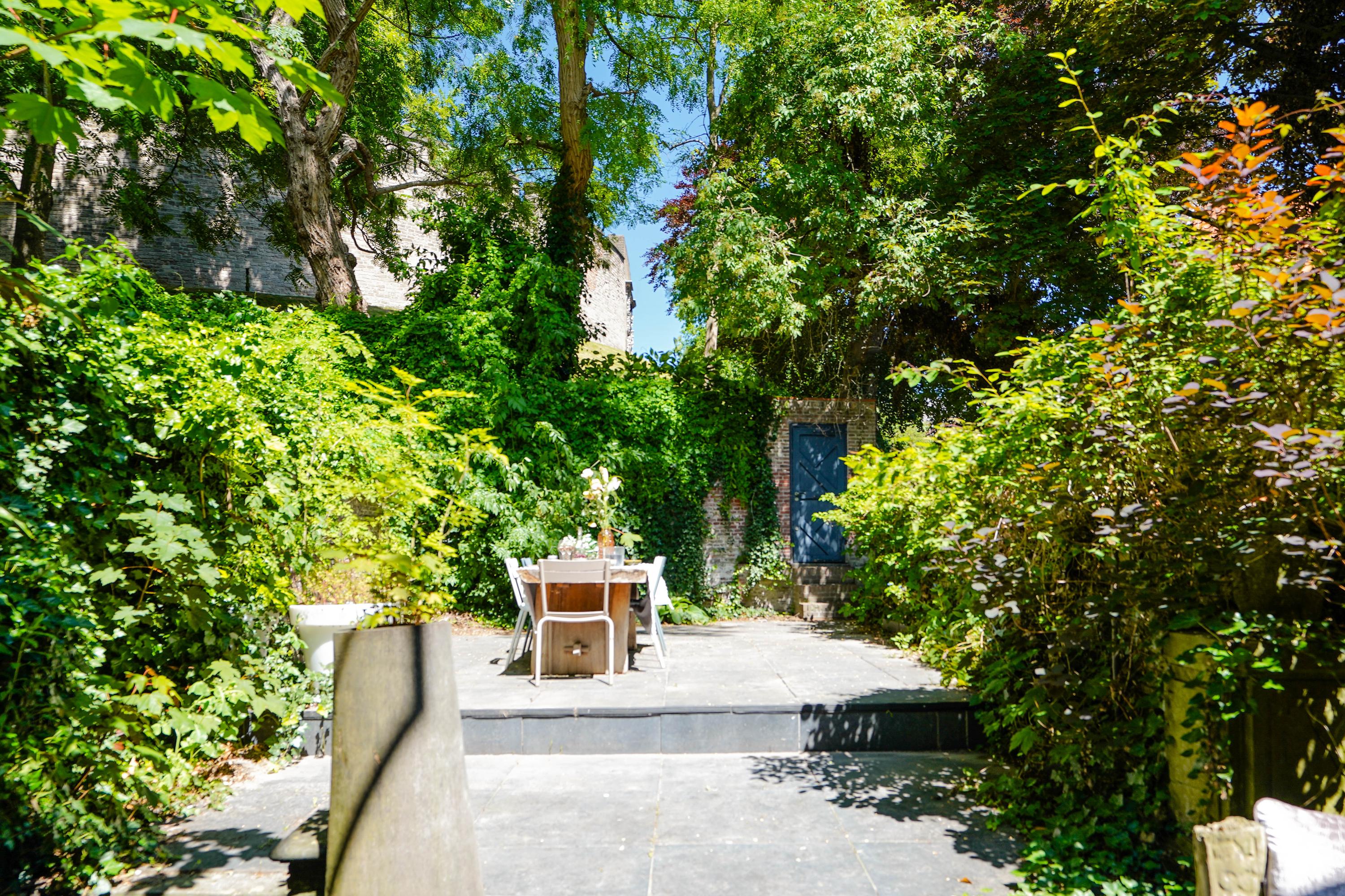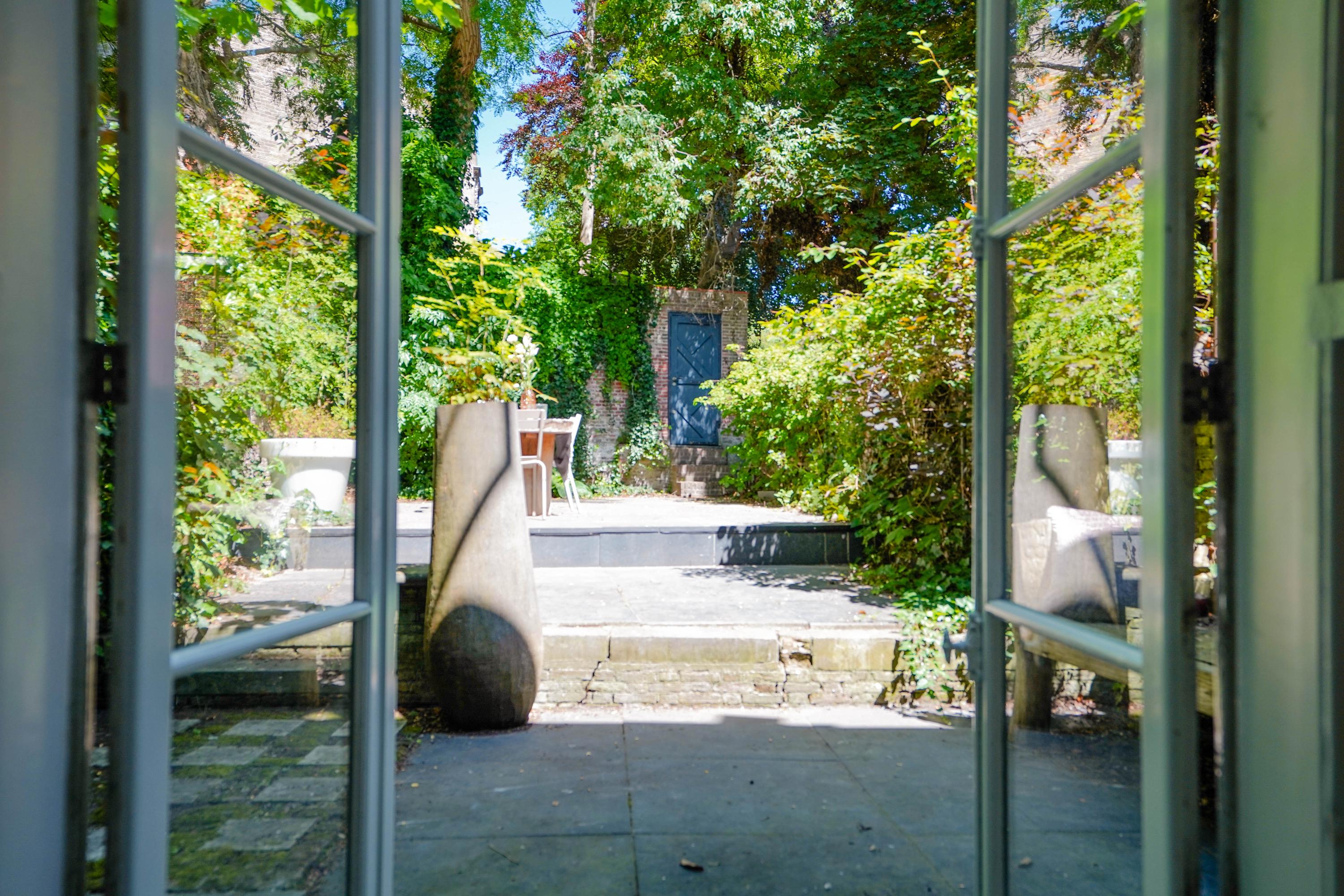 The rear house is oriented towards the garden and the castle hill. From the various rooms you can see the Burggraaf's old home through beautiful high windows: an 800-year-old oasis of greenery in the middle of the city center. Here the current owner has a garden room on the ground floor with an extra kitchen. You also need this, because having to go through the entire building every time for a snack or drink when you're sitting in the garden is a bit much to ask. There are quite some distances you can cover here. There is now a second living room on the 1st floor. with high ceilings, a fireplace and the best view of the Castle. It could also make a lovely office or library. Upstairs is a separate guesthouse with private bathroom and toilet. An aupair could also have a very nice place here.
