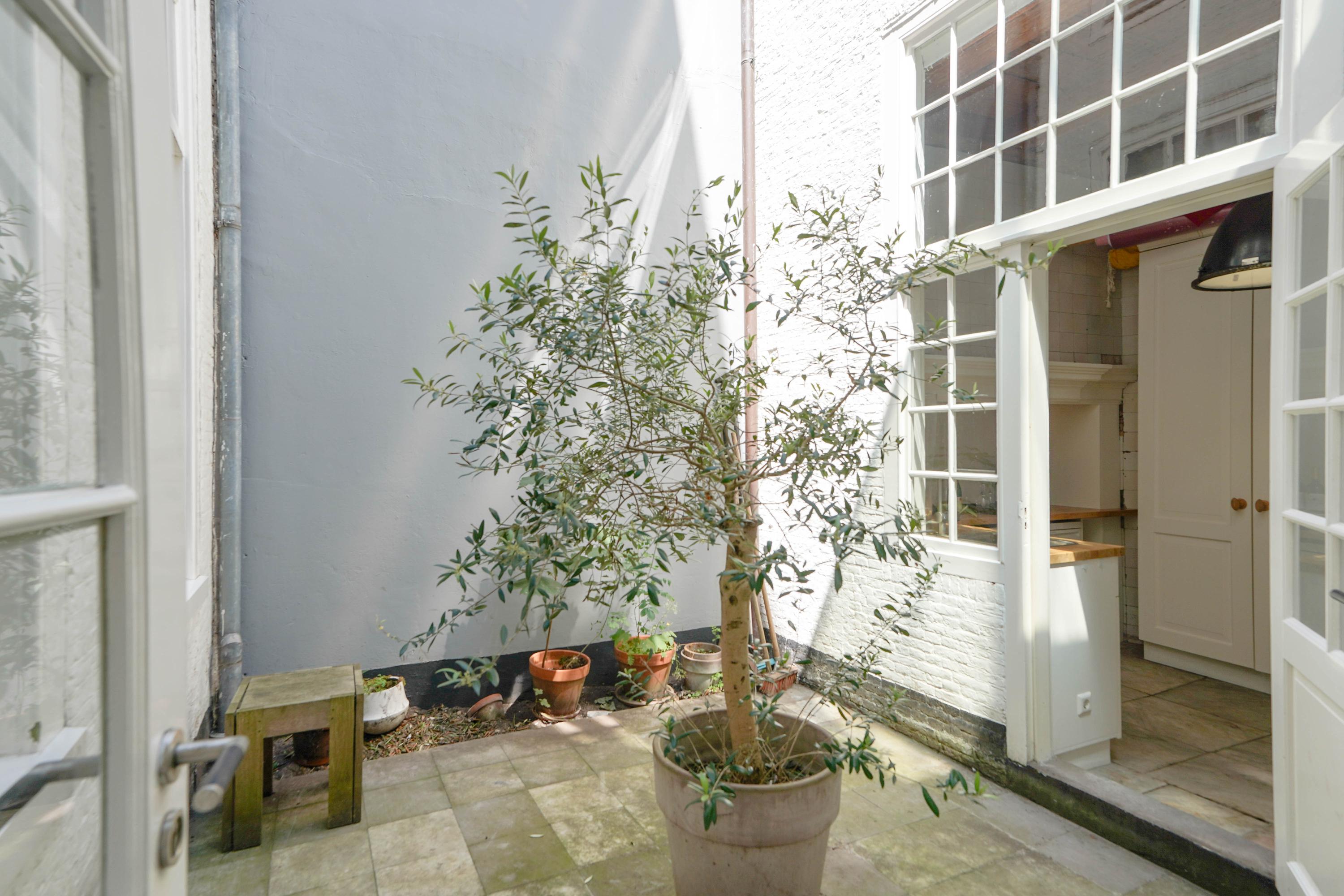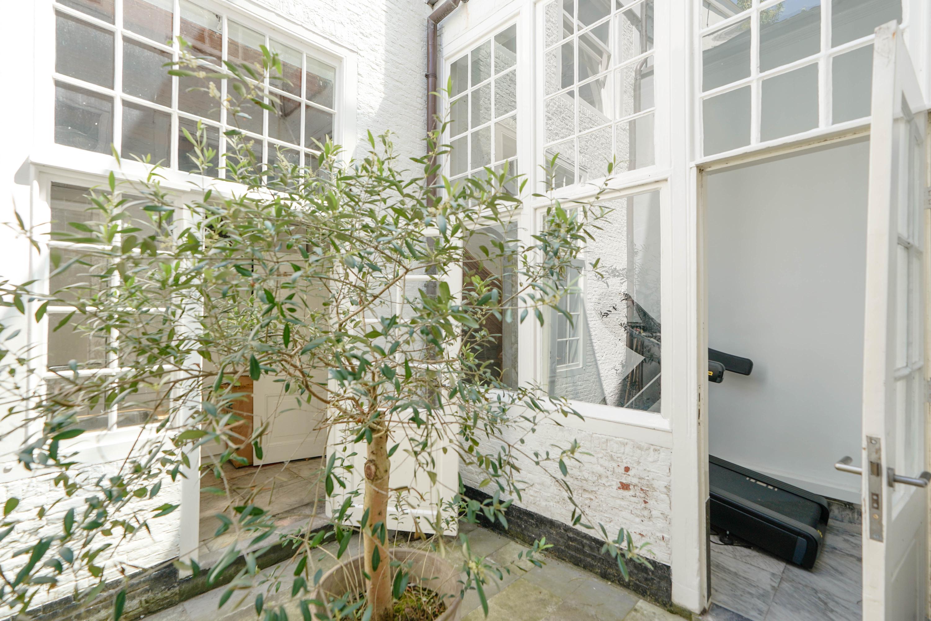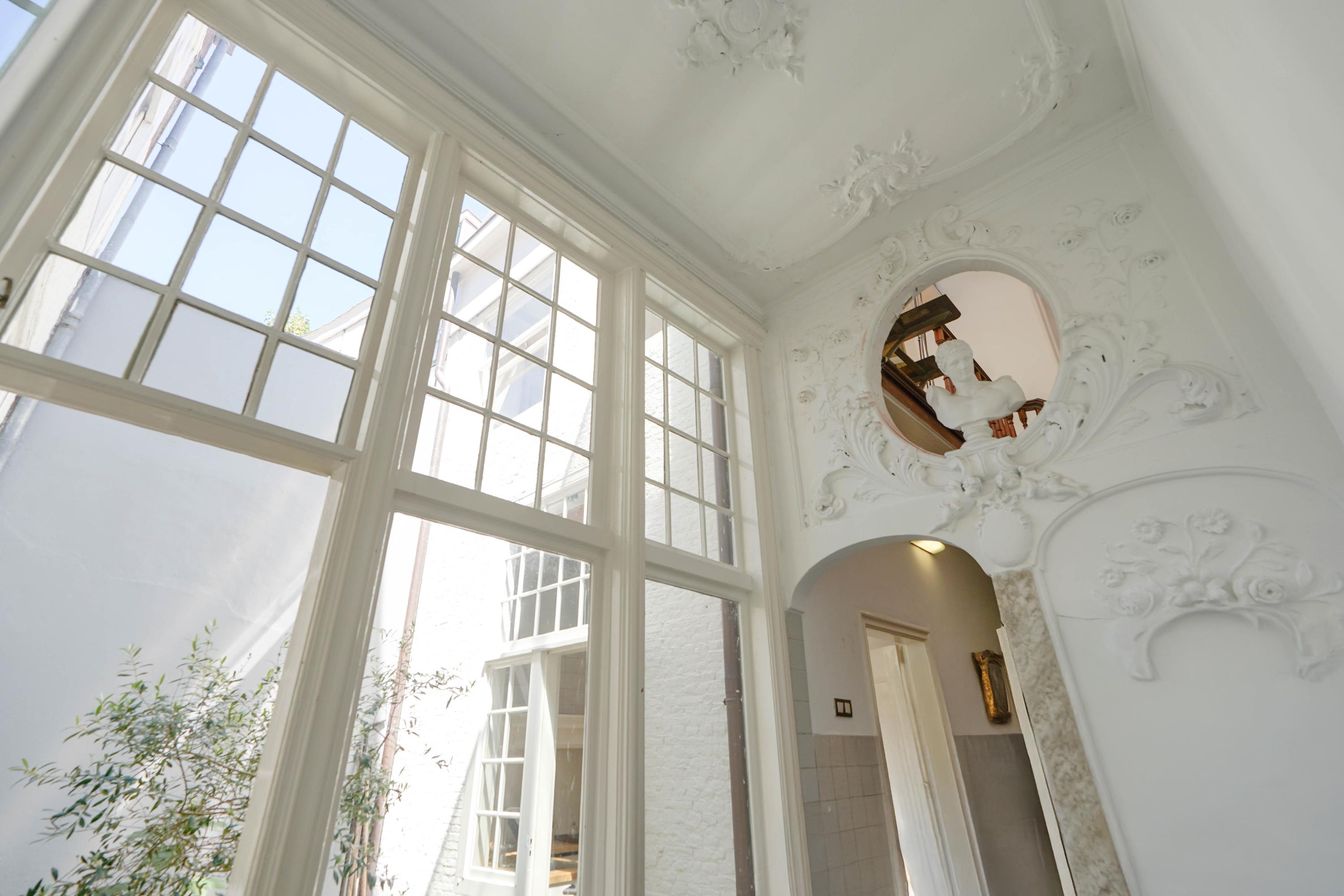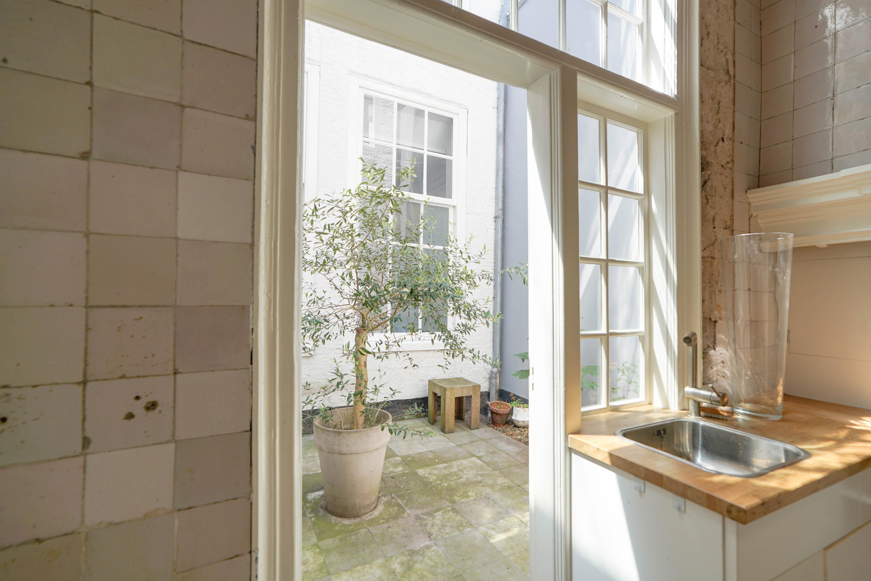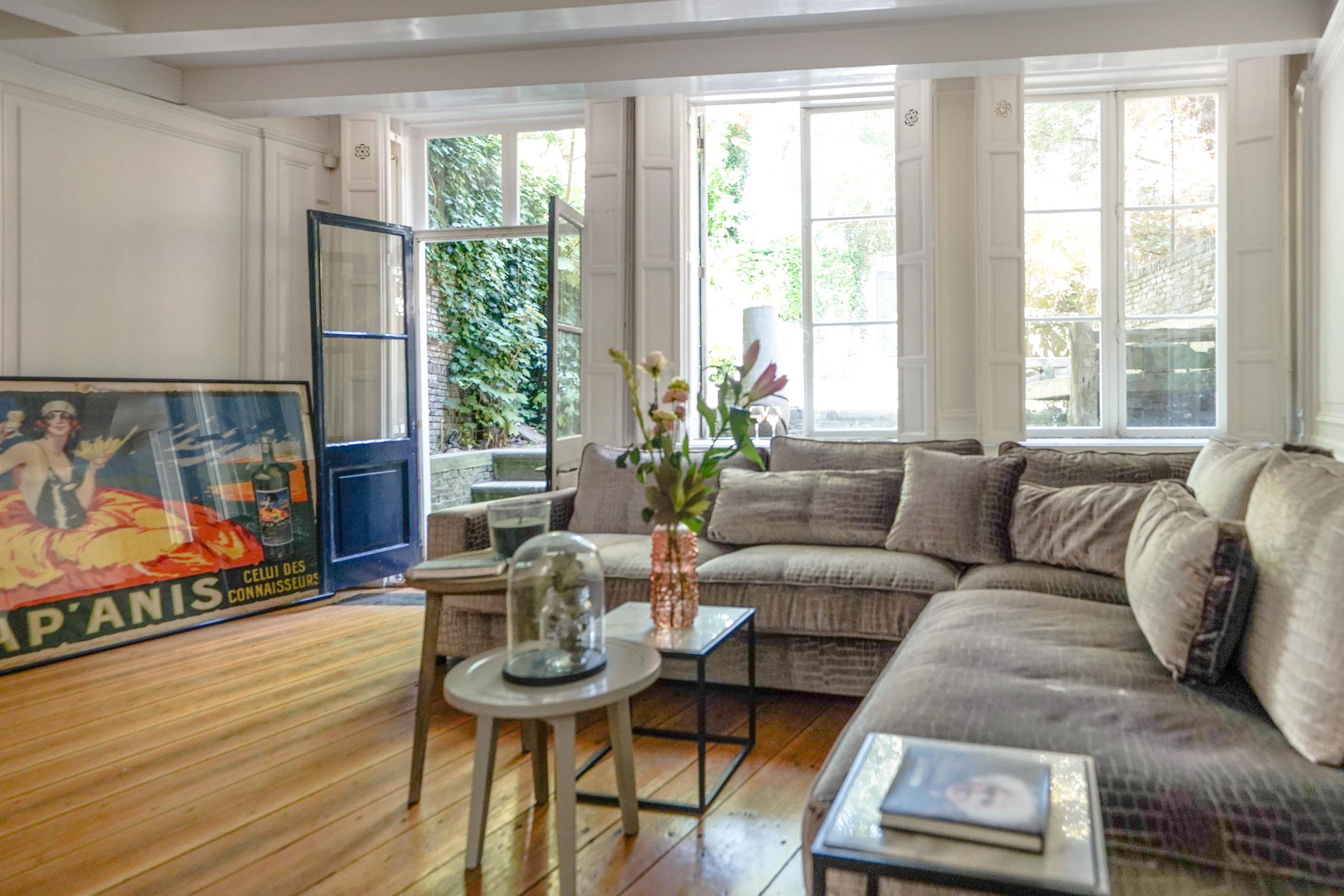 The rear house is oriented towards the garden and the castle hill. From the various rooms you can see the Burggraaf's old home through beautiful high windows: an 800-year-old oasis of greenery in the middle of the city center. Here the current owner has a garden room on the ground floor with an extra kitchen. You also need this, because having to go through the entire building every time for a snack or drink when you're sitting in the garden is a bit much to ask. There are quite some distances you can cover here. There is now a second living room on the 1st floor. with high ceilings, a fireplace and the best view of the Castle. It could also make a lovely office or library. Upstairs is a separate guesthouse with private bathroom and toilet. An aupair could also have a very nice place here.