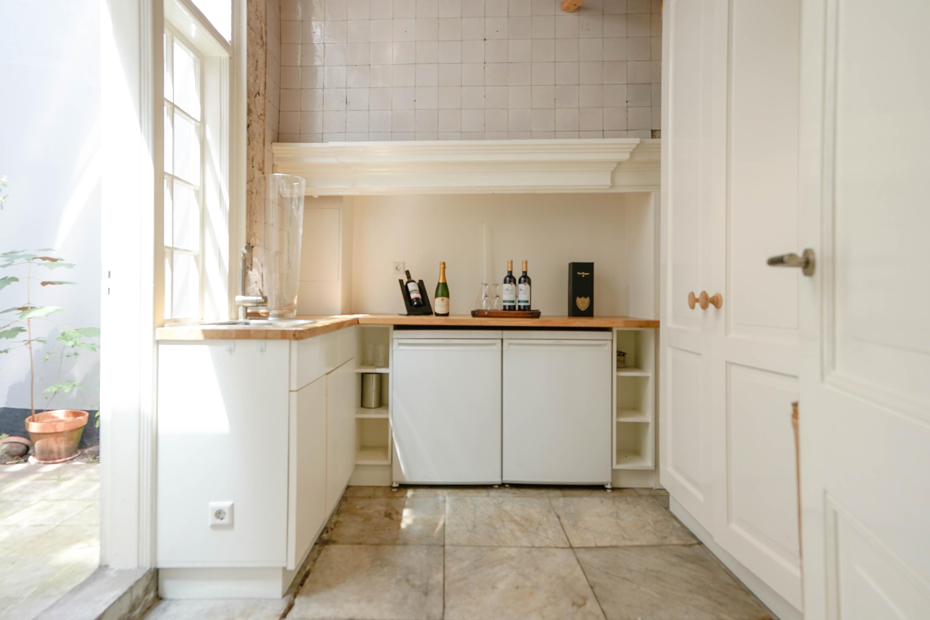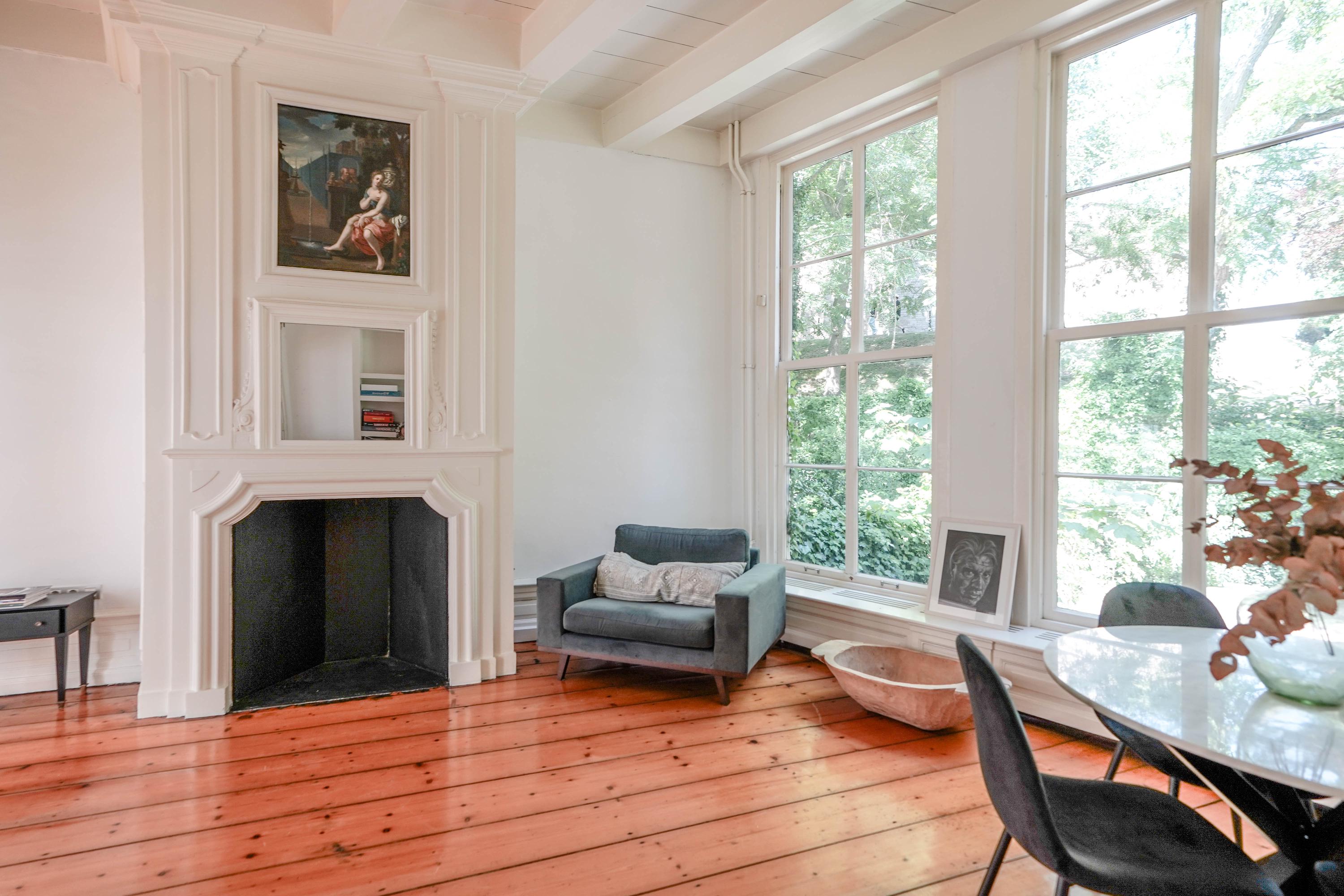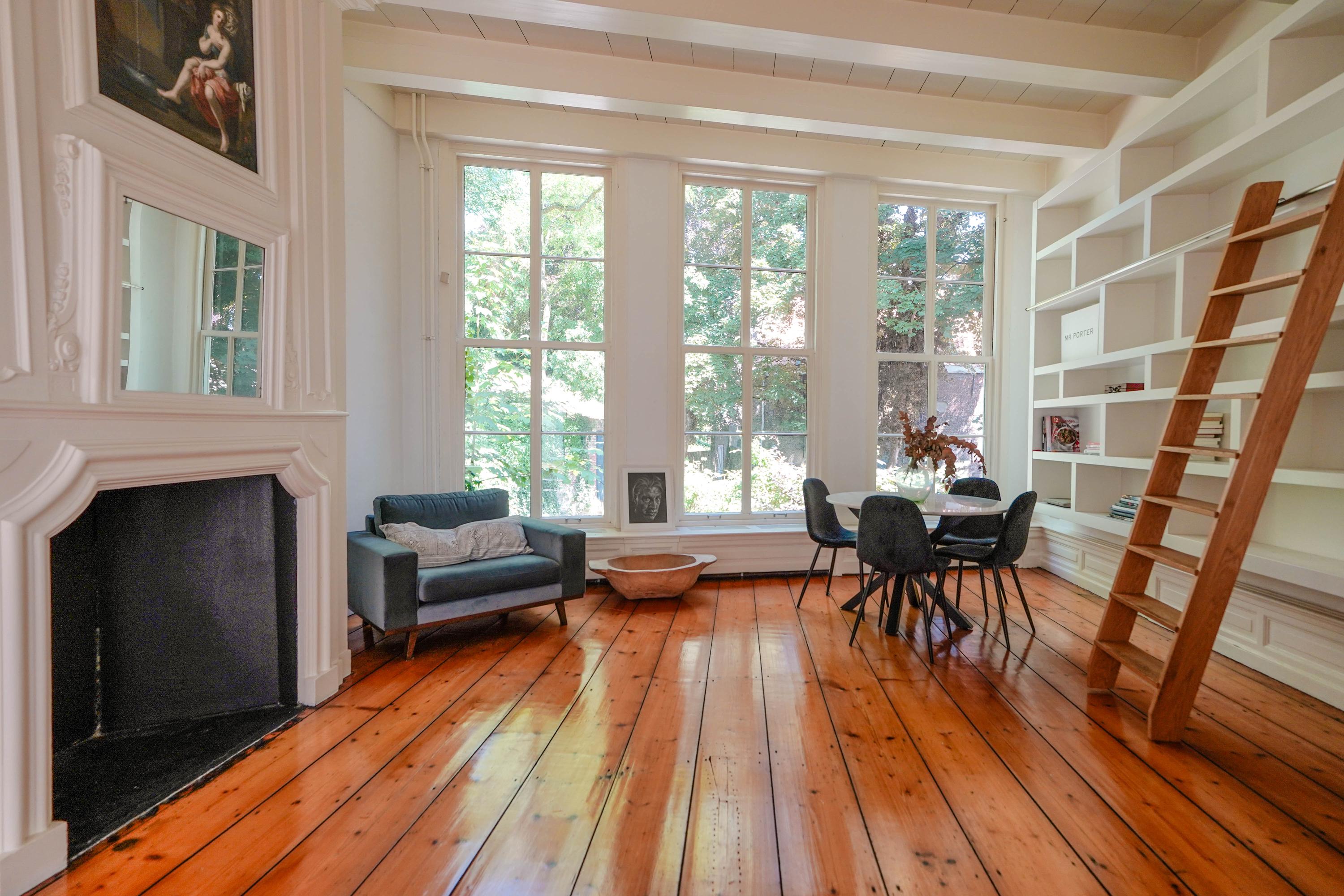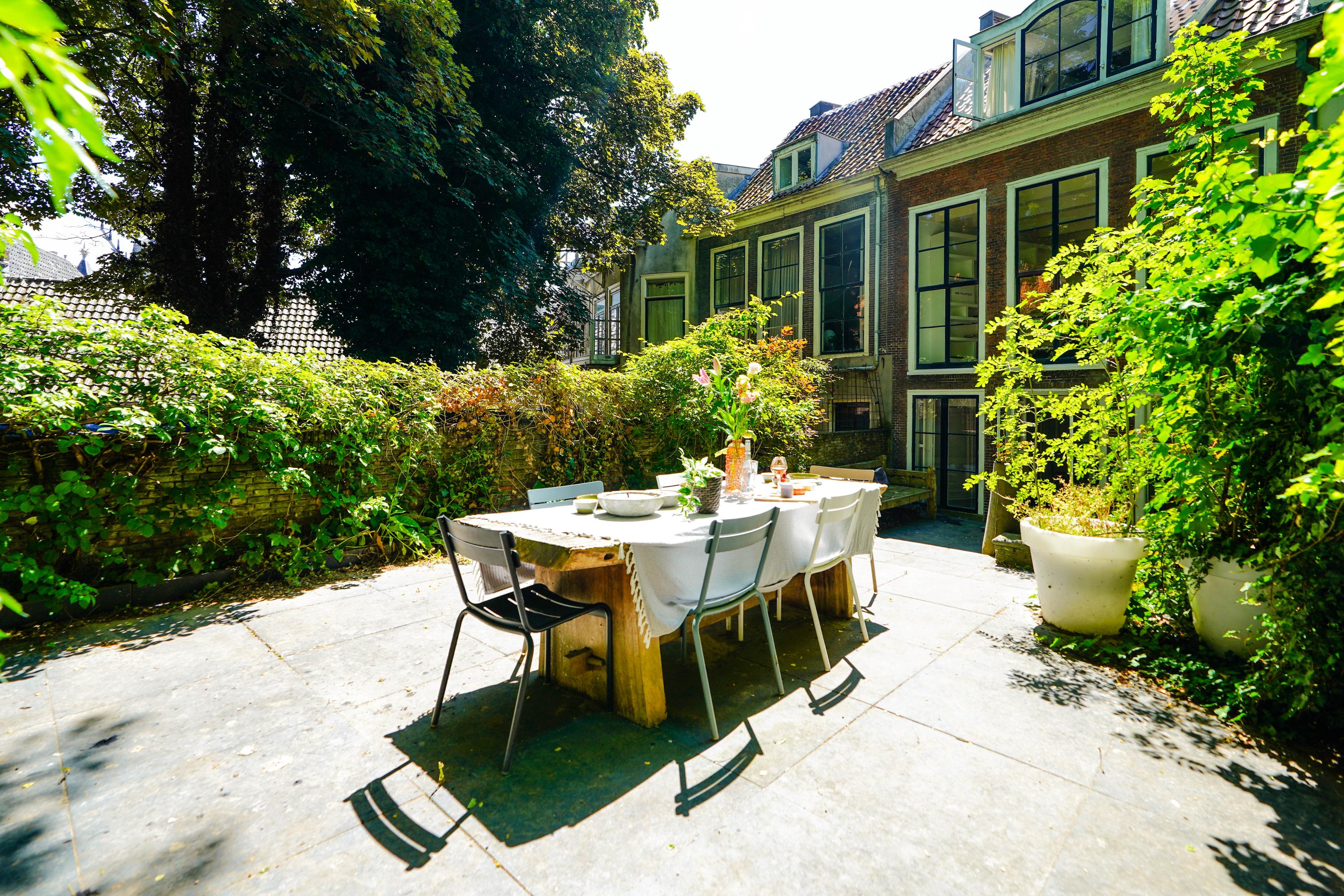 The rear house is oriented towards the garden and the castle hill. From the various rooms you can see the Burggraaf's old home through beautiful high windows: an 800-year-old oasis of greenery in the middle of the city center. Here the current owner has a garden room on the ground floor with an extra kitchen. You also need this, because having to go through the entire building every time for a snack or drink when you're sitting in the garden is a bit much to ask. There are quite some distances you can cover here. There is now a second living room on the 1st floor. with high ceilings, a fireplace and the best view of the Castle. It could also make a lovely office or library. Upstairs is a separate guesthouse with private bathroom and toilet. An aupair could also have a very nice place here.