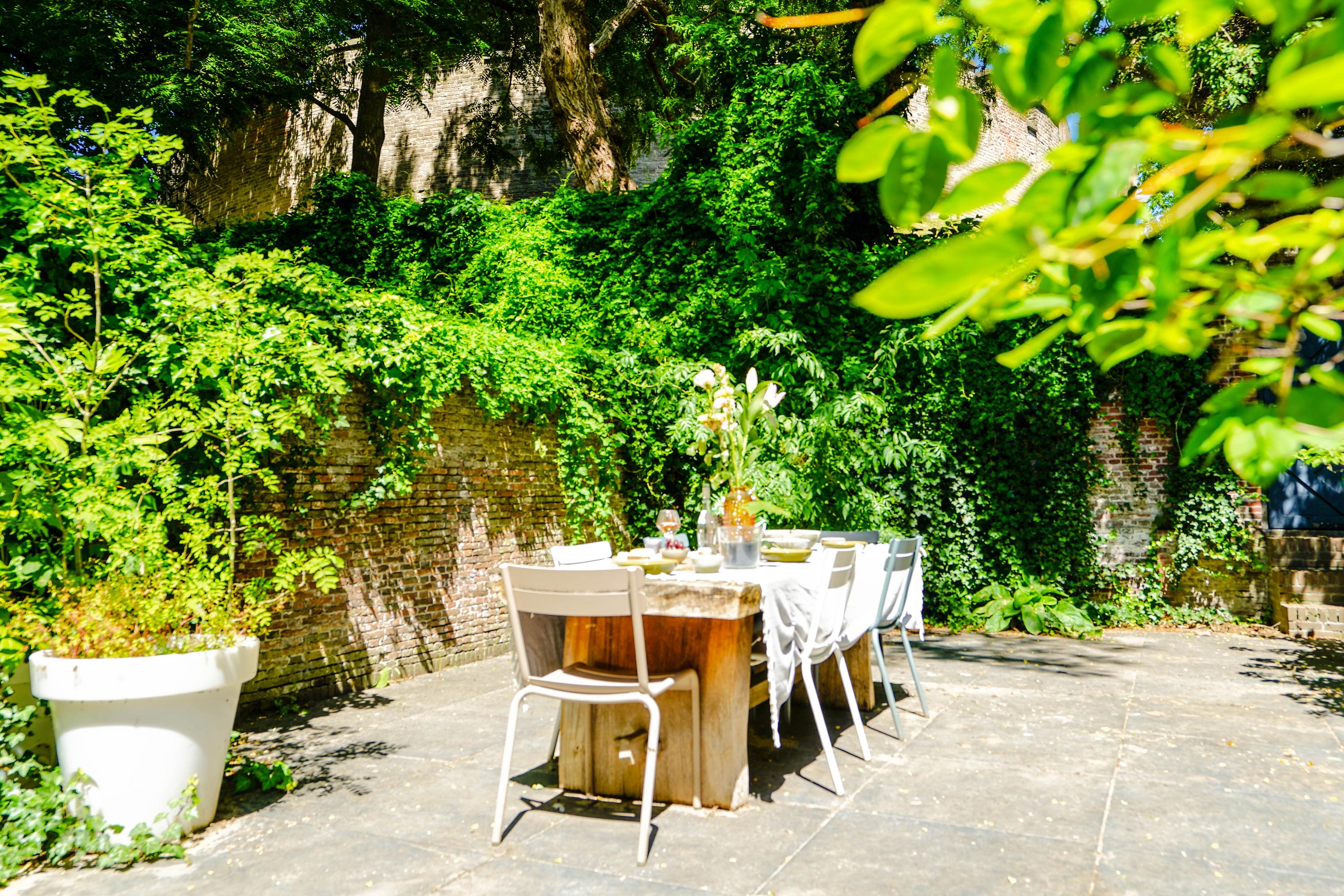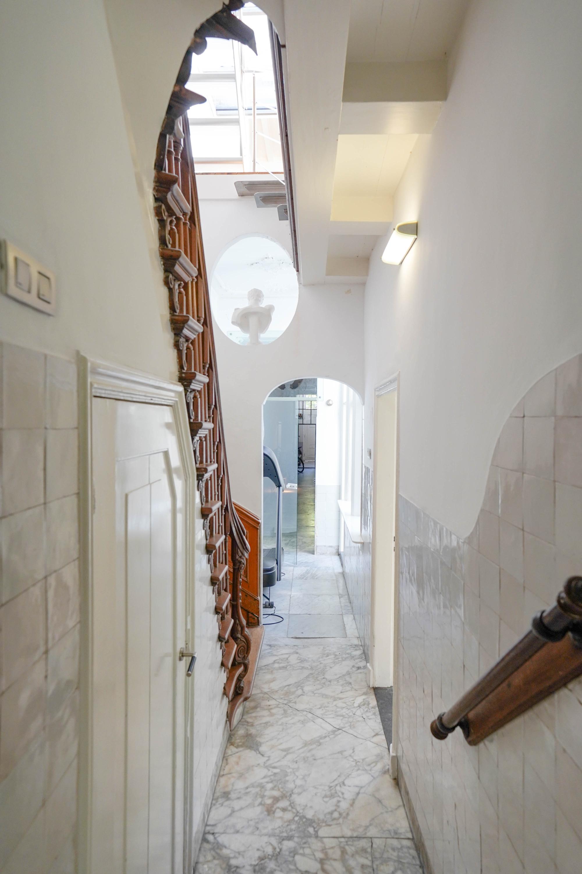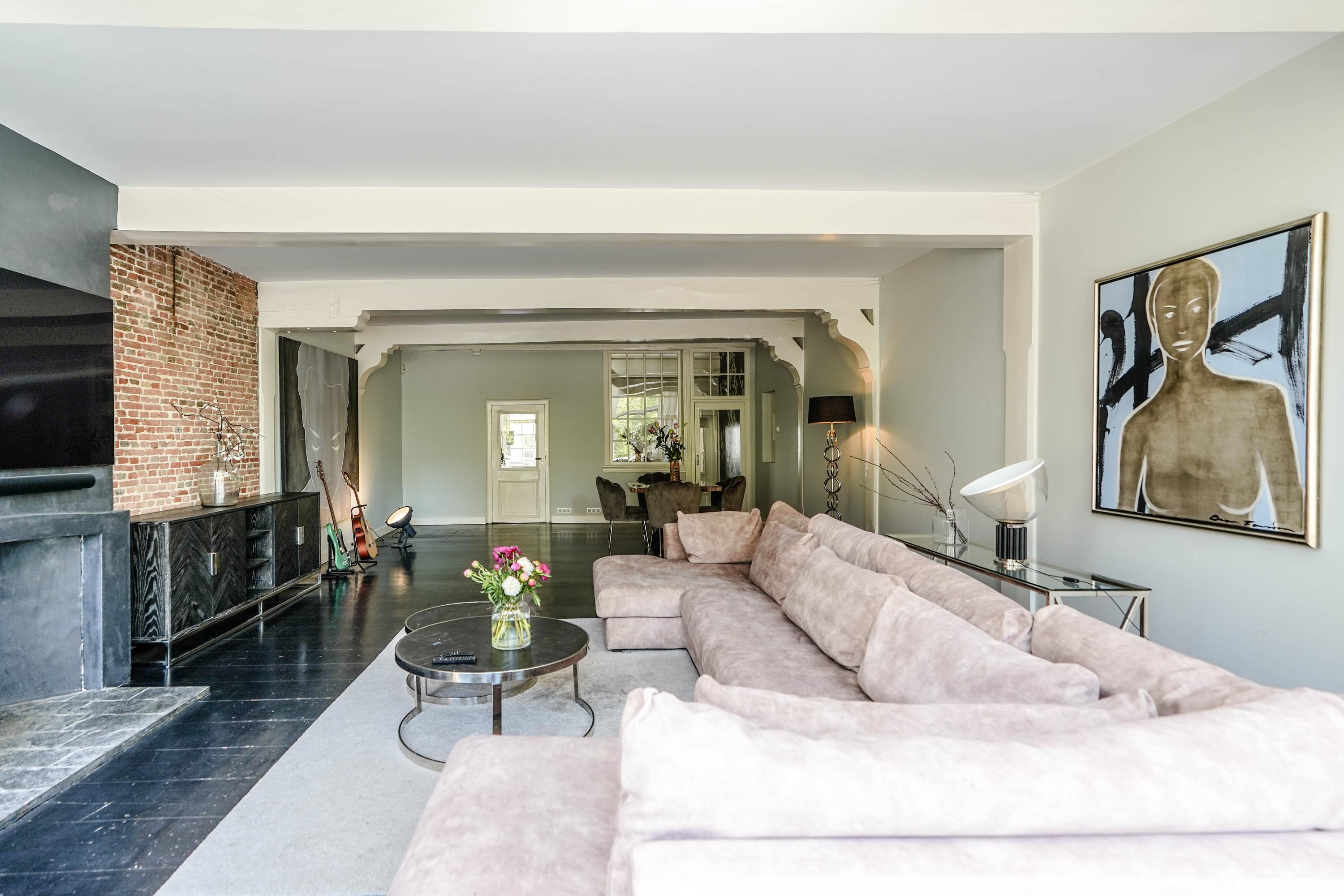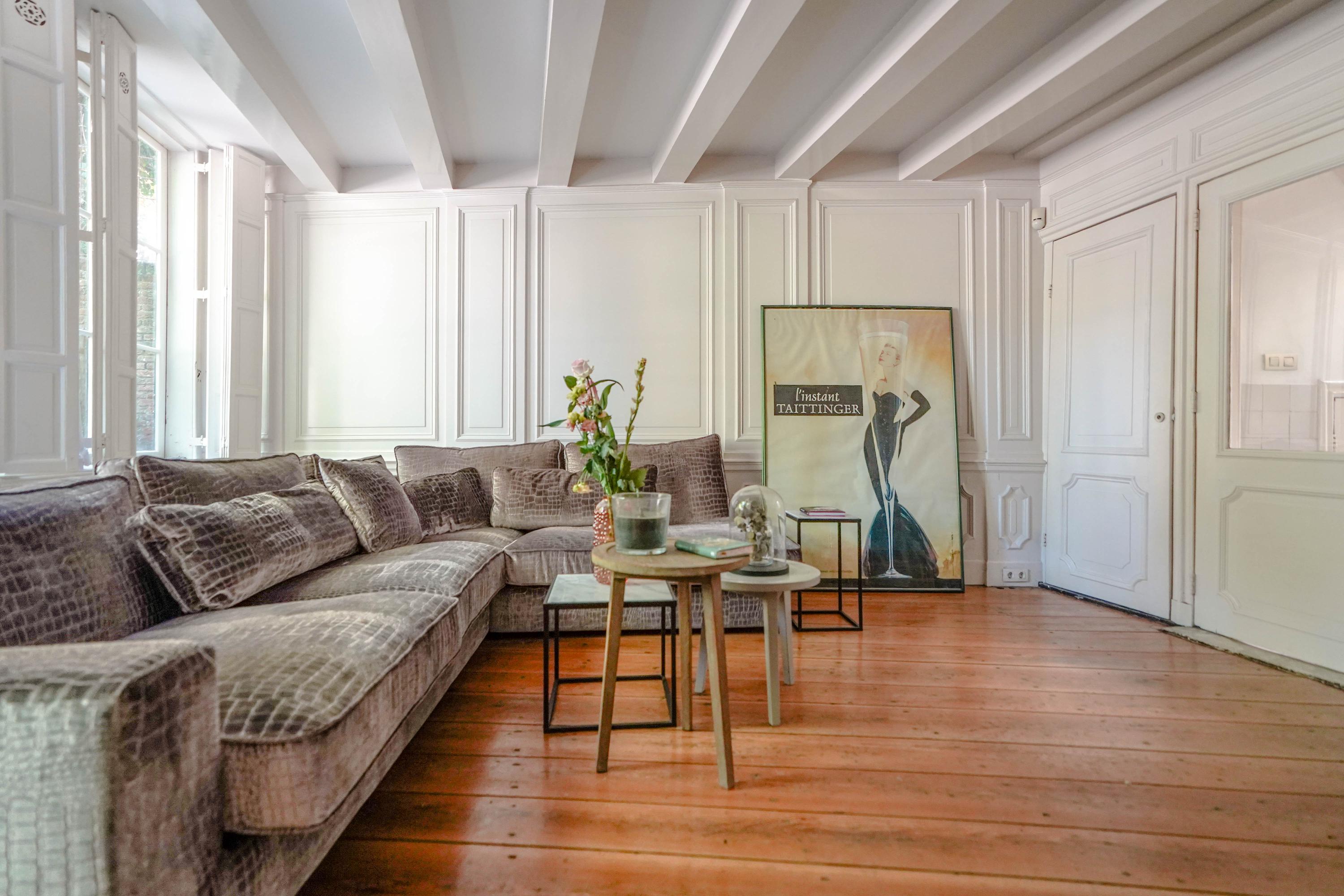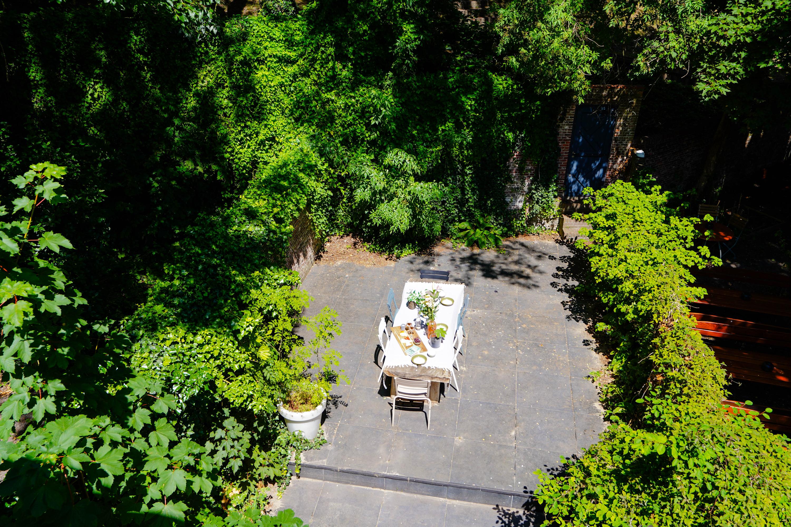 The rear house is oriented towards the garden and the castle hill. From the various rooms you can see the Burggraaf's old home through beautiful high windows: an 800-year-old oasis of greenery in the middle of the city center. Here the current owner has a garden room on the ground floor with an extra kitchen. You also need this, because having to go through the entire building every time for a snack or drink when you're sitting in the garden is a bit much to ask. There are quite some distances you can cover here. There is now a second living room on the 1st floor. with high ceilings, a fireplace and the best view of the Castle. It could also make a lovely office or library. Upstairs is a separate guesthouse with private bathroom and toilet. An aupair could also have a very nice place here.