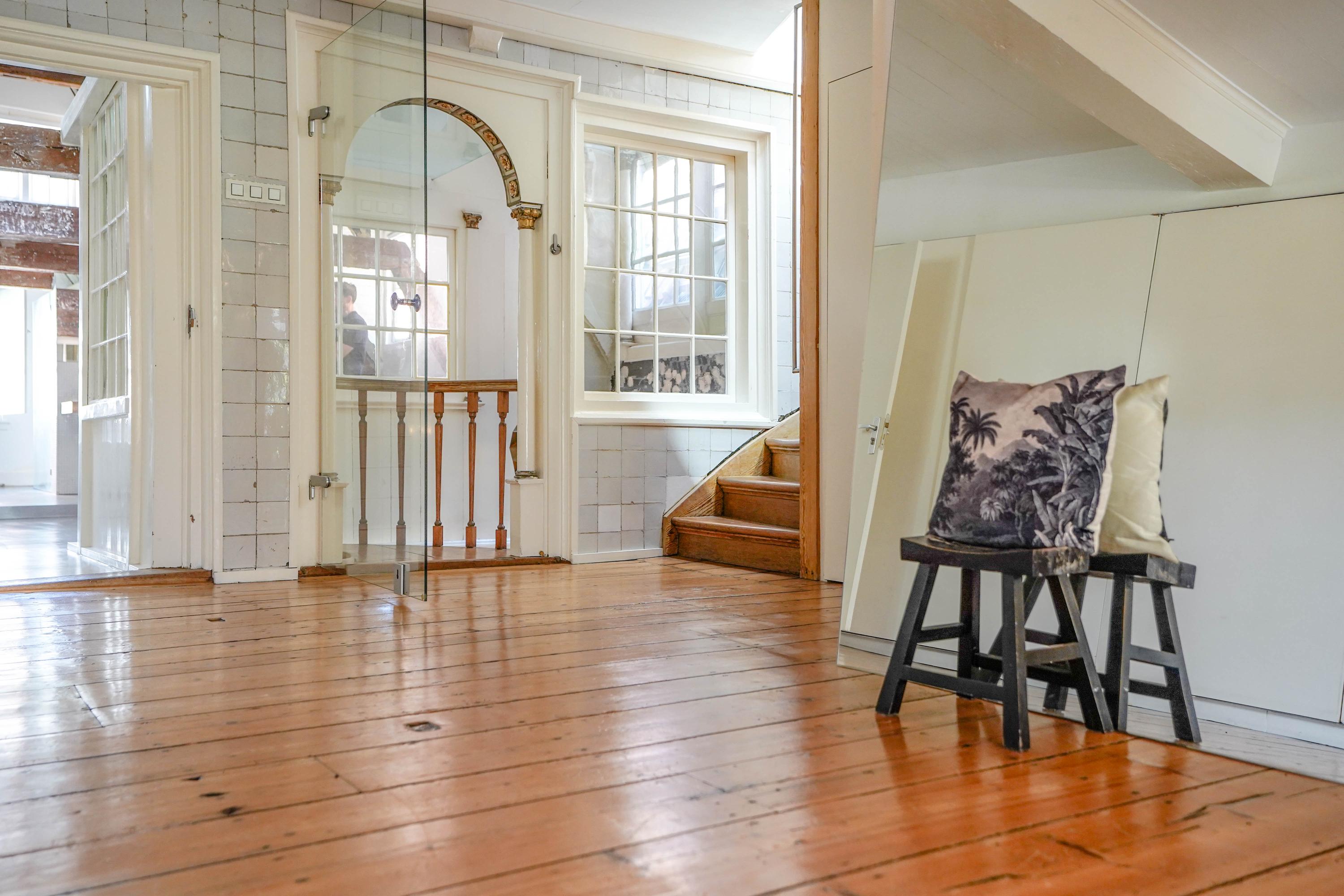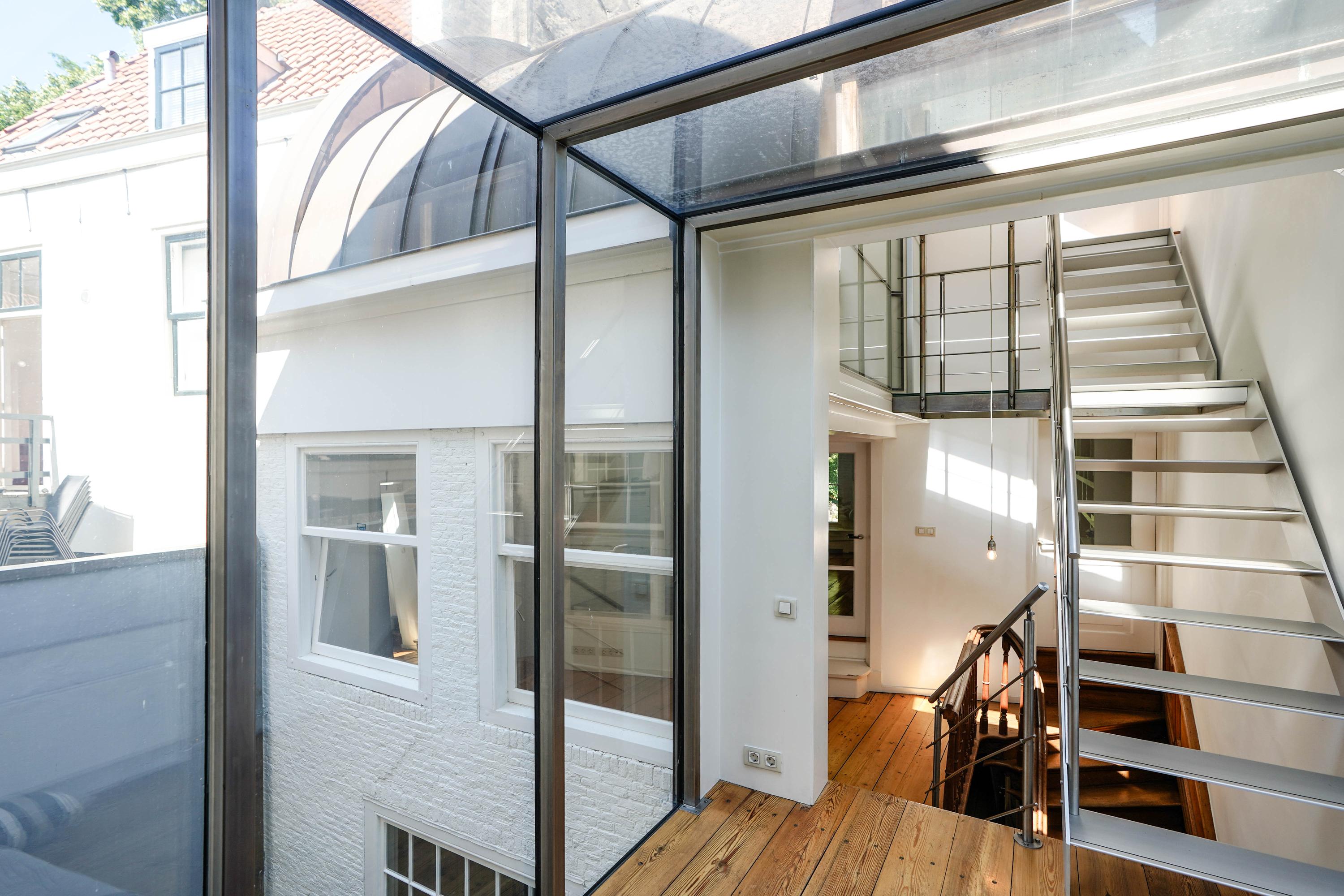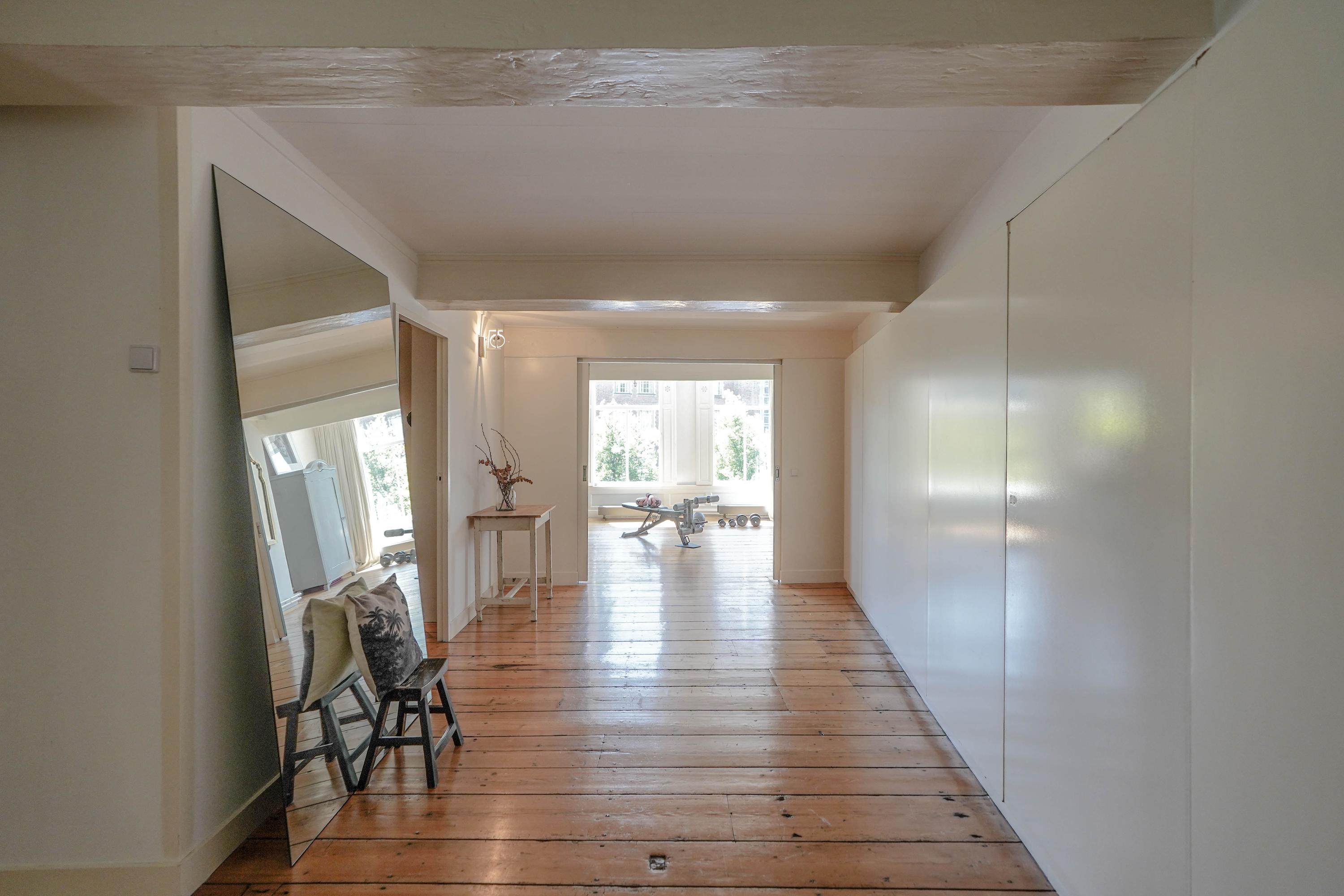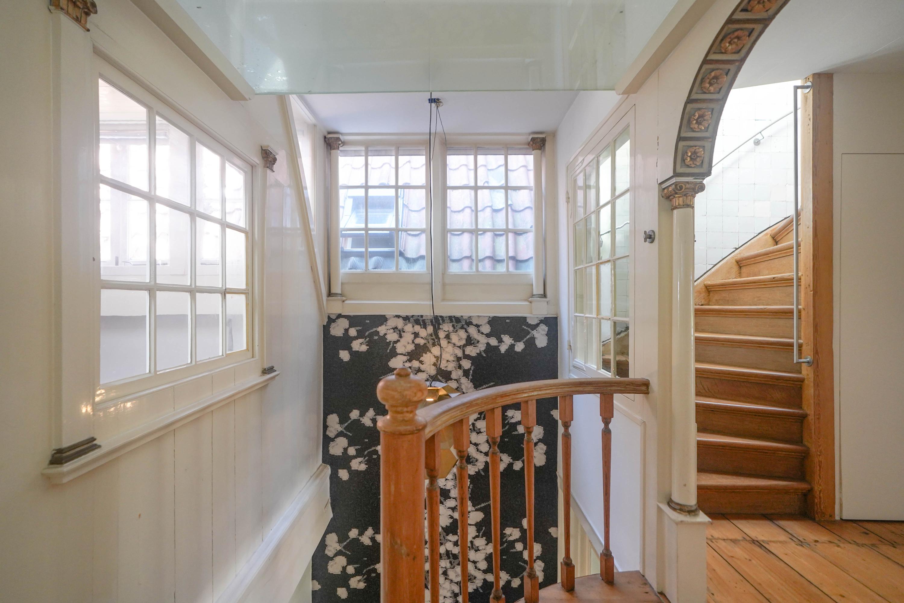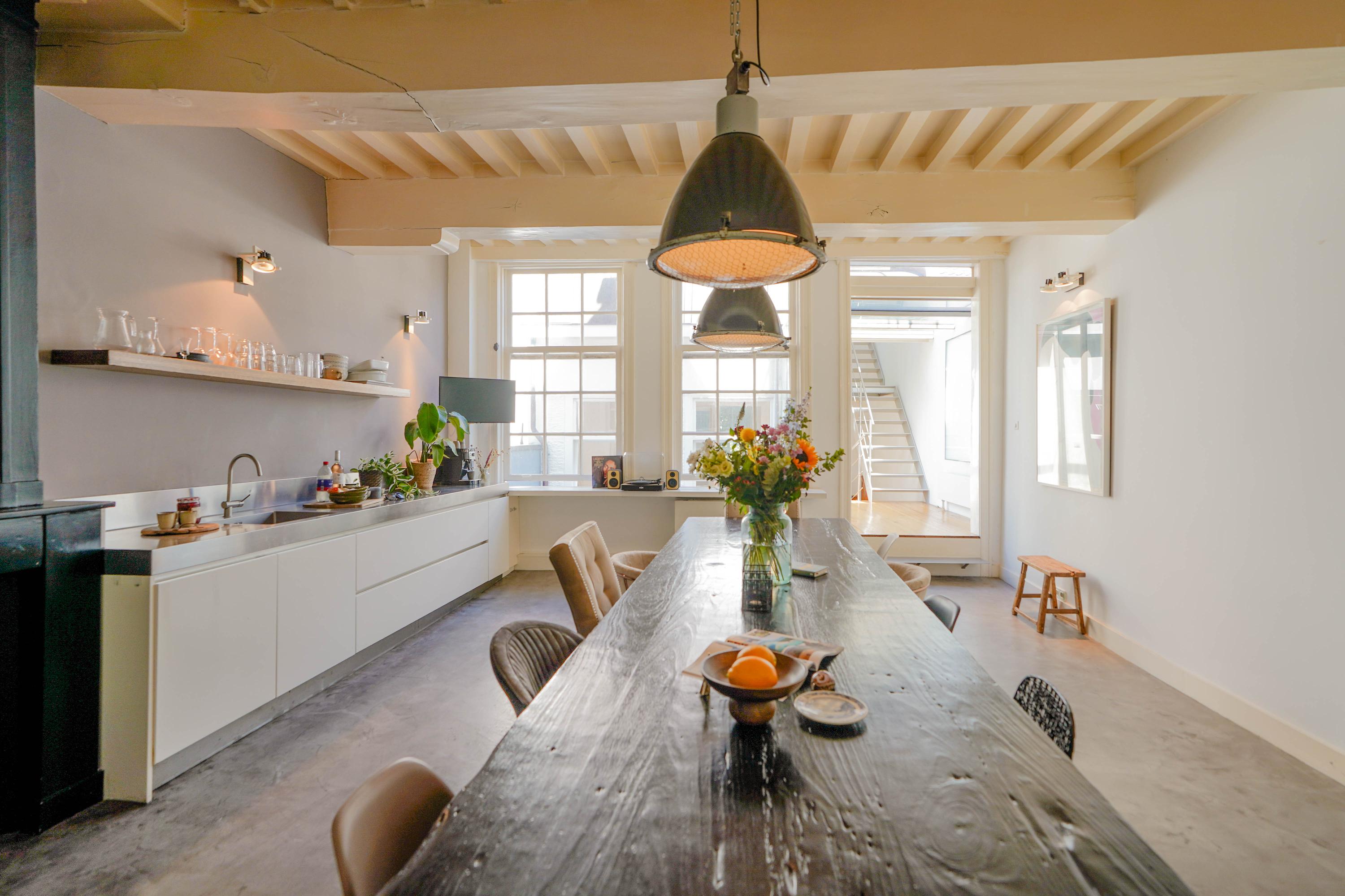 The front house is the original main house. The ground floor houses a shop (which is also available for purchase), and the first floor now houses the 70 m² living room, which overlooks the Rhine and Stadhuisplein. At the rear is the kitchen/diner with space. A lot of space. With 50 m², long worktops and a dining table that seats 12, this is now the heart of the house. From here there is also one of the passages to the back house along the courtyard, which provides a lot of light. The sleeping floors are one floor higher. Here the house has been peeled back to the structure with the beautiful wooden siding roof in full view. High Velux windows have been installed between the tracks, providing beautiful light at any time of the day. At the front you will find three bedrooms, a bathroom and, above all, plenty of storage space with fitted wardrobes and a linen room, spread over two floors. At the rear, the master bedroom with ensuite bathroom covers the entire roof with a ridge of no less than 8 meters high.