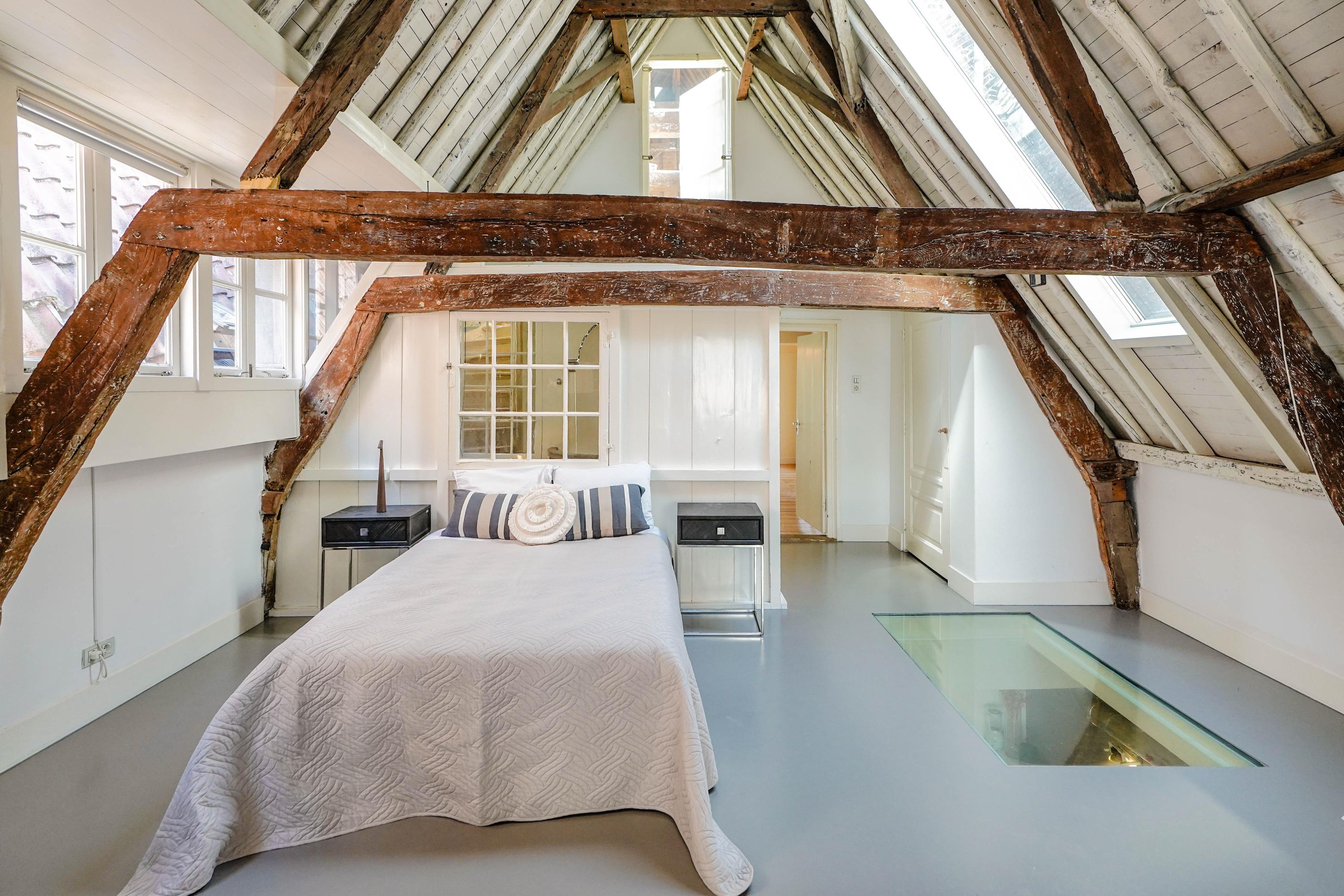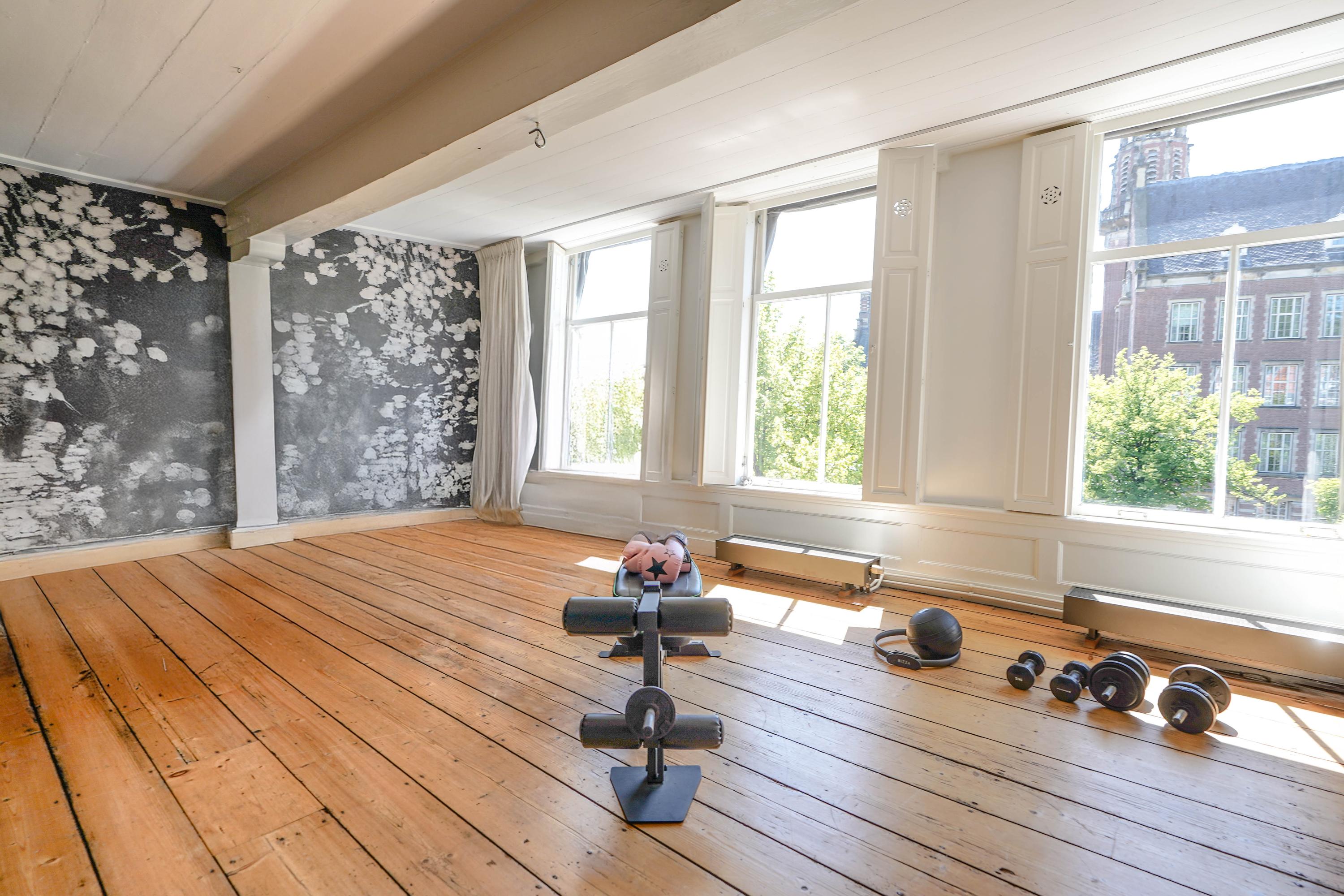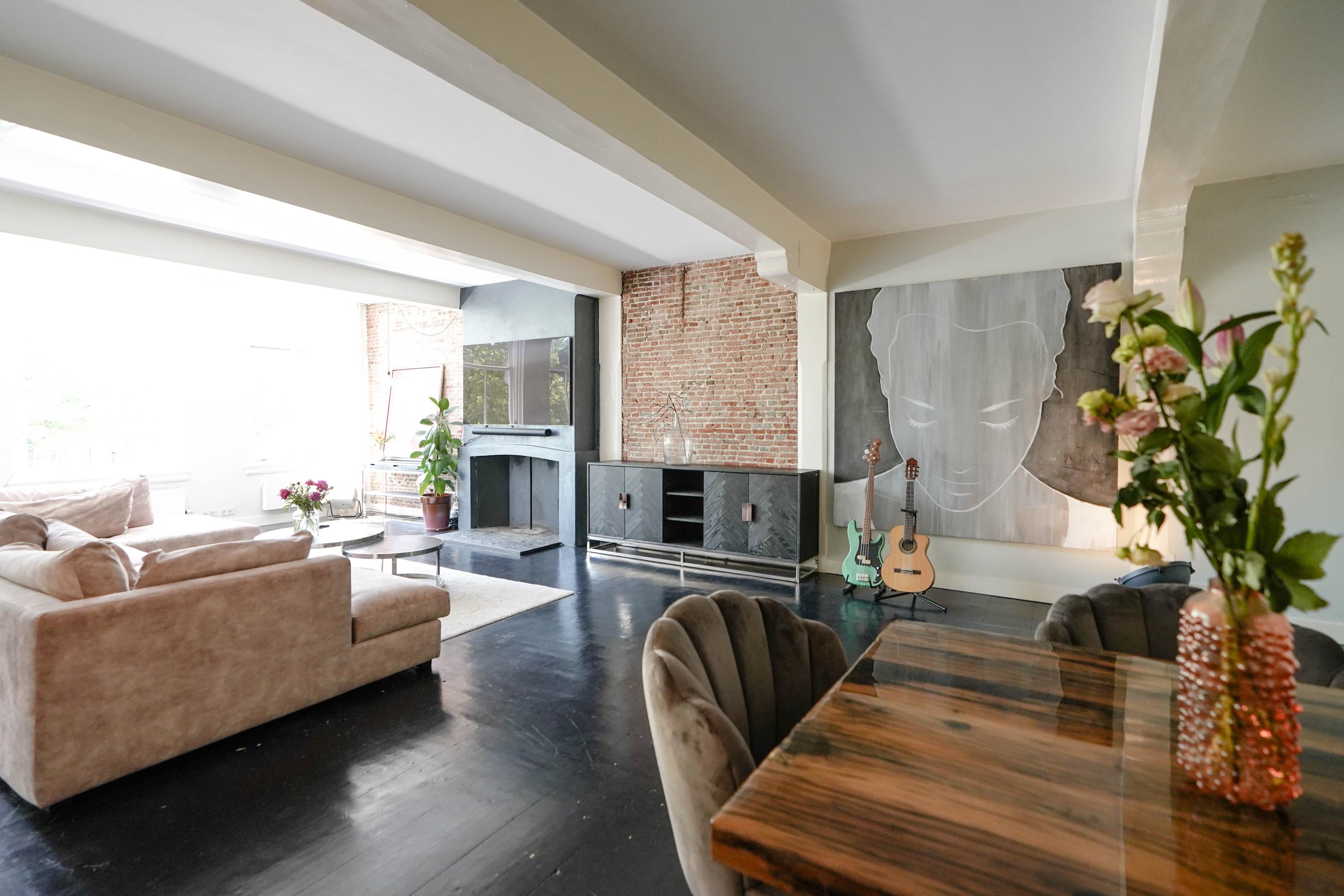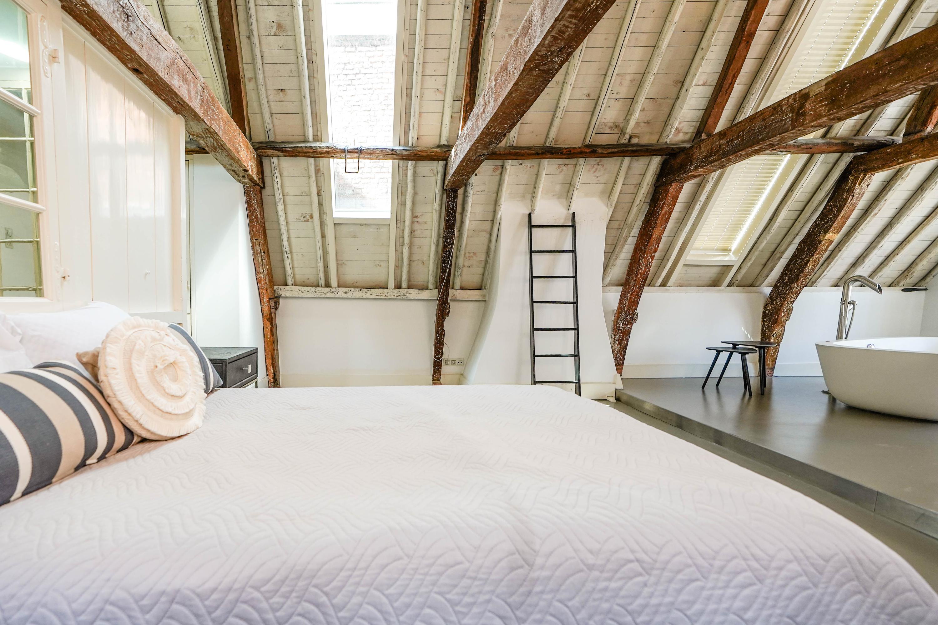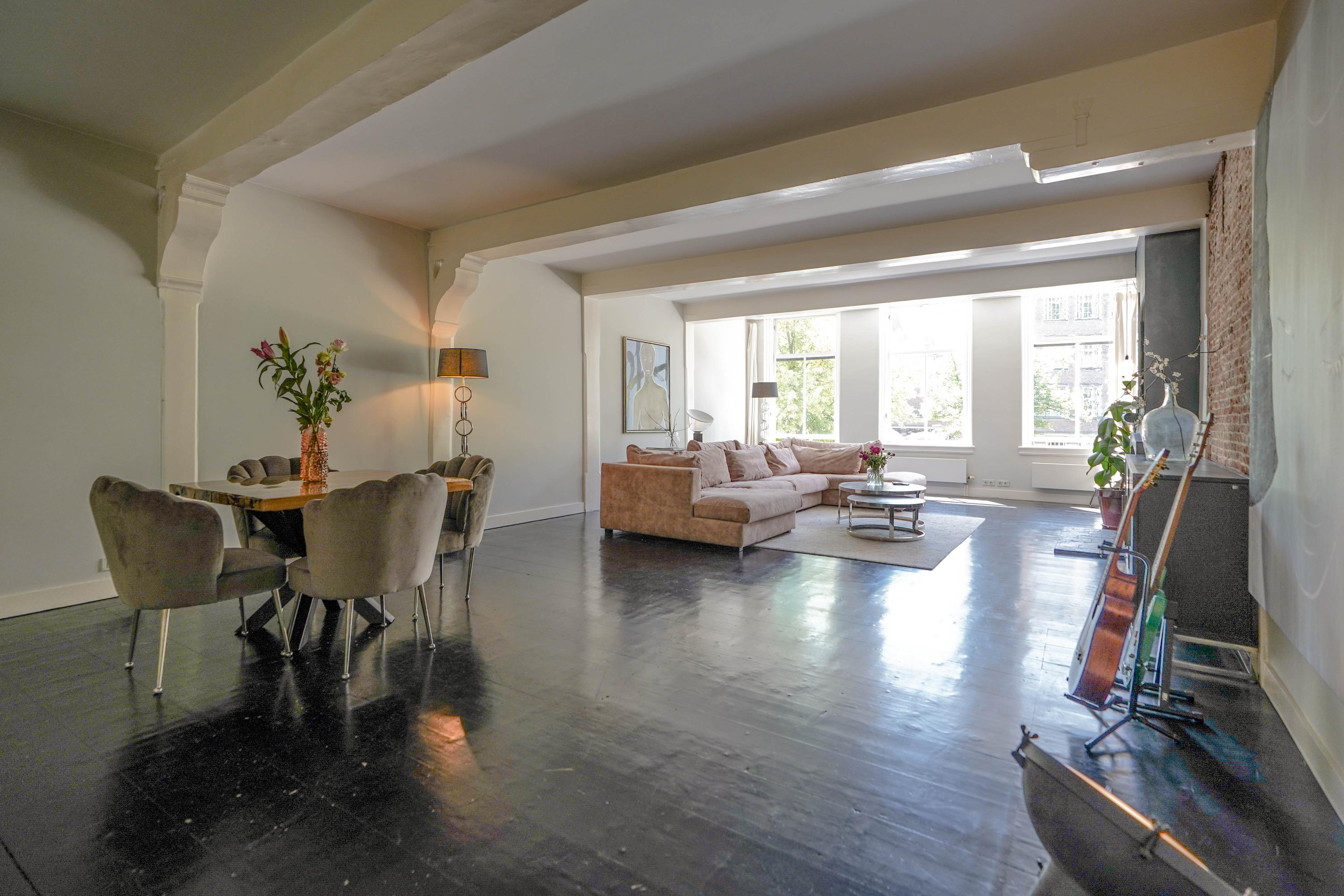 The front house is the original main house. The ground floor houses a shop (which is also available for purchase), and the first floor now houses the 70 m² living room, which overlooks the Rhine and Stadhuisplein. At the rear is the kitchen/diner with space. A lot of space. With 50 m², long worktops and a dining table that seats 12, this is now the heart of the house. From here there is also one of the passages to the back house along the courtyard, which provides a lot of light. The sleeping floors are one floor higher. Here the house has been peeled back to the structure with the beautiful wooden siding roof in full view. High Velux windows have been installed between the tracks, providing beautiful light at any time of the day. At the front you will find three bedrooms, a bathroom and, above all, plenty of storage space with fitted wardrobes and a linen room, spread over two floors. At the rear, the master bedroom with ensuite bathroom covers the entire roof with a ridge of no less than 8 meters high.