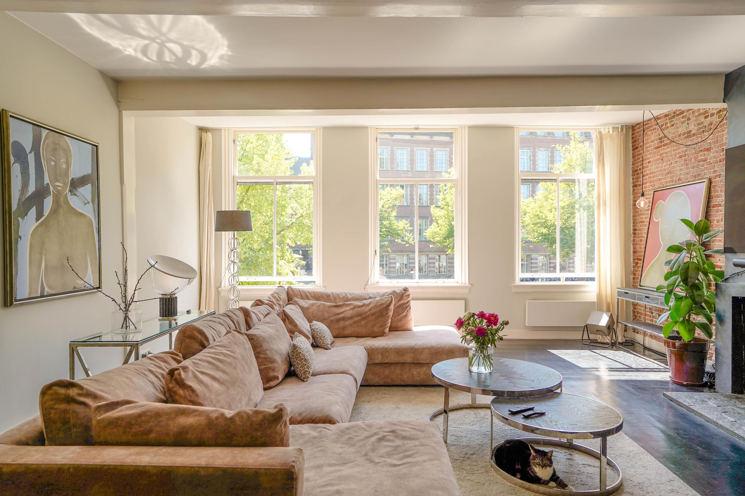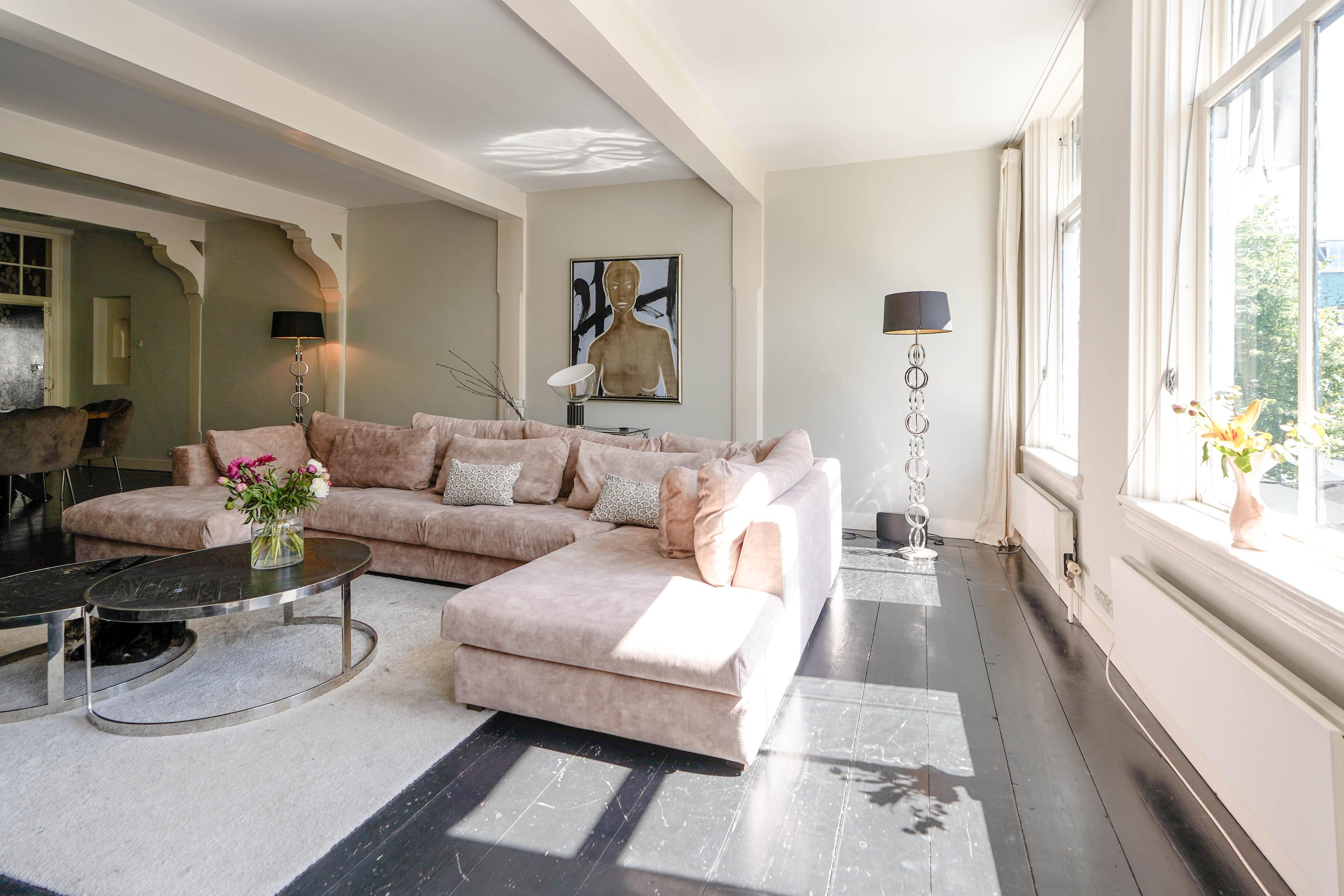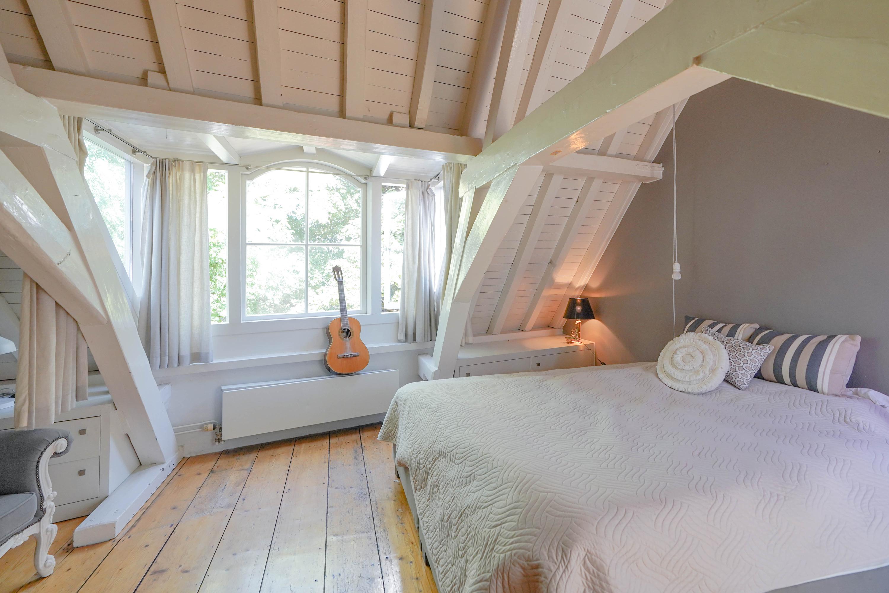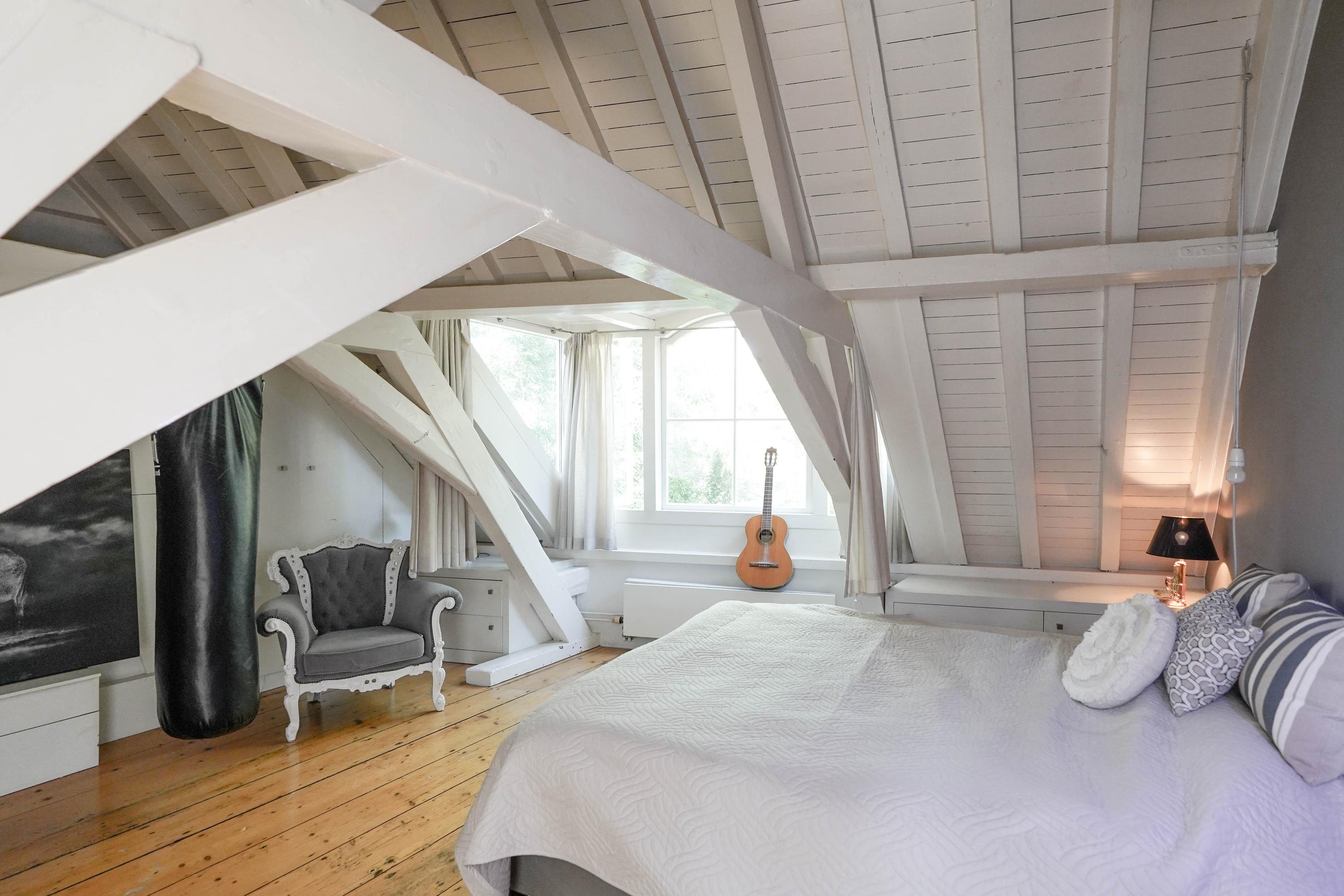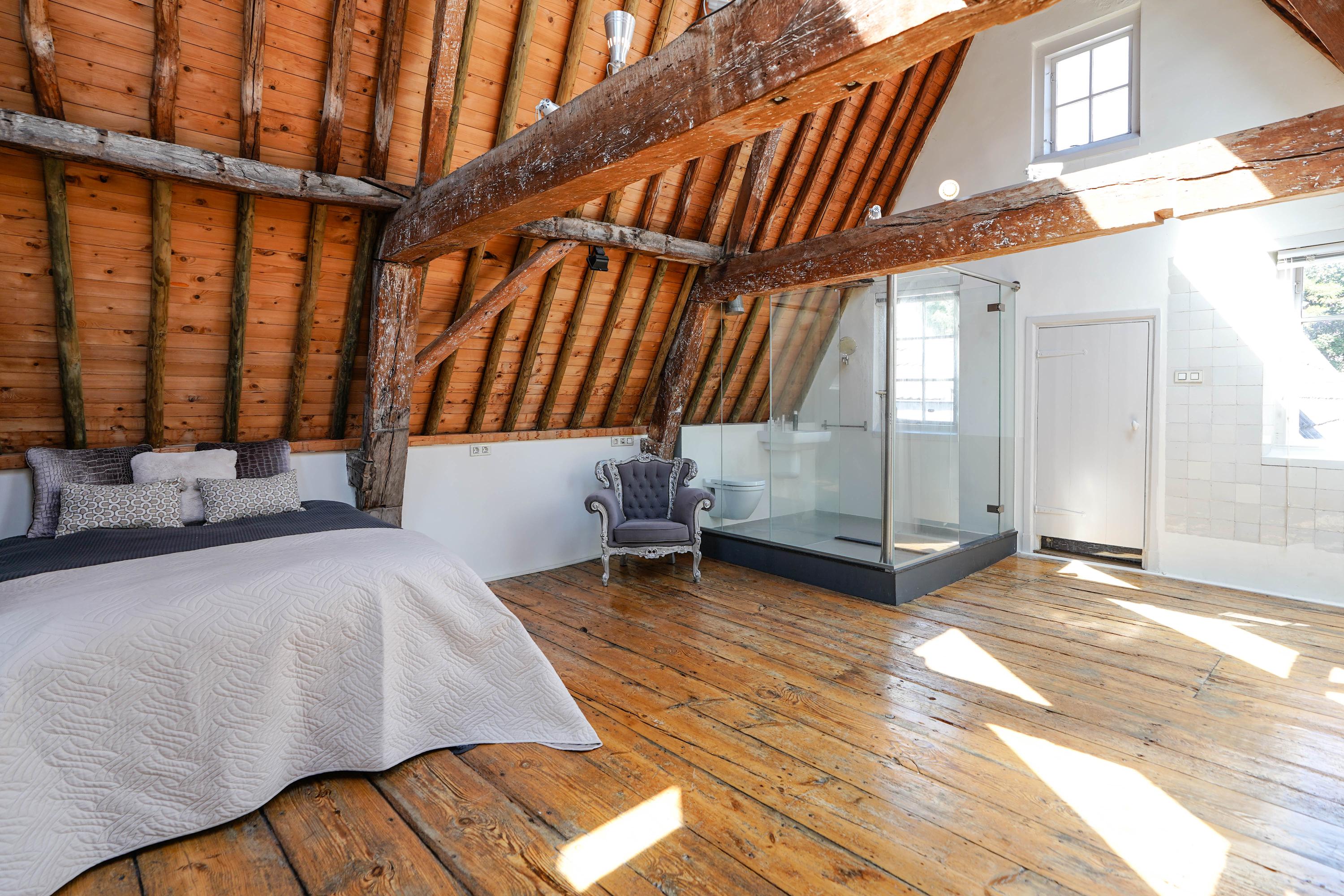 The front house is the original main house. The ground floor houses a shop (which is also available for purchase), and the first floor now houses the 70 m² living room, which overlooks the Rhine and Stadhuisplein. At the rear is the kitchen/diner with space. A lot of space. With 50 m², long worktops and a dining table that seats 12, this is now the heart of the house. From here there is also one of the passages to the back house along the courtyard, which provides a lot of light. The sleeping floors are one floor higher. Here the house has been peeled back to the structure with the beautiful wooden siding roof in full view. High Velux windows have been installed between the tracks, providing beautiful light at any time of the day. At the front you will find three bedrooms, a bathroom and, above all, plenty of storage space with fitted wardrobes and a linen room, spread over two floors. At the rear, the master bedroom with ensuite bathroom covers the entire roof with a ridge of no less than 8 meters high.