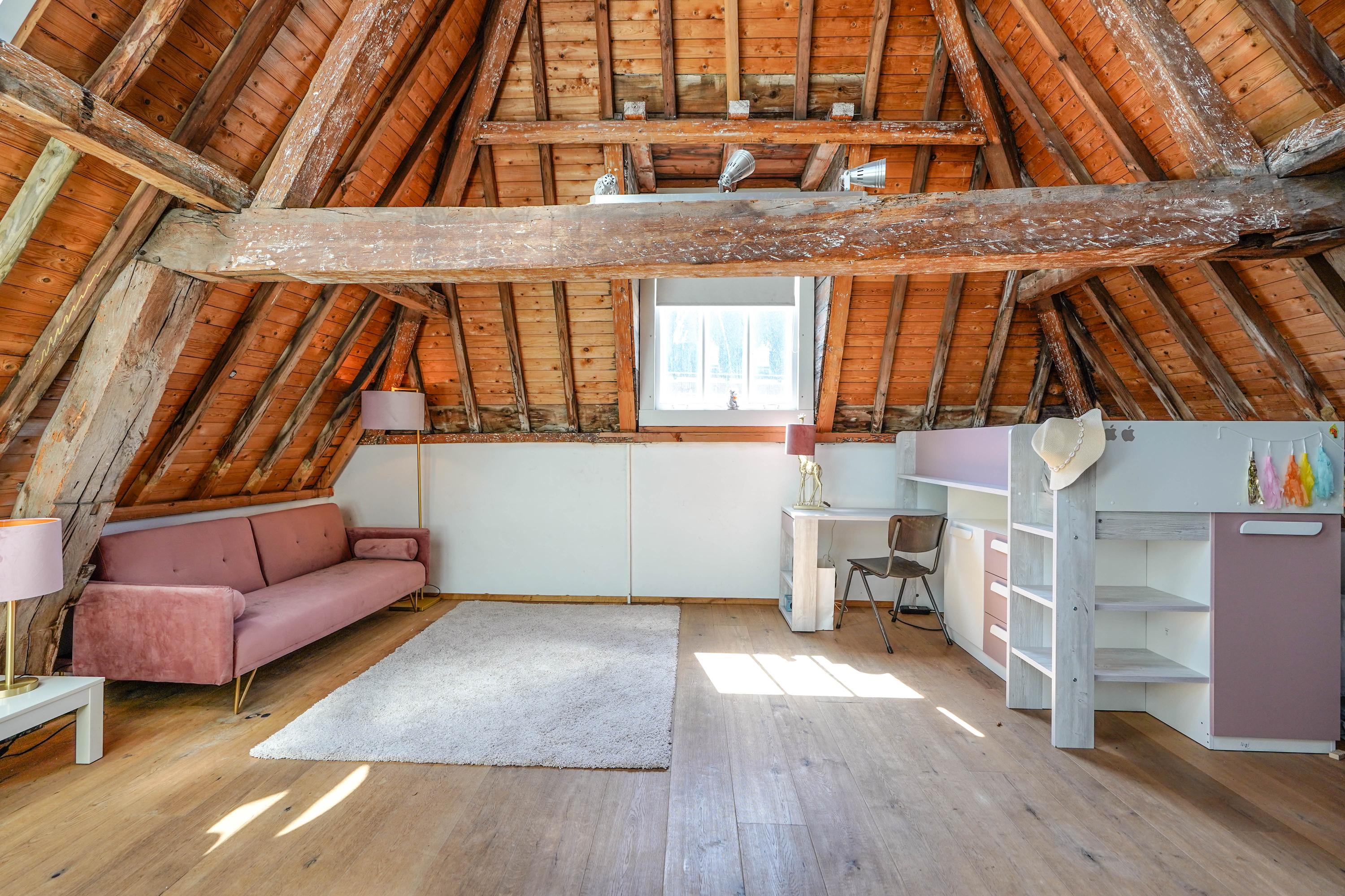 This example of 17th-century wealth is located along the water of the Rhine at the foot of the castle hill. As usual at that time, the face of the facade was modest, almost even subdued. However, this was more than compensated for inside. The prosperity was exuberantly displayed: richly decorated natural stone fireplaces and opulent stuccowork adorn the ground floor. After all, this is where guests were received and people had to impress. Although the centuries have passed, much of the original wealth of this building has been retained and the current owner has completely modernized it. In addition, both floors and the rear house are characterized by large and high rooms, where heavy oak beams and impressive roof structures with large and high windows provide light and views.