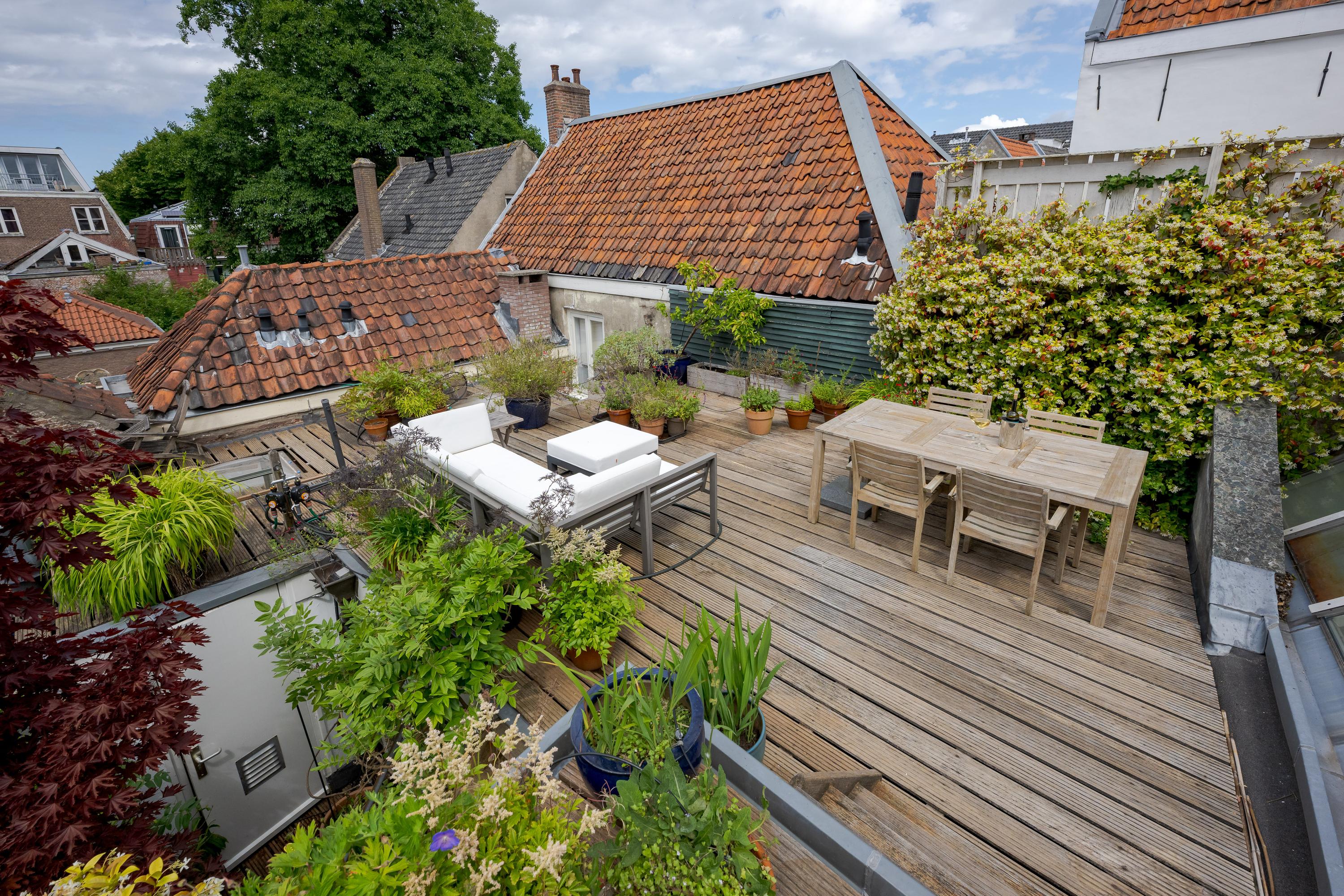 What also makes this property unique is the remarkable combination of a stately, classic façade on the canal side (three windows wide, facing south) and a surprisingly spacious rear garden of over nine meters. On the first floor, at the heart of the house, lies a colorful courtyard garden, and a dozen steps up, a spacious and sunny roof terrace with plenty of privacy and several seating areas.