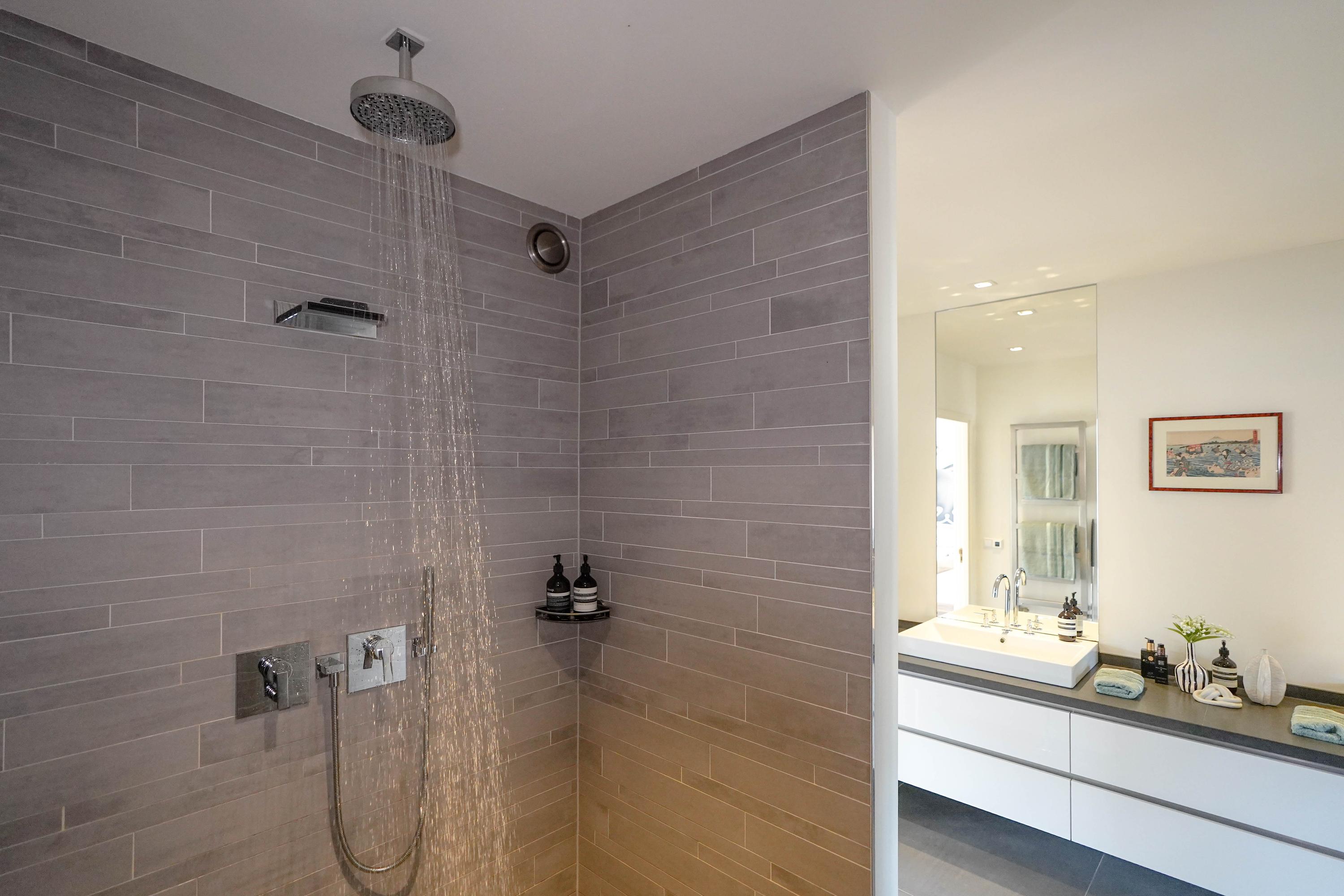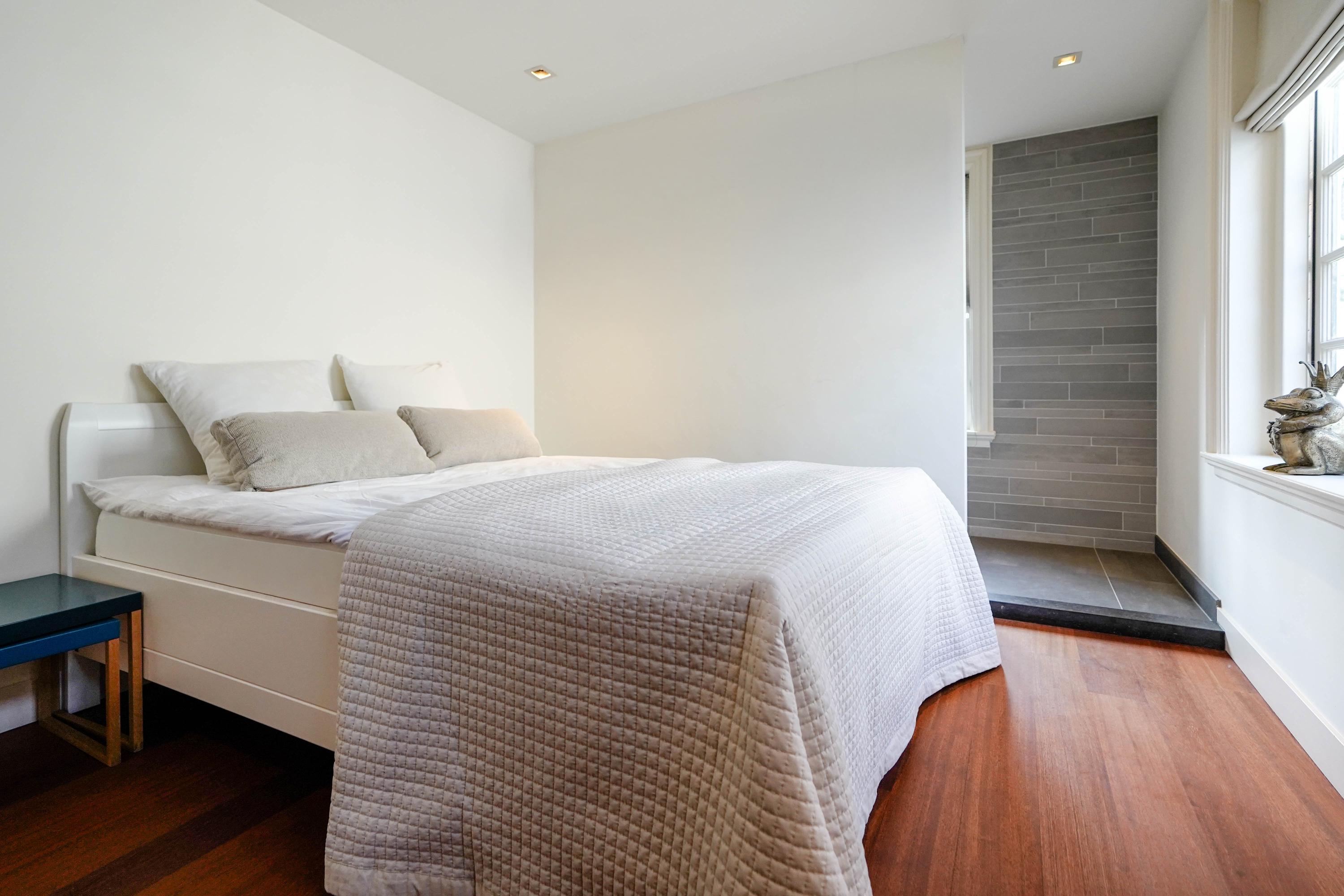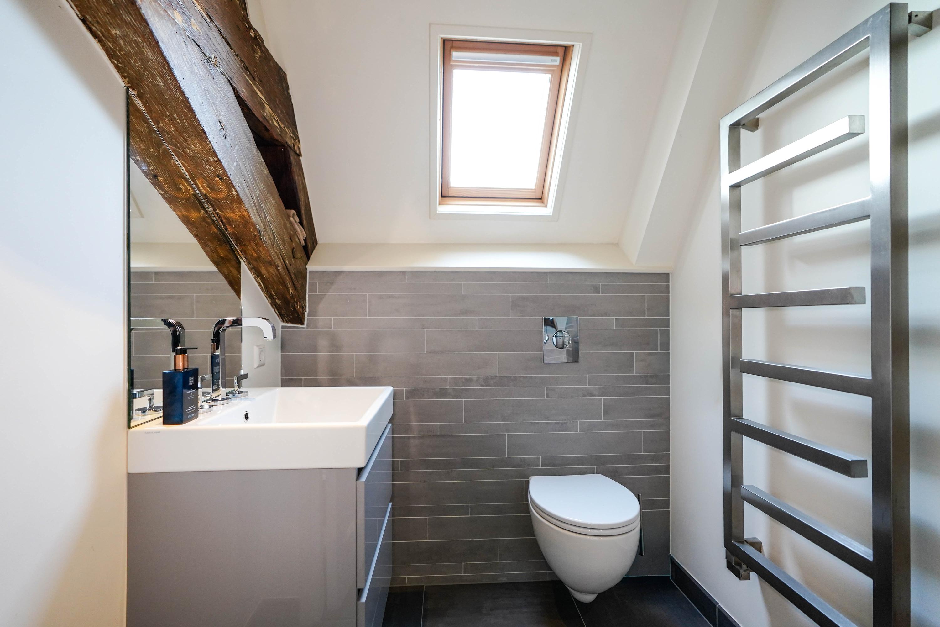 a bedroom with a modern en-suite bathroom, as well as a separate toilet. At the