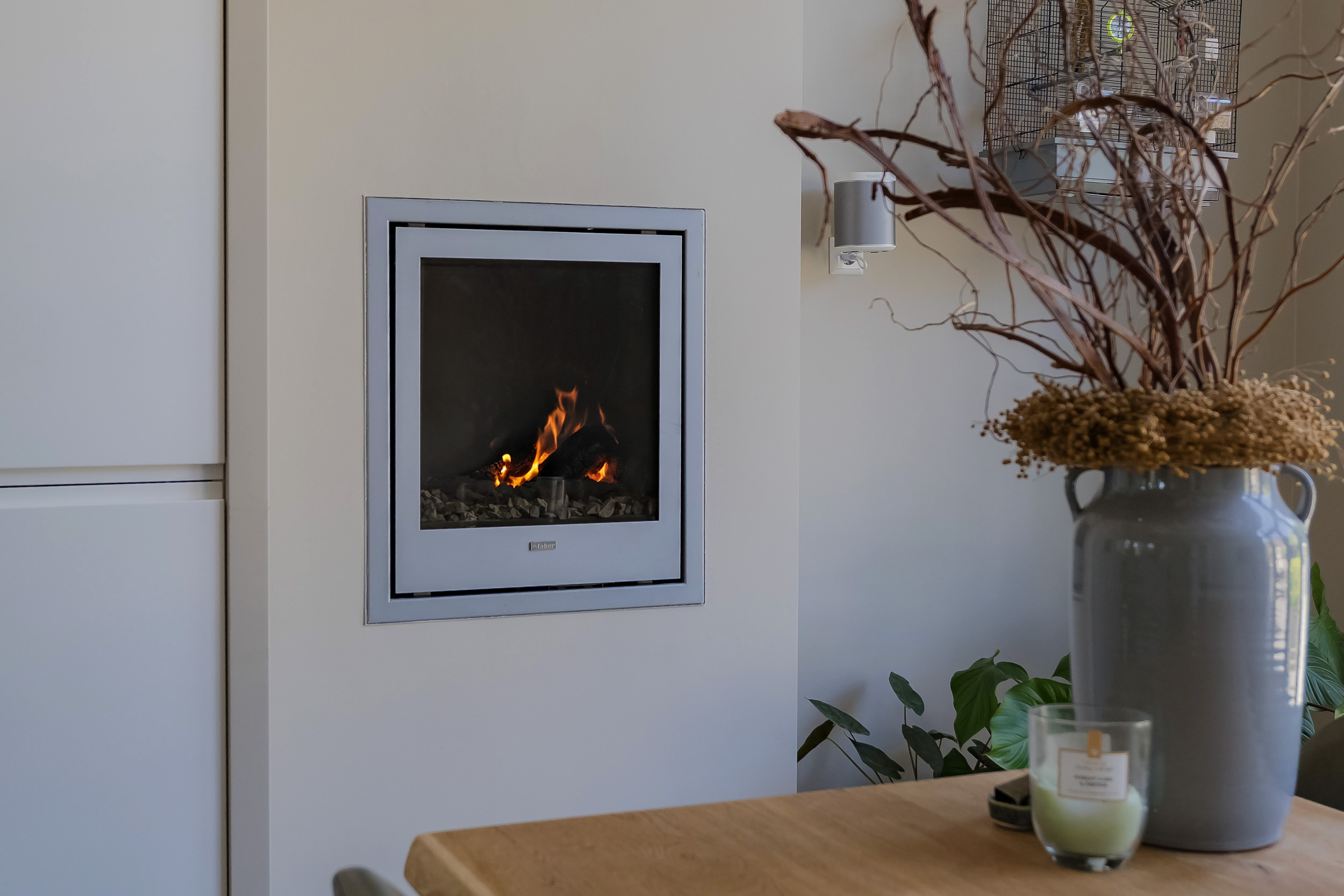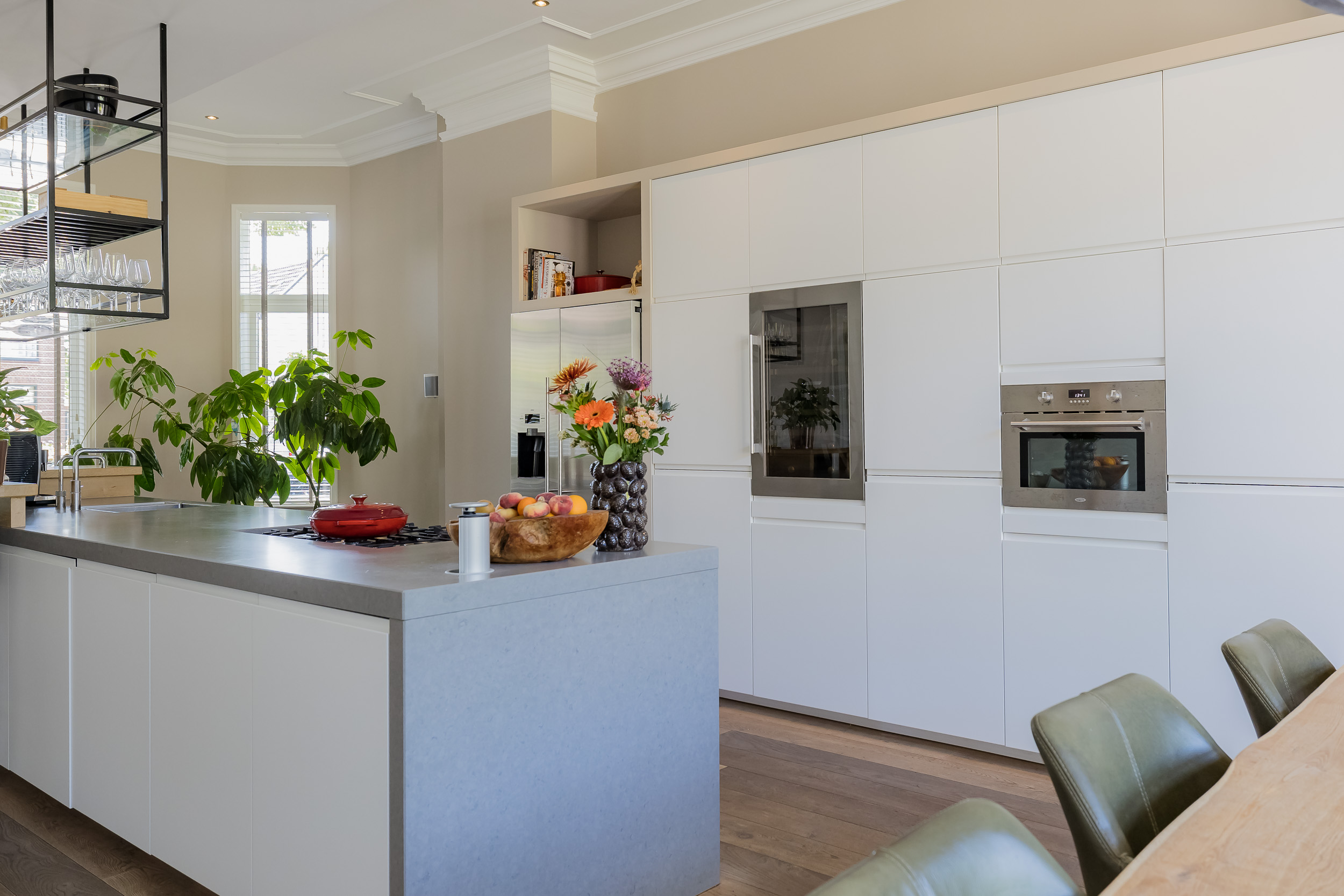 Beautiful porch in which the striking high front door, imposing long hall with the restored authentic granito floor, checkroom and toilet room and a door to the garden. To the left of the hall a very spacious living/living kitchen with luxury kitchen design in matte white, beautiful cooking and sink island with wooden breakfast bar and all appliances including a beautiful wine refrigerator. Also a cozy gas fireplace and the large rear facade with lots of glass and French doors to the garden are not lacking. To the right of the hall there is a TV/sitting room with a gas fireplace and double doors give access to the upstairs room. This upstairs room with a large custom-made closet wall is very suitable as a play/or work room and has a staircase to the large dry cellar with standing height. In the former cell complex is a beautiful study created, a storage room, a technical room and there is one cell preserved in its original state. The indoor garage is large and includes an electric segment door with wicket door and a fixed staircase to spacious storage attic.