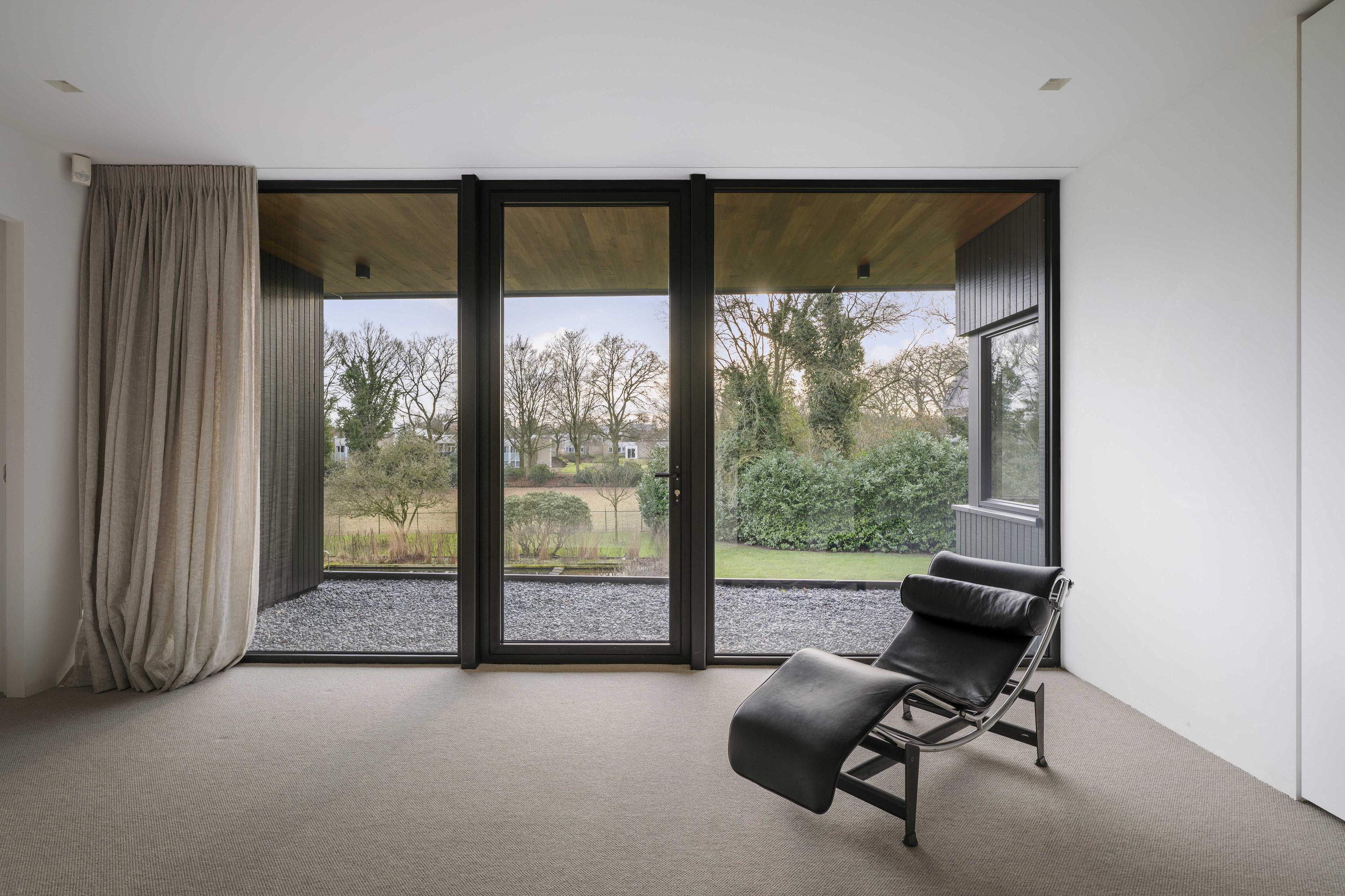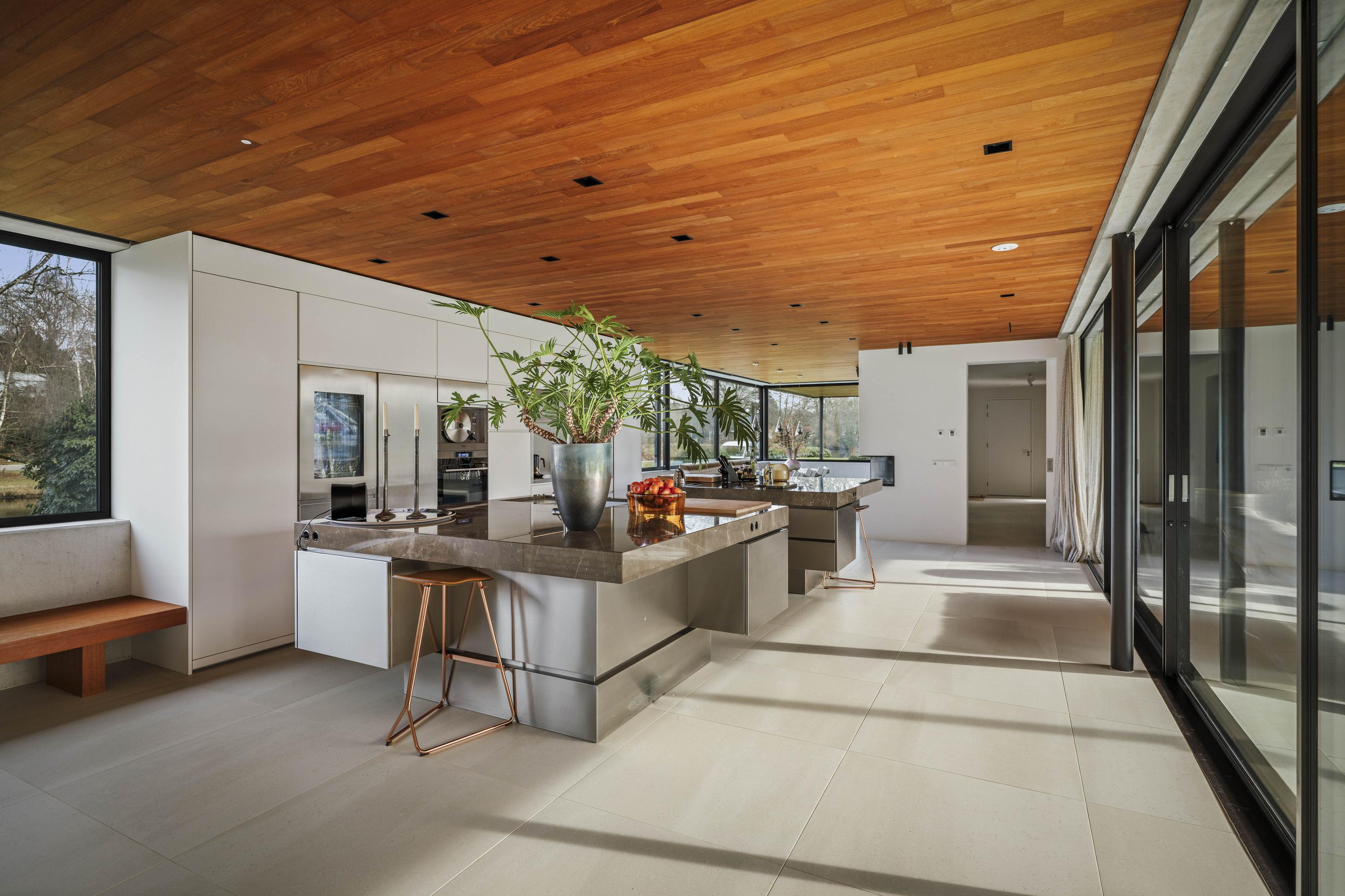 The kitchen (88 m²) forms the heart of the house. From this room, the view is impressive at both the front and rear. Floor-to-ceiling windows and sliding doors connect the kitchen directly to the covered terrace, which is furnished with a sitting and dining area and an outdoor fireplace by Metalfire. The terrace is the family's favourite spot; in winter it is a sunny place due to the low light incidence and in summer it is a pleasant lounge area in the shade and shelter. Thanks to the canopy and the outdoor fireplace, this is a place where you can comfortably spend most of the year.