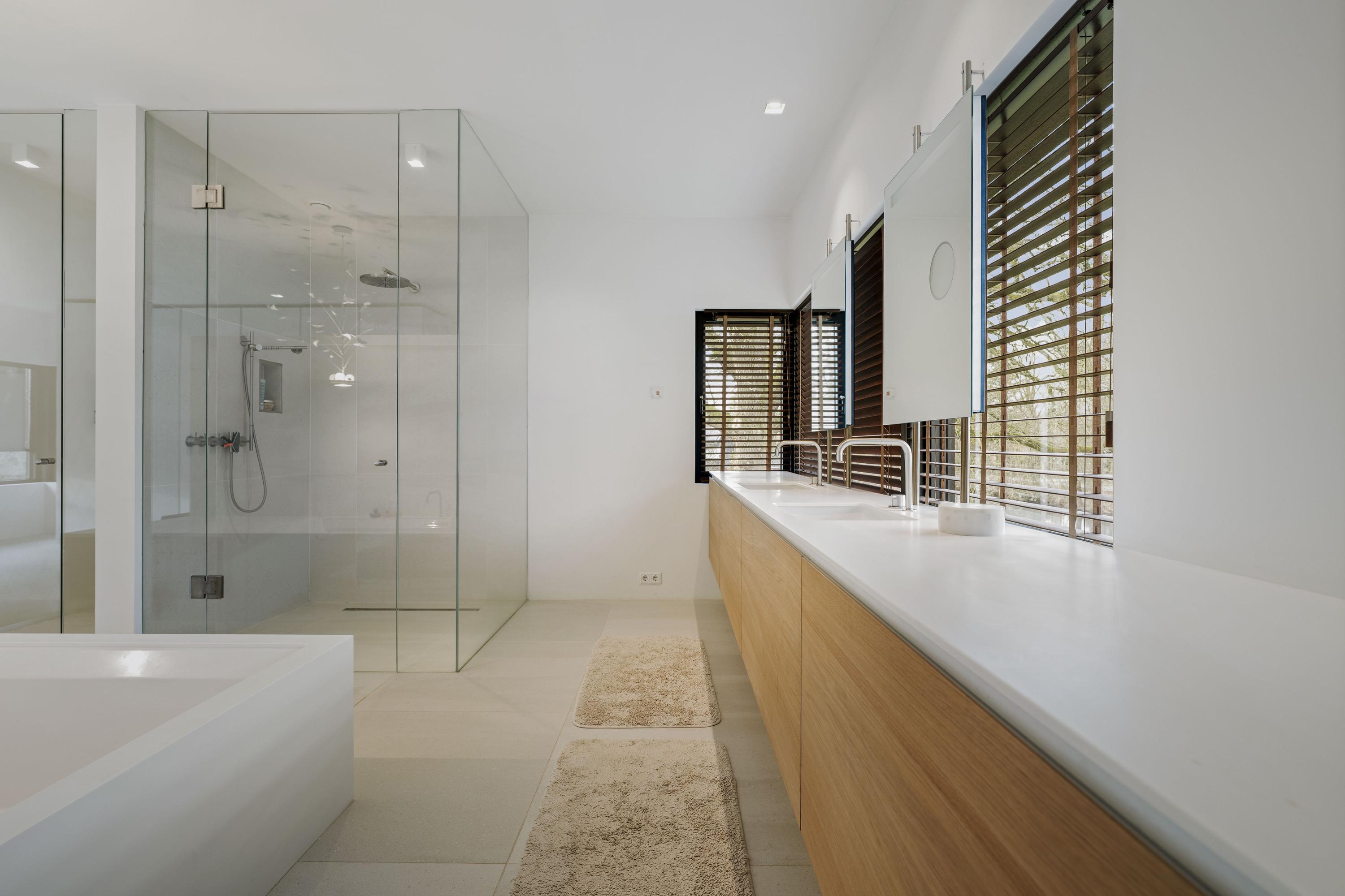 Inside, travertine-coloured Mosa floor tiles and oiled teak ceilings create a warm atmosphere. Floors and ceilings extend to the outside, creating a sense of unity between the kitchen and terrace. The kitchen, designed by Roel de Vos Design Studio, features two spacious islands with marble tops (olive brown) and stainless steel bases. The appliance wall is finished in matt white with stainless steel and includes a refrigerator, freezer, two-zone wine climate cabinet, a convection oven and a steam oven. The induction hob with integrated extractor is incorporated into the cooking island. Custom-made teak benches match the look of the ceiling and reinforce the harmonious character of the space. Underfloor heating on all three floors ensures a pleasant indoor climate - warming in winter and cooling in summer.