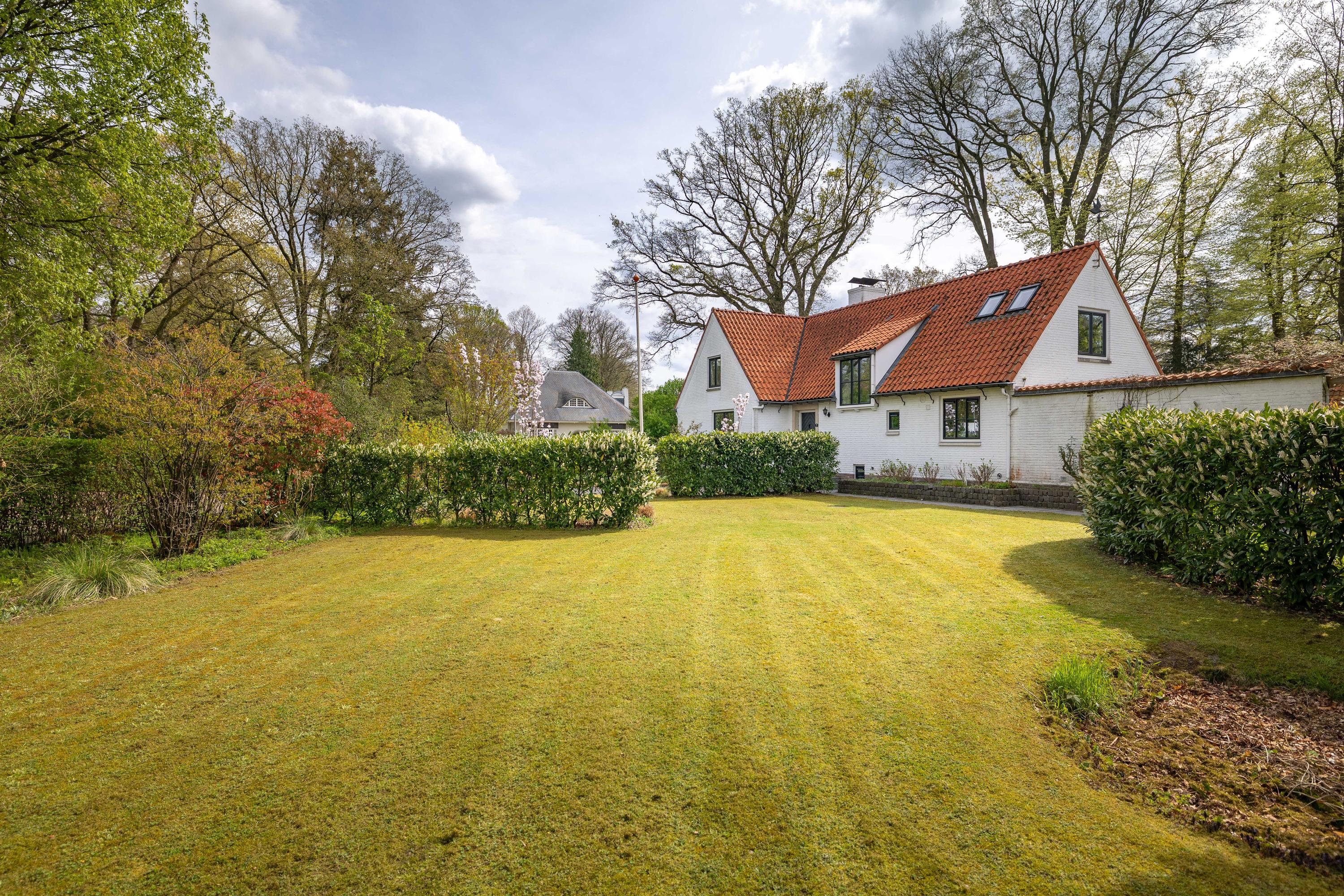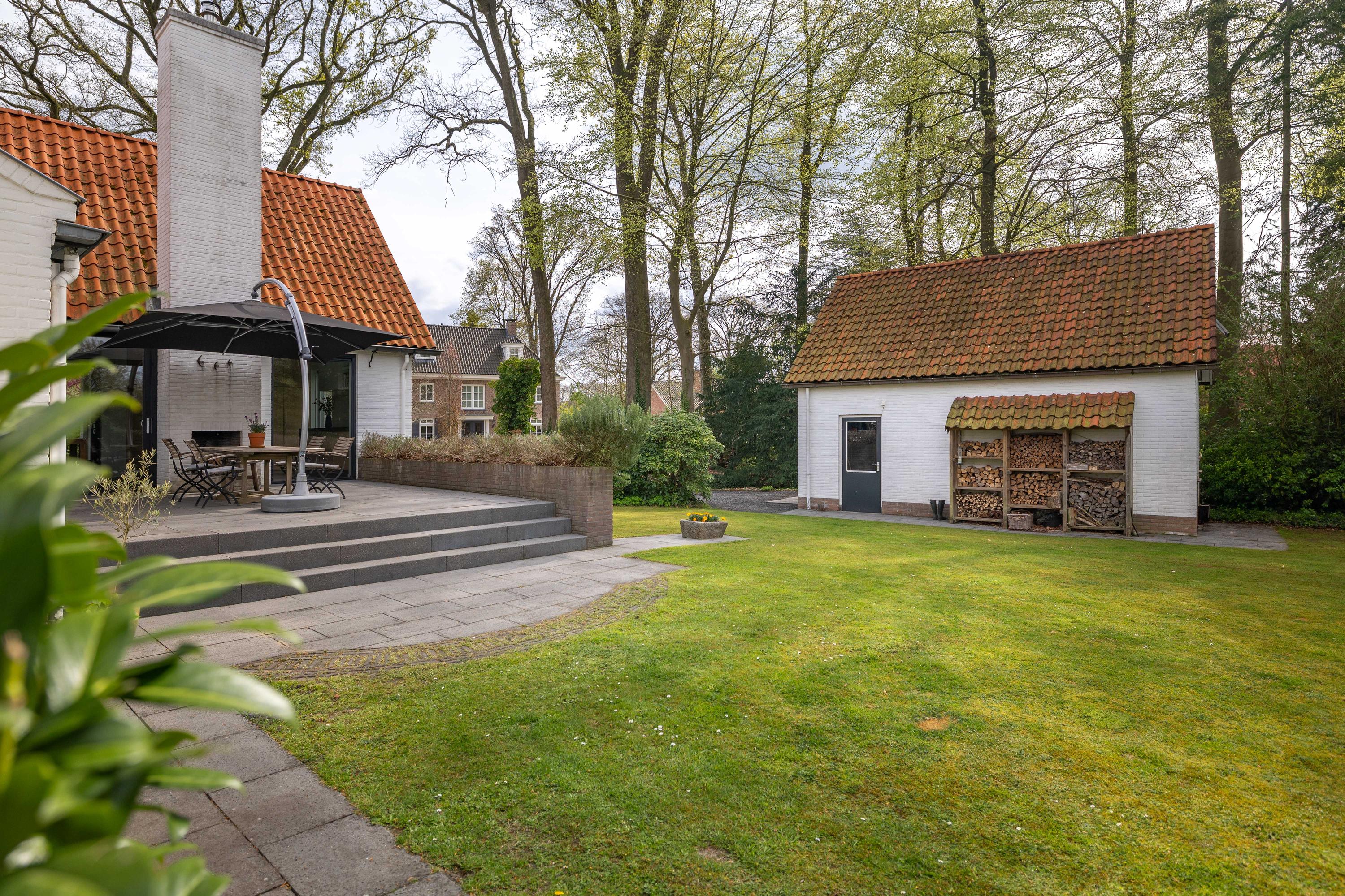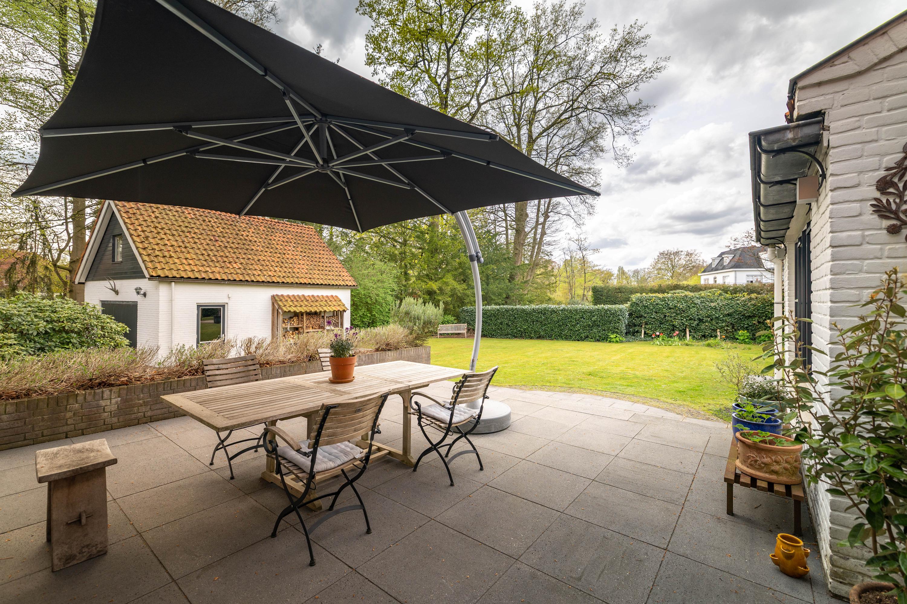 At the rear of the house lies a wonderful garden with expansive lawns, large laurel hedges, beautifully landscaped borders and attractive terraces. One terrace behind the kitchen features a charming outdoor fireplace, providing a delightful setting for long summer evenings with family and friends. There is also a cosy veranda with a large terrace and ample space for a lounge set.