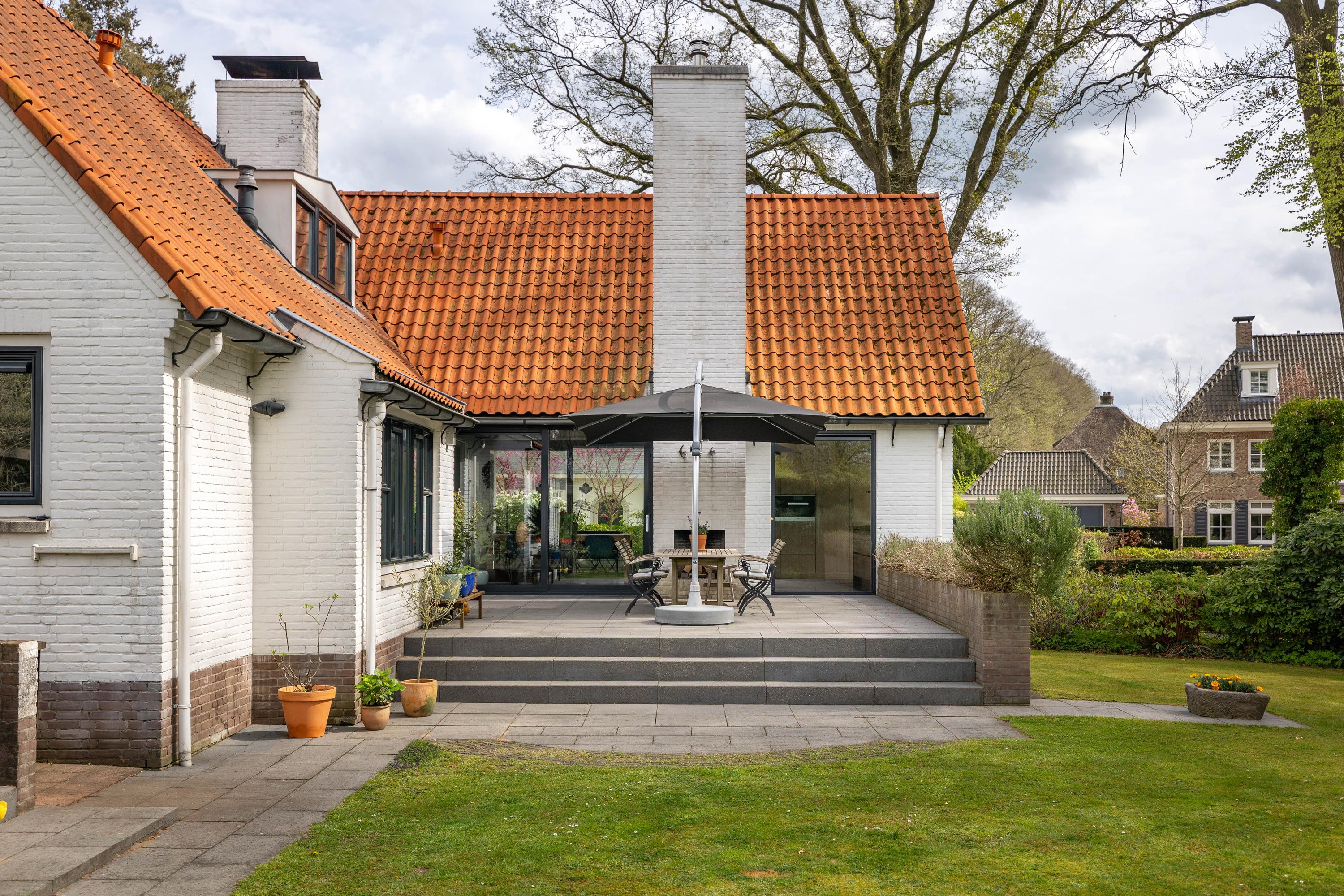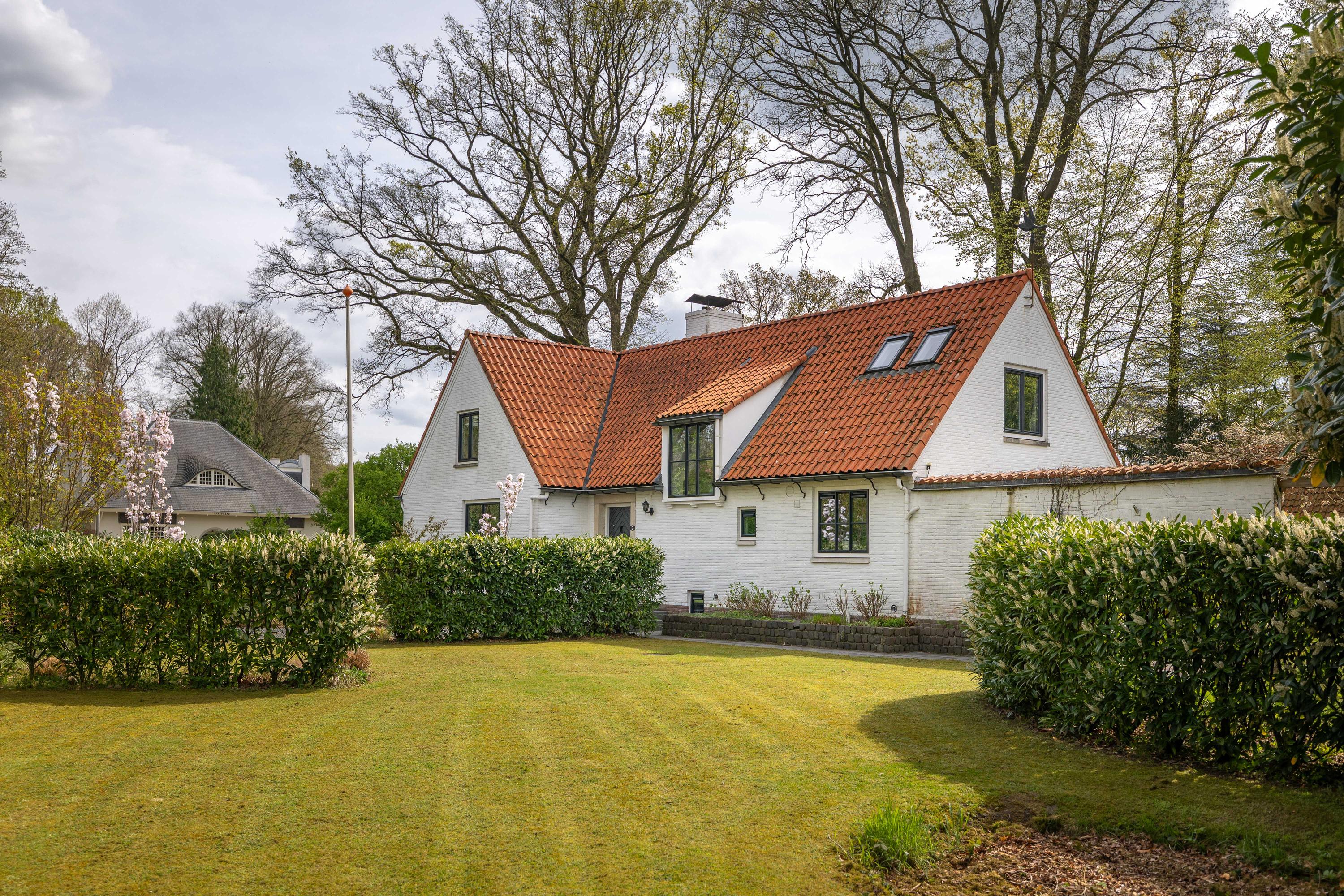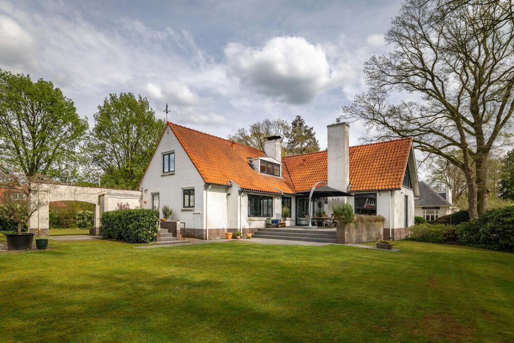 At the rear of the house lies a wonderful garden with expansive lawns, large laurel hedges, beautifully landscaped borders and attractive terraces. One terrace behind the kitchen features a charming outdoor fireplace, providing a delightful setting for long summer evenings with family and friends. There is also a cosy veranda with a large terrace and ample space for a lounge set.