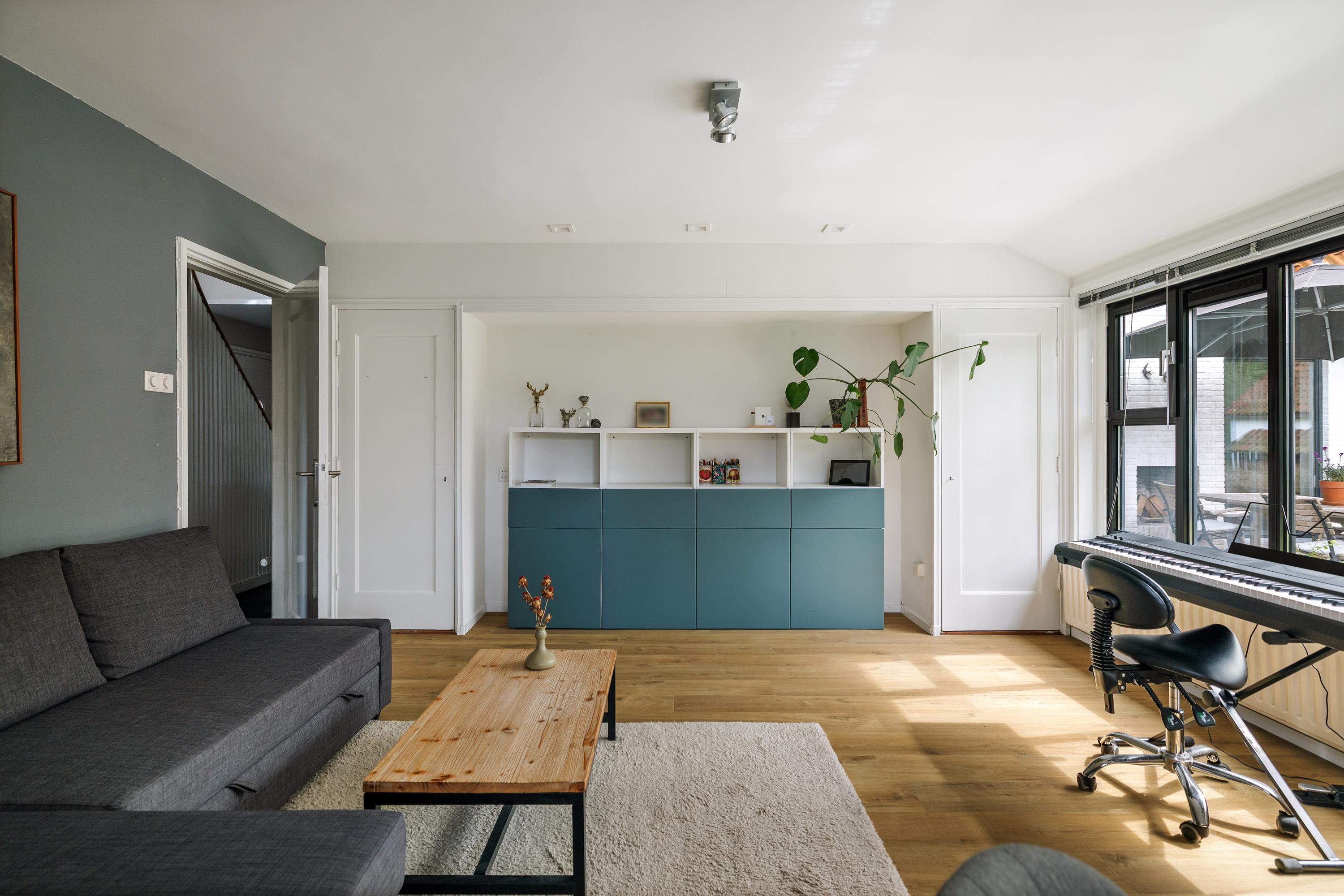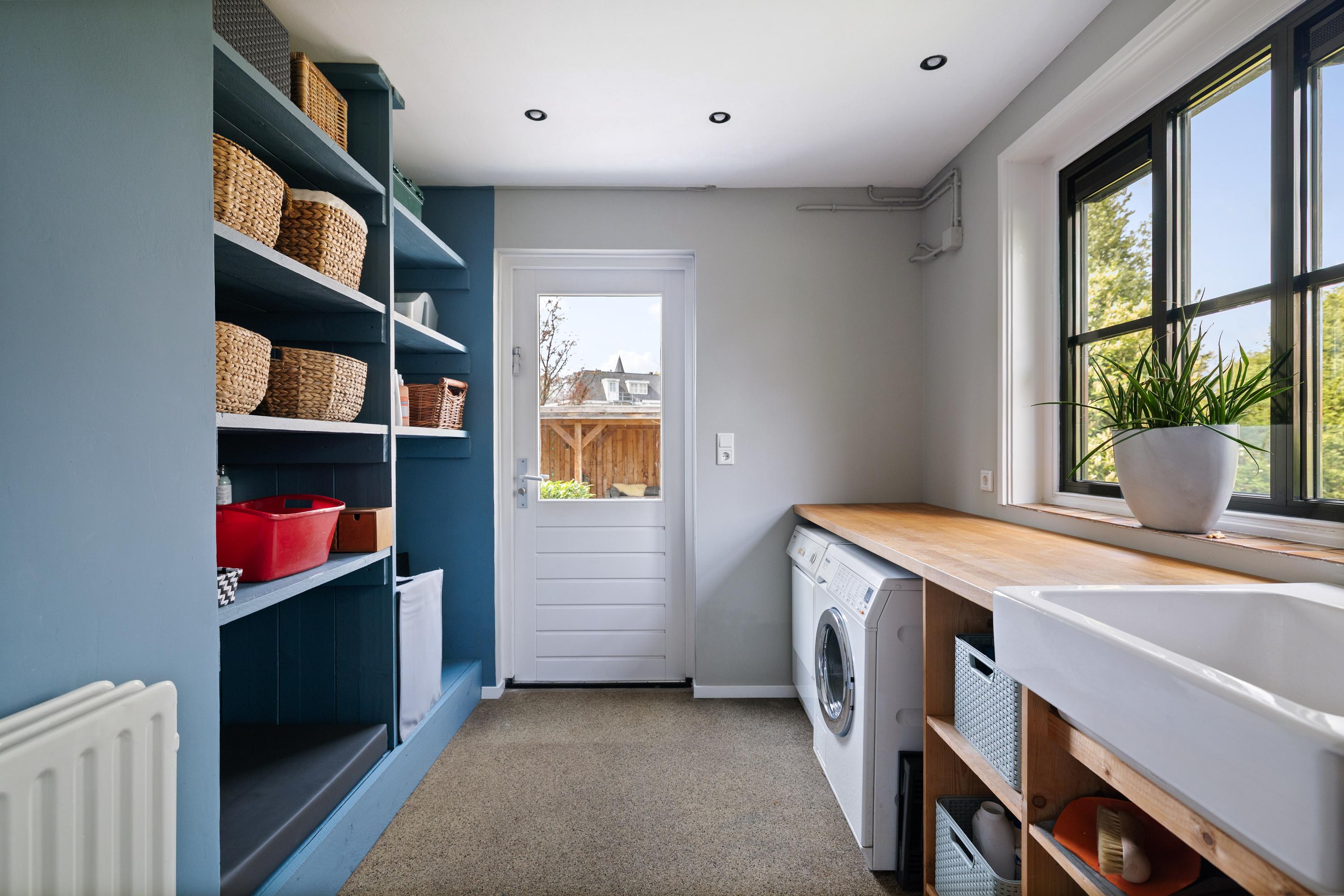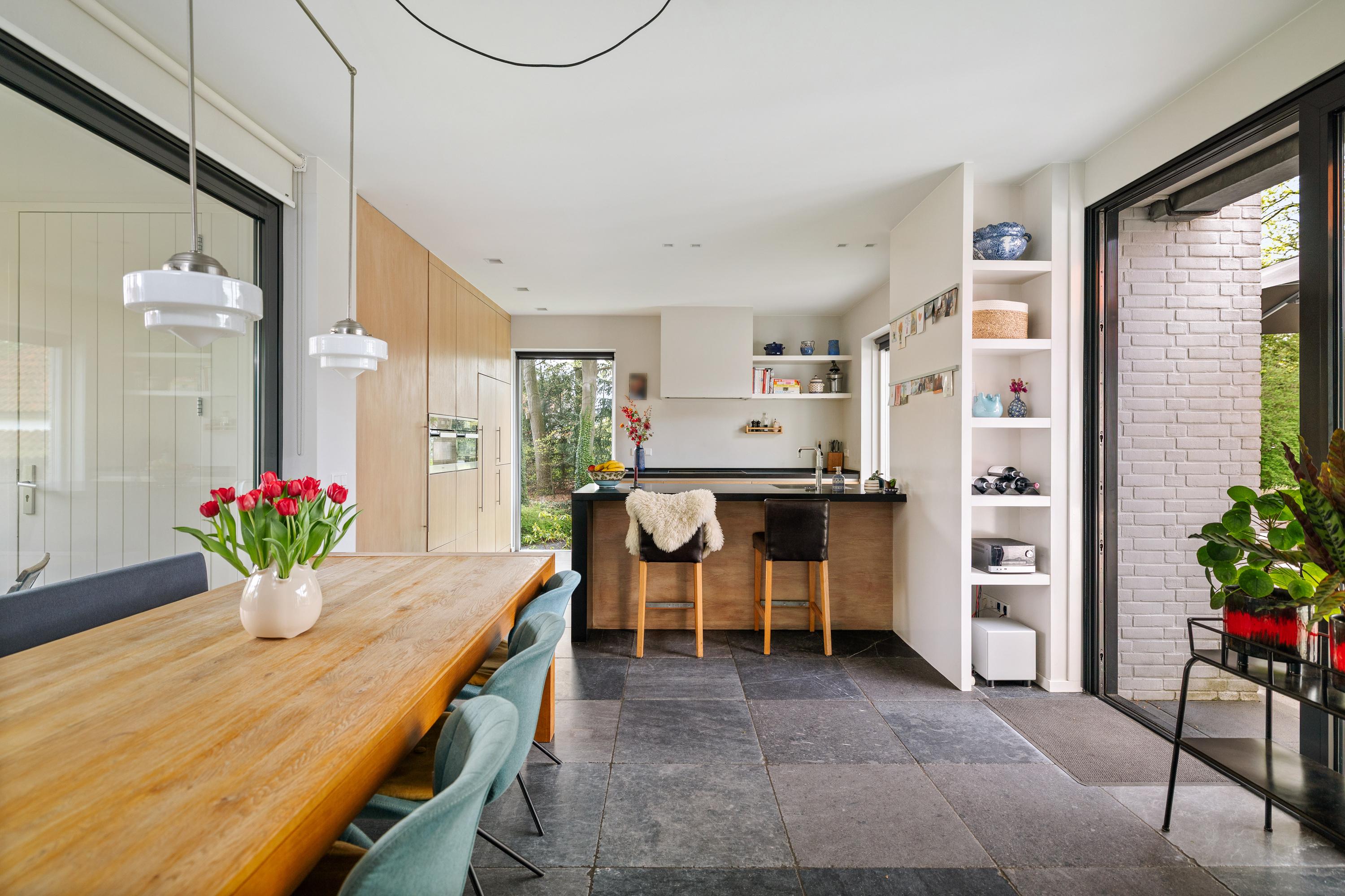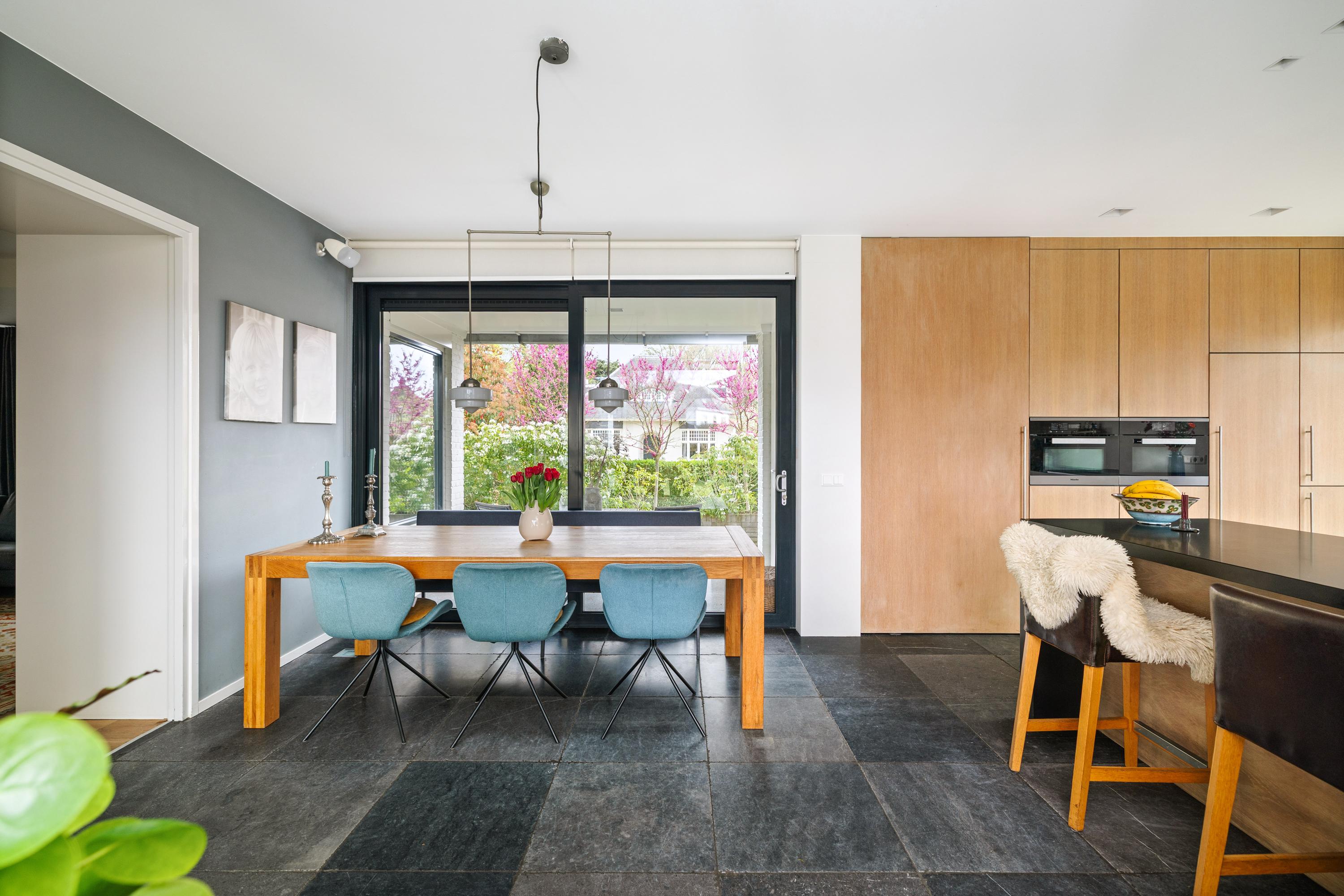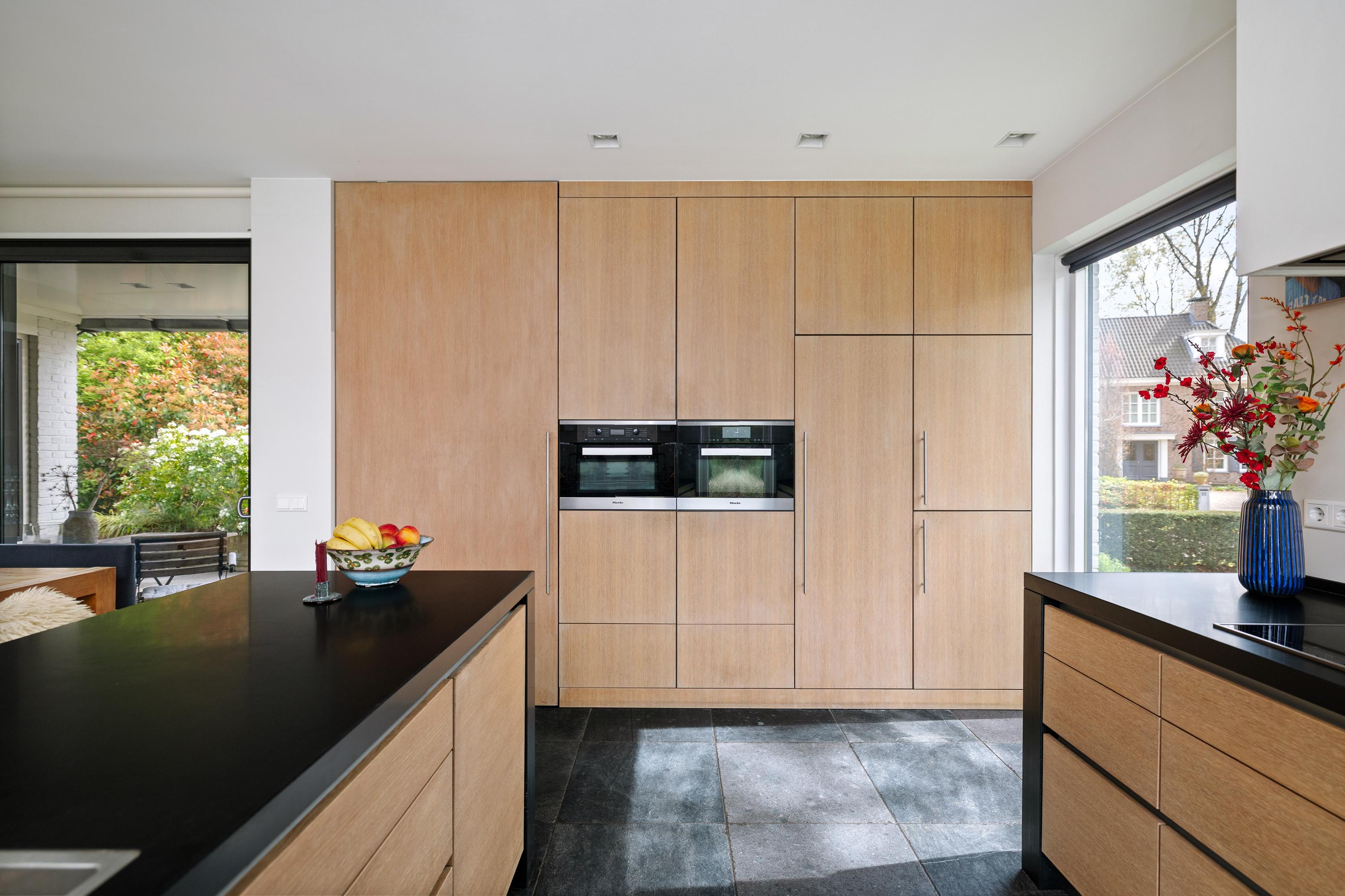 The sunny kitchen-diner (by Hans Croes Keukens en Interieurwerken) is located in the recent extension, designed by architect Ed Bergers (BVAB Architecten). Sleek, contemporary and filled with natural light, the kitchen features classic natural stone floor tiles with underfloor heating, creating a chic contrast with the oak cabinetry and light-coloured walls. The kitchen includes a central island with an anthracite composite worktop, a boiling-water tap, dishwasher and ample storage. Two bar stools make it an inviting place for a drink while cooking. The appliance wall contains a steam-assisted oven and combi microwave (both Miele), a large fridge and freezer, along with extensive cupboard space. Behind the kitchen is the second entrance, the so-called “back entrance”, with a hallway and four tall built-in cupboards.