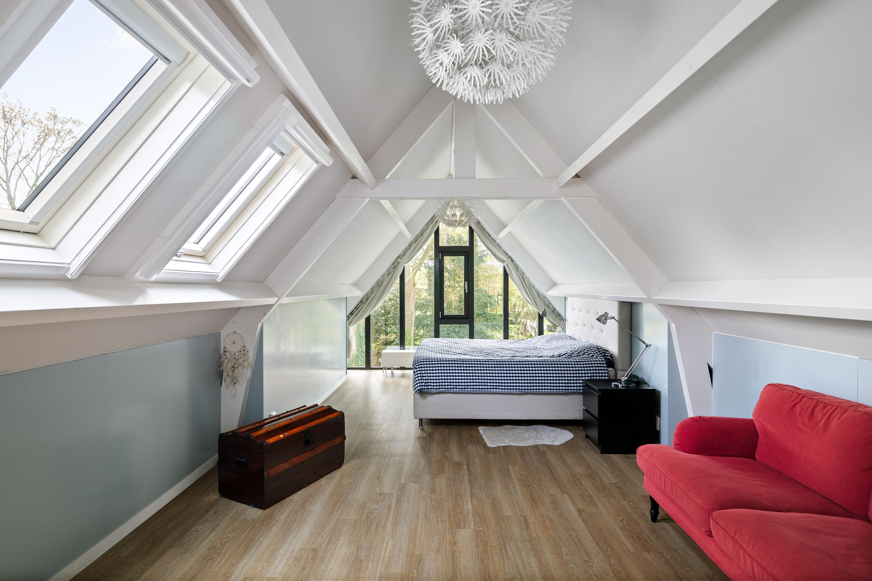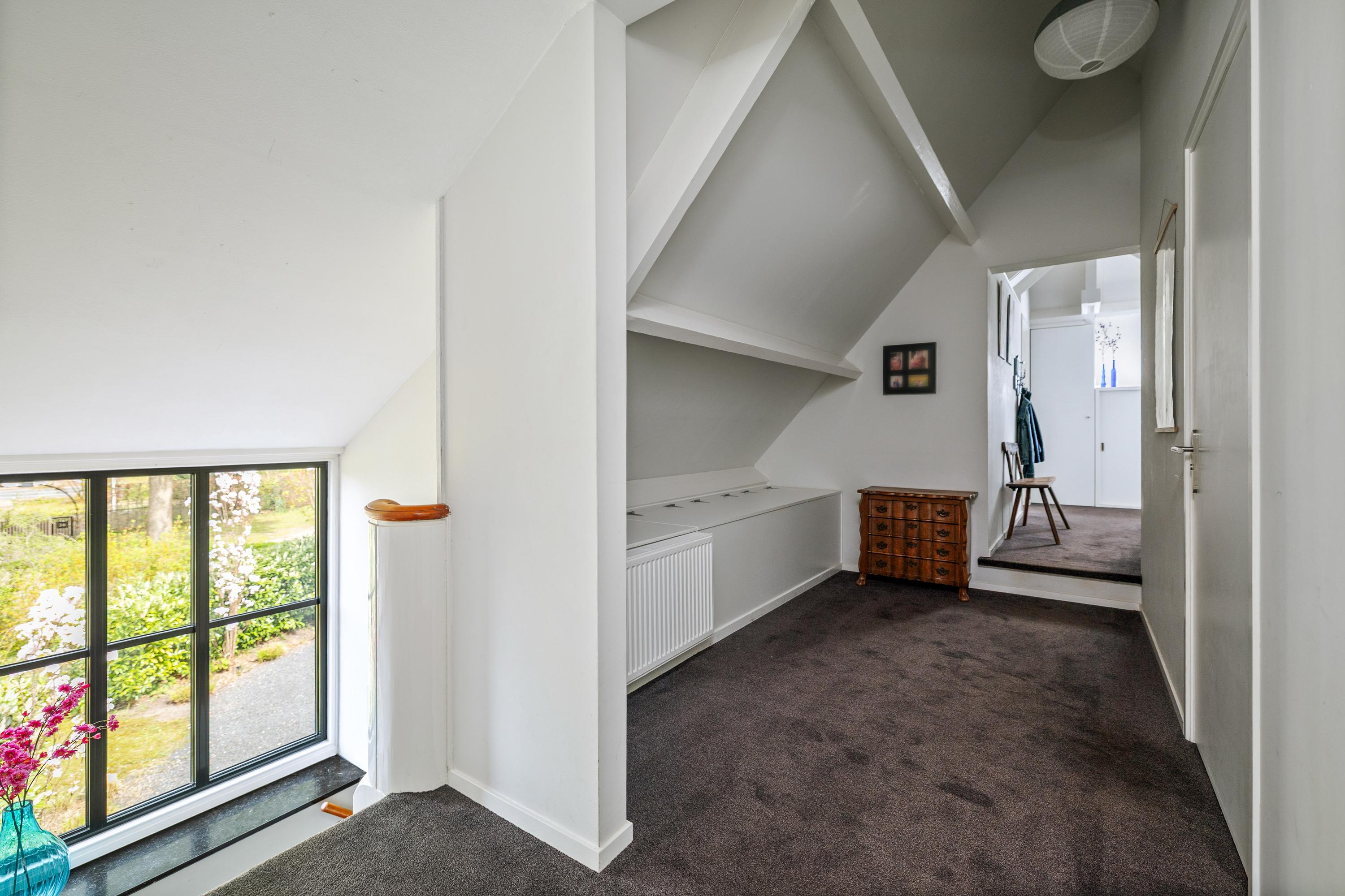 The landing offers ample storage space behind the knee walls as well as cleverly integrated built-in cupboards. The bedrooms also feature built-in storage. The main bedroom boasts a striking, fully glass wall, offering a spectacular view of the surrounding greenery.