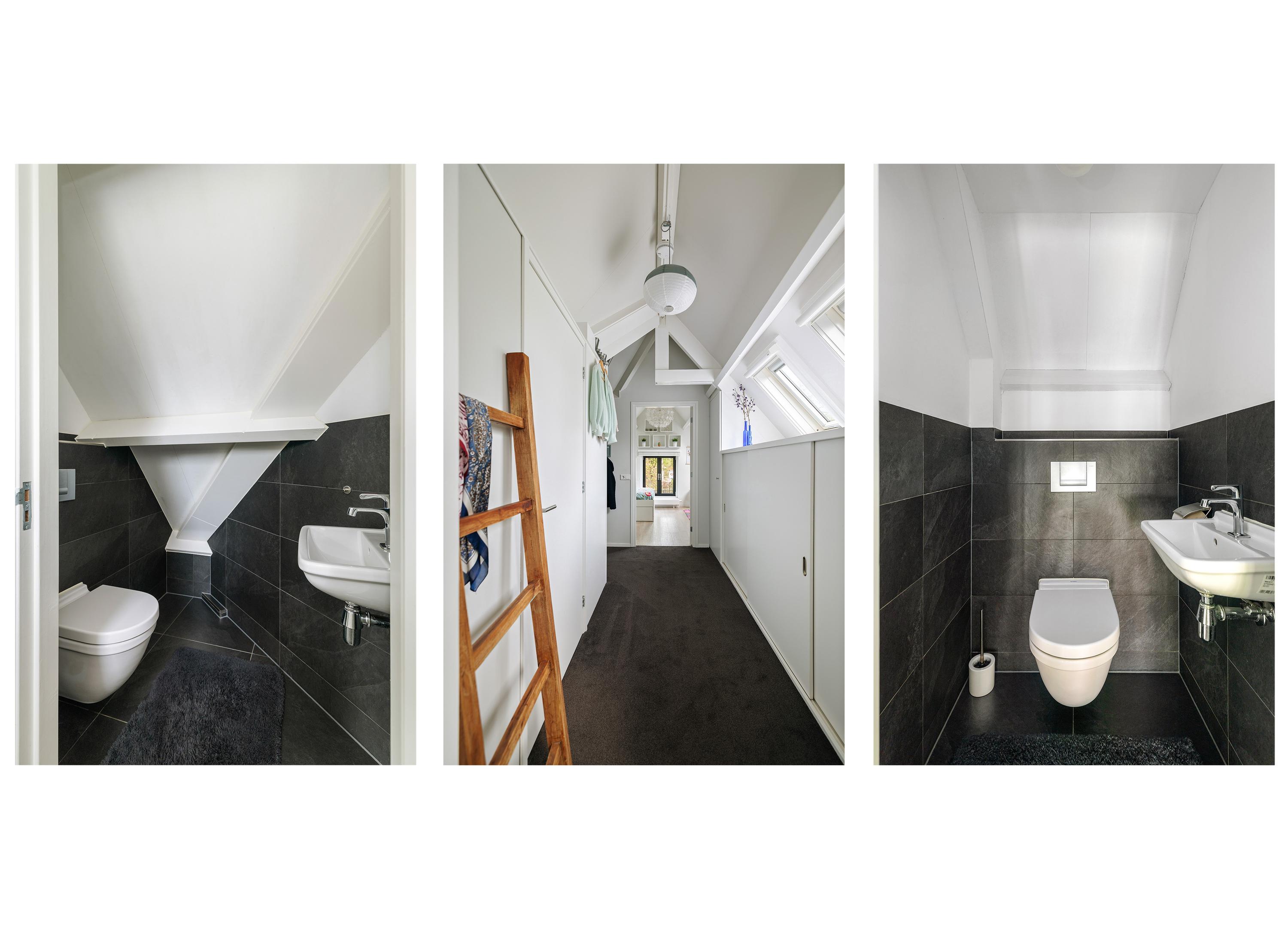 The same light and fresh design style continues upstairs. The staircase leads to a spacious landing with three large bedrooms, each fitted with a wood-look PVC floor, two separate toilets and a bathroom with a generous walk-in shower and double washbasin.