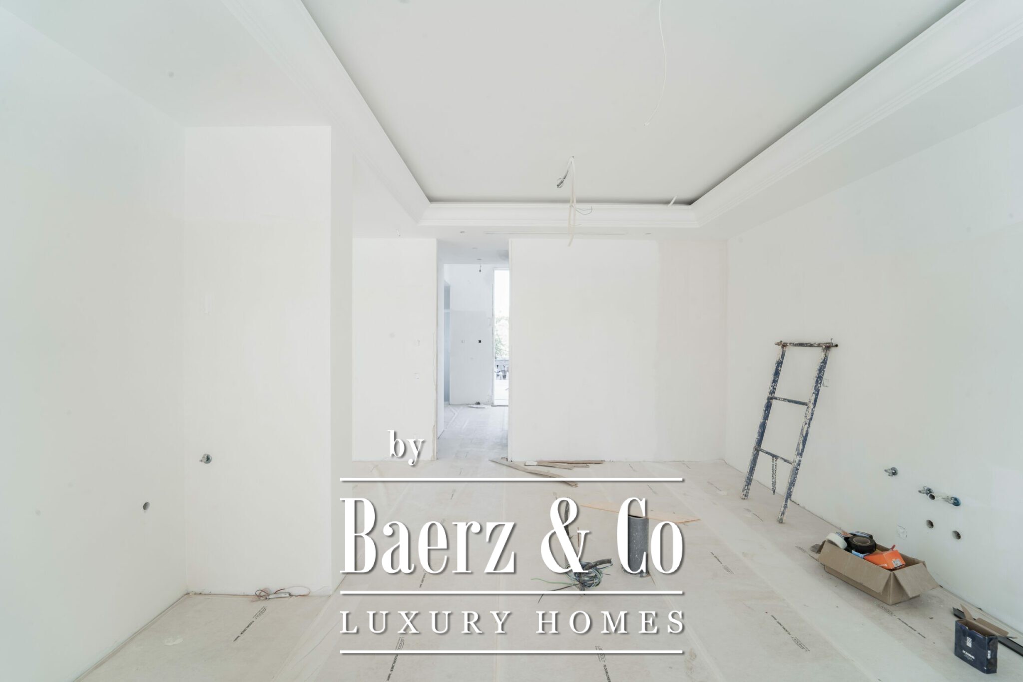 A double-height entrance and contemporary pillars lead to interior spaces arranged with quiet confidence. The main floor flows seamlessly between a large living room anchored by a fireplace, an elegant dining area, and a fully equipped kitchen with bespoke island and premium appliances. Expansive terraces open to a heated saltwater pool and lush landscaped gardens, crafted for private enjoyment and relaxed gatherings.