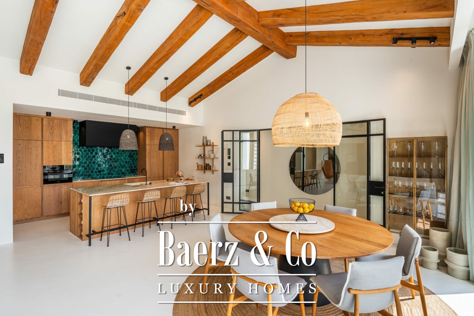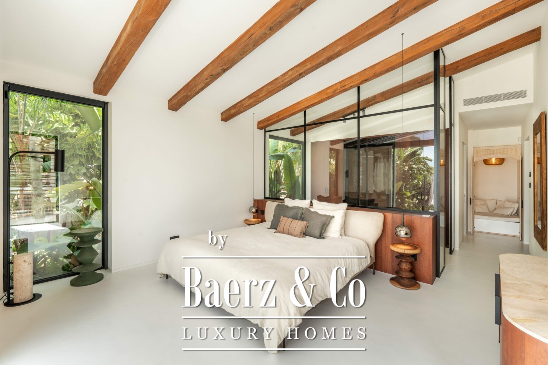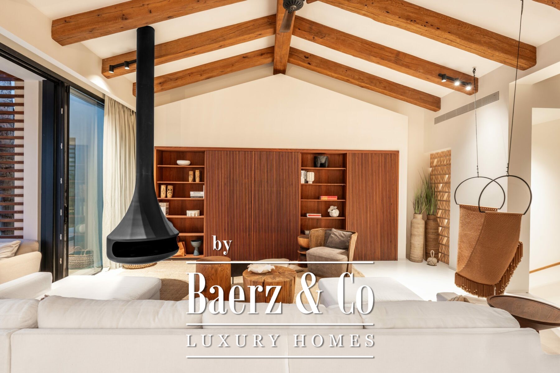 Spanning 365 m² on a plot of 1,025 m², the villa is shaped by expansive windows, high gabled ceilings with natural wooden beams, and polished white cement floors flowing seamlessly through all spaces. Five bedrooms and seven bathrooms are thoughtfully distributed, each benefitting from abundant light and uninterrupted outdoor connection. The main living room forms a dynamic centerpiece with its soaring ceiling, open kitchen, and floating fireplace, merging effortlessly with the shaded terrace and the stone overflowing pool at the edge of the golf course.