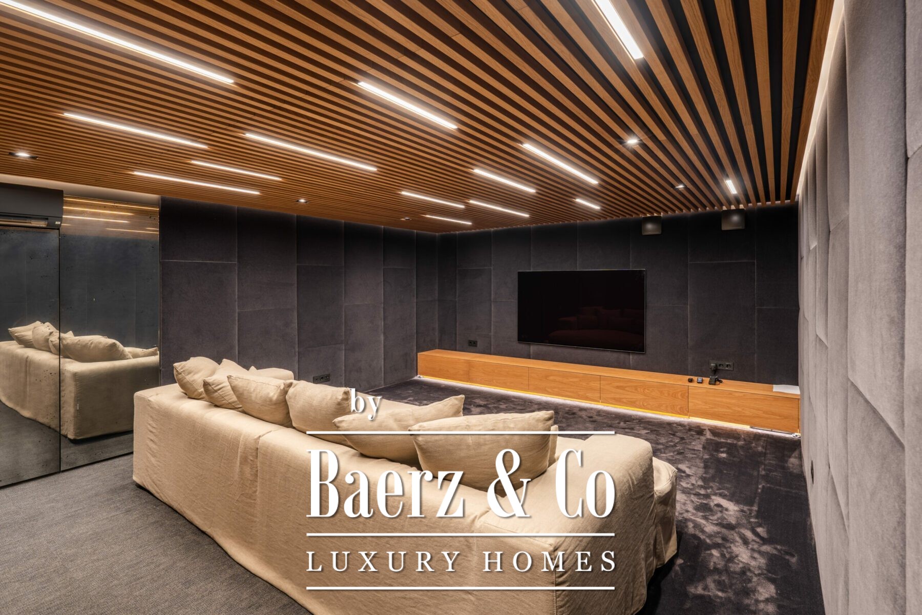 The master suite occupies a private wing, offering a statement bathroom, glass walk-in wardrobe, and a children’s retreat cloaked behind rattan doors. Further bedrooms are paired with their own living area, while the basement reveals a cinema room, large laundry, and additional bedroom. Outdoors, a wooden deck ascends to a pergola-shaded kitchen and barbecue, jacuzzi, and generous dining area—an exceptional layout for family enjoyment and entertaining. Security and comfort are assured by 24-hour security, home automation, solar panels, aerothermal climate control, and e-car charger readiness.