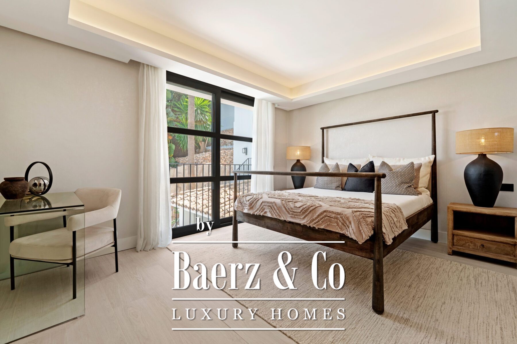 Six carefully appointed bedrooms and seven bathrooms feature bespoke finishes and natural textures. Open-plan living areas transition seamlessly to sun-filled terraces, while large windows invite views of the Mediterranean Sea and La Concha mountain into every communal space. Neutral palettes and artisanal lighting lend an atmosphere of quiet sophistication, complemented by elegant flooring and handcrafted shelving.