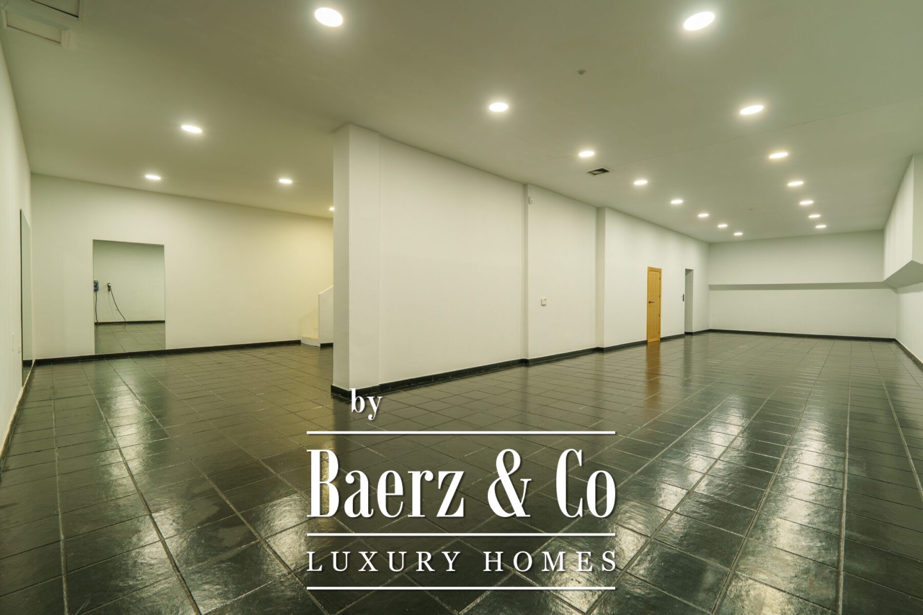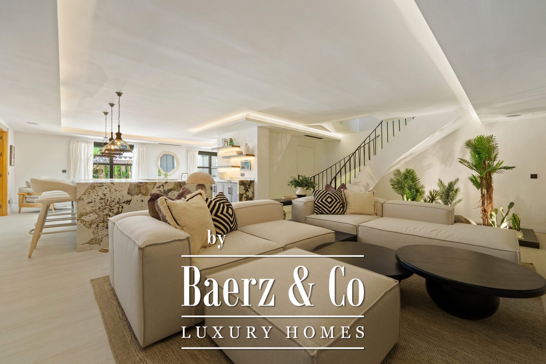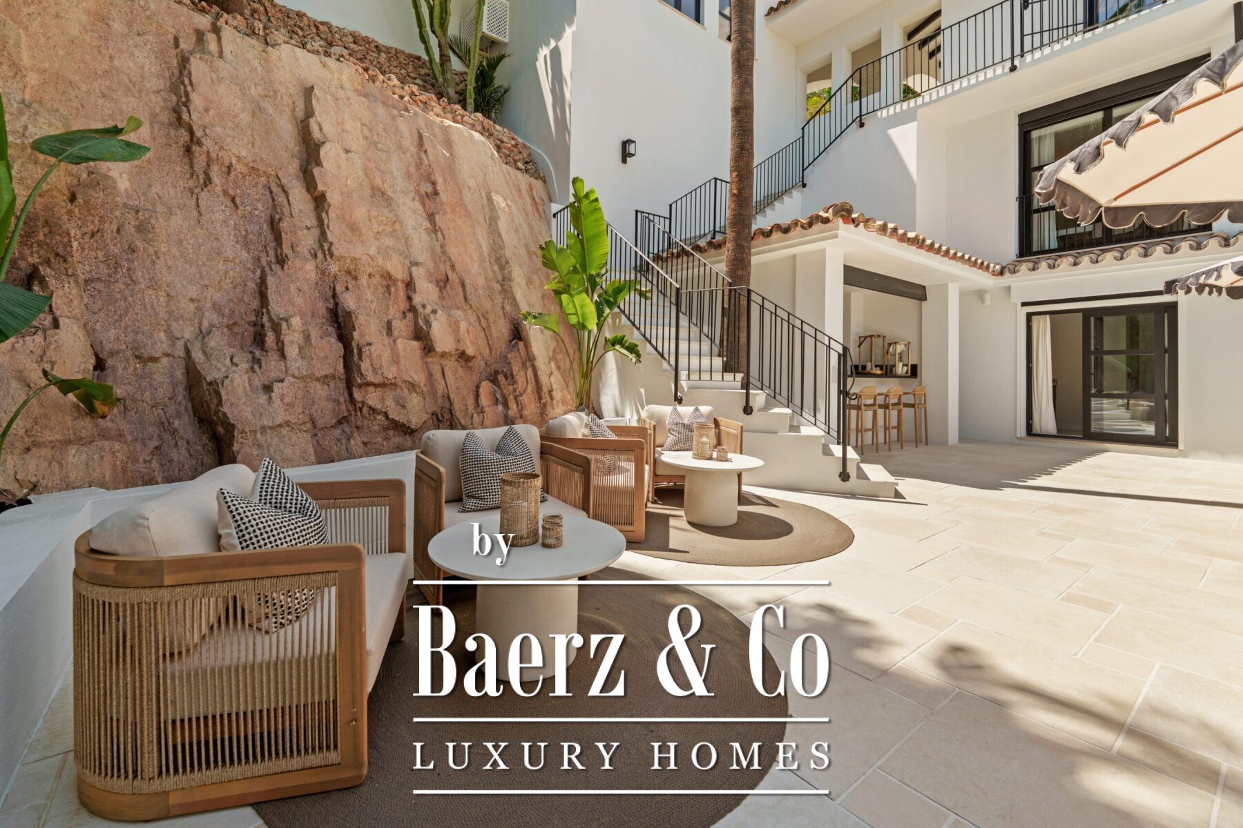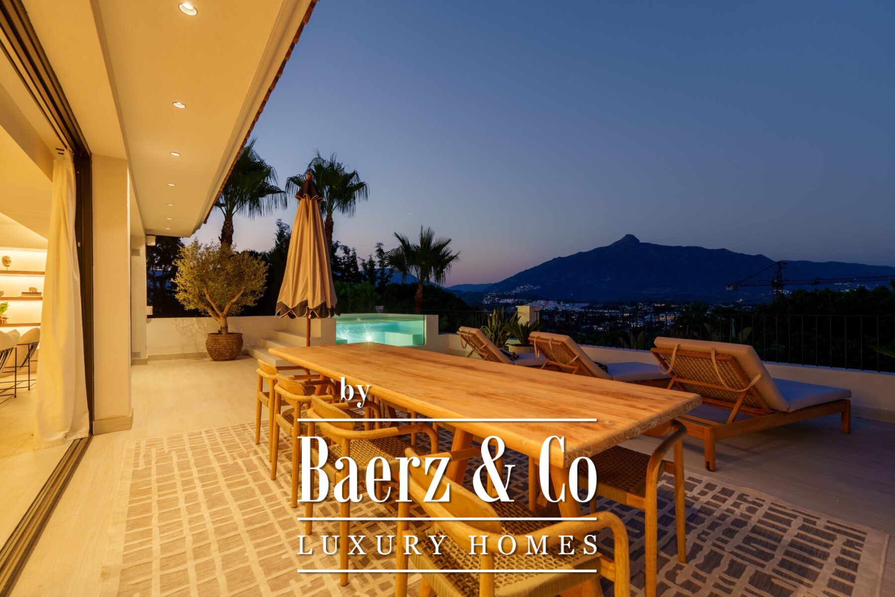 Outside, landscaped gardens embrace a private swimming pool and sunken lounge, adorned with ambient lighting and shaded spaces for tranquil reflection or social occasions. A multi-car garage, security features, and proximity to golf courses, the beach, Puerto Banús, and Marbella’s amenities complete the offering.
