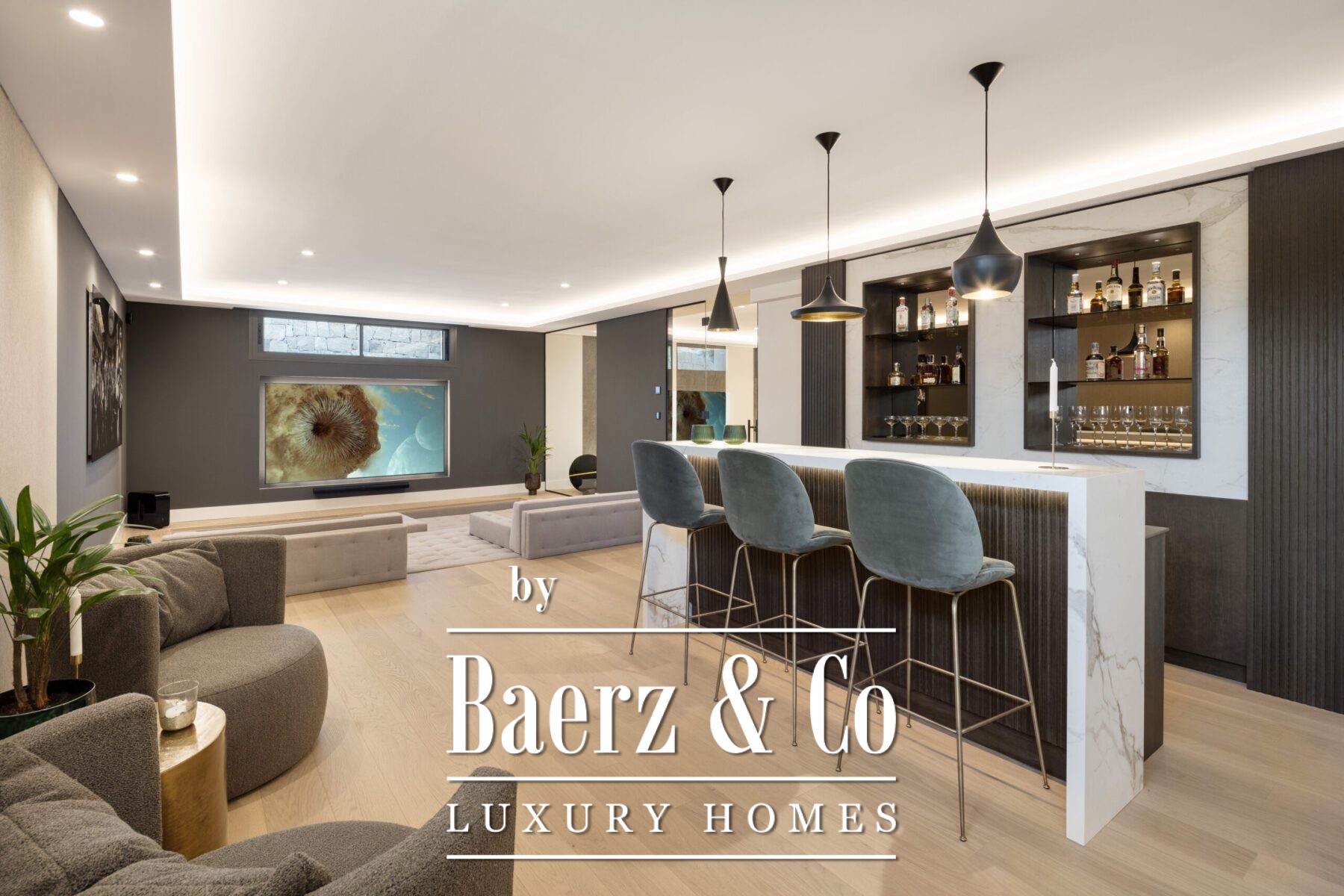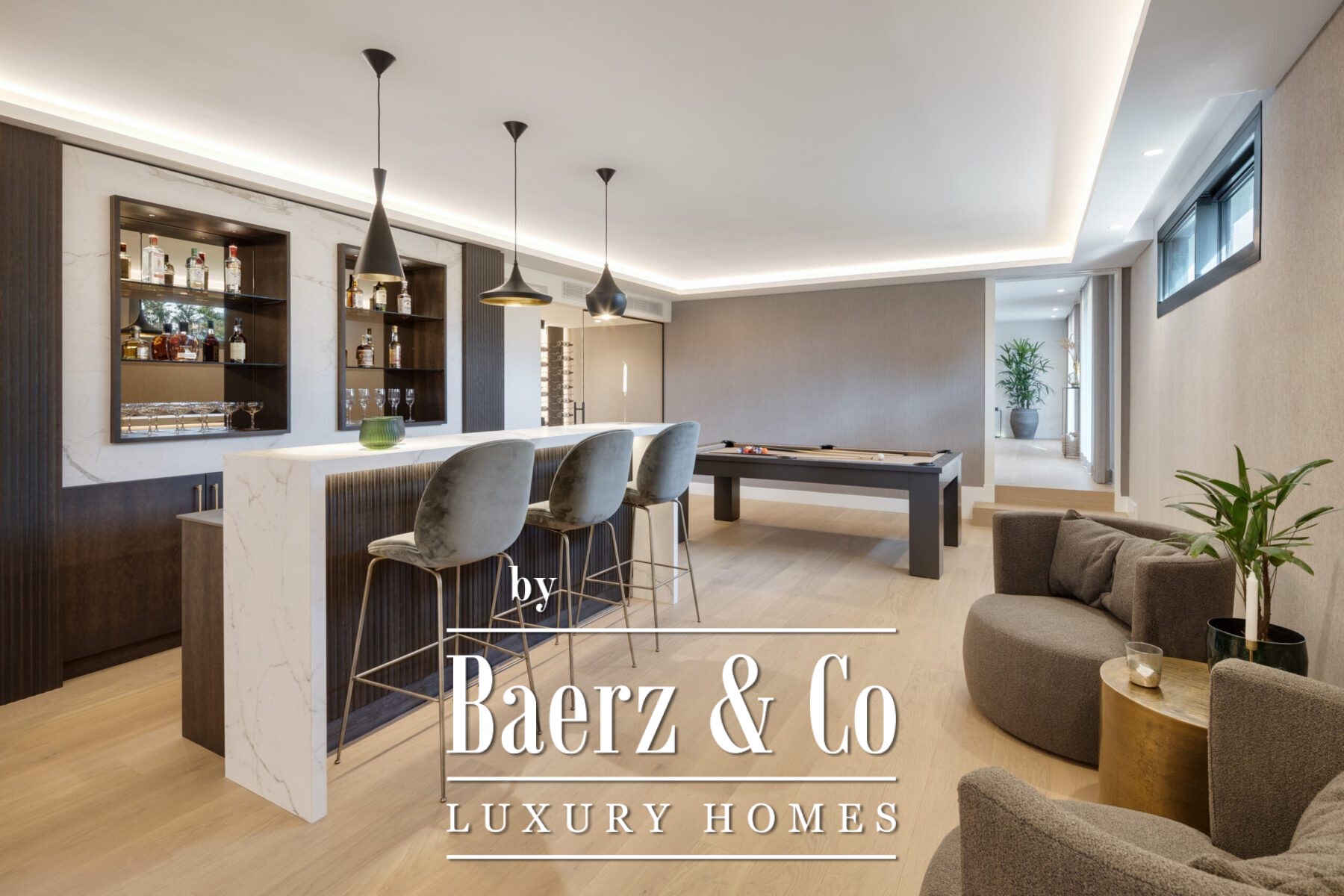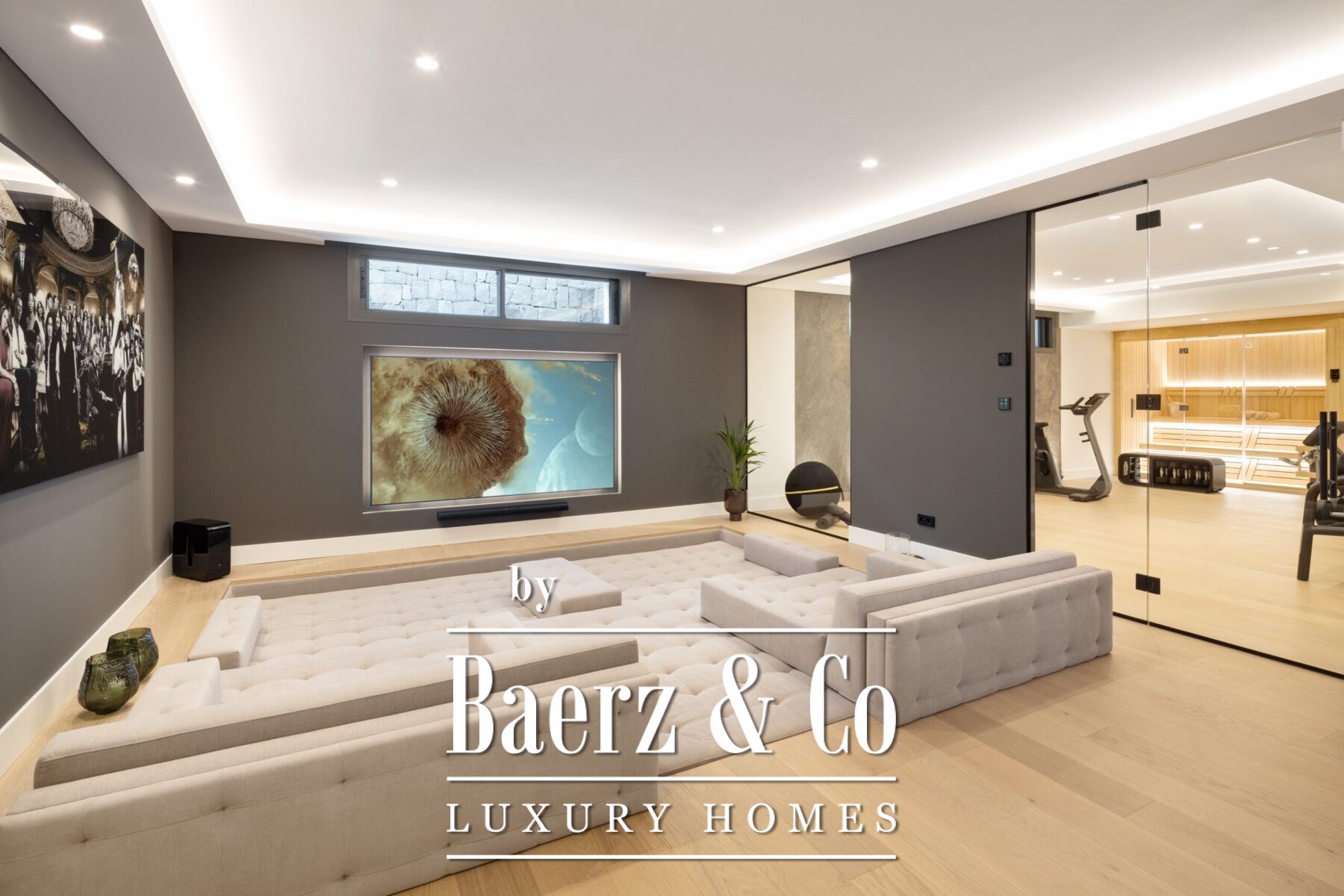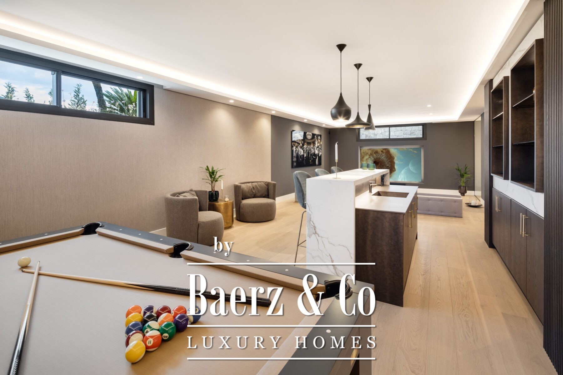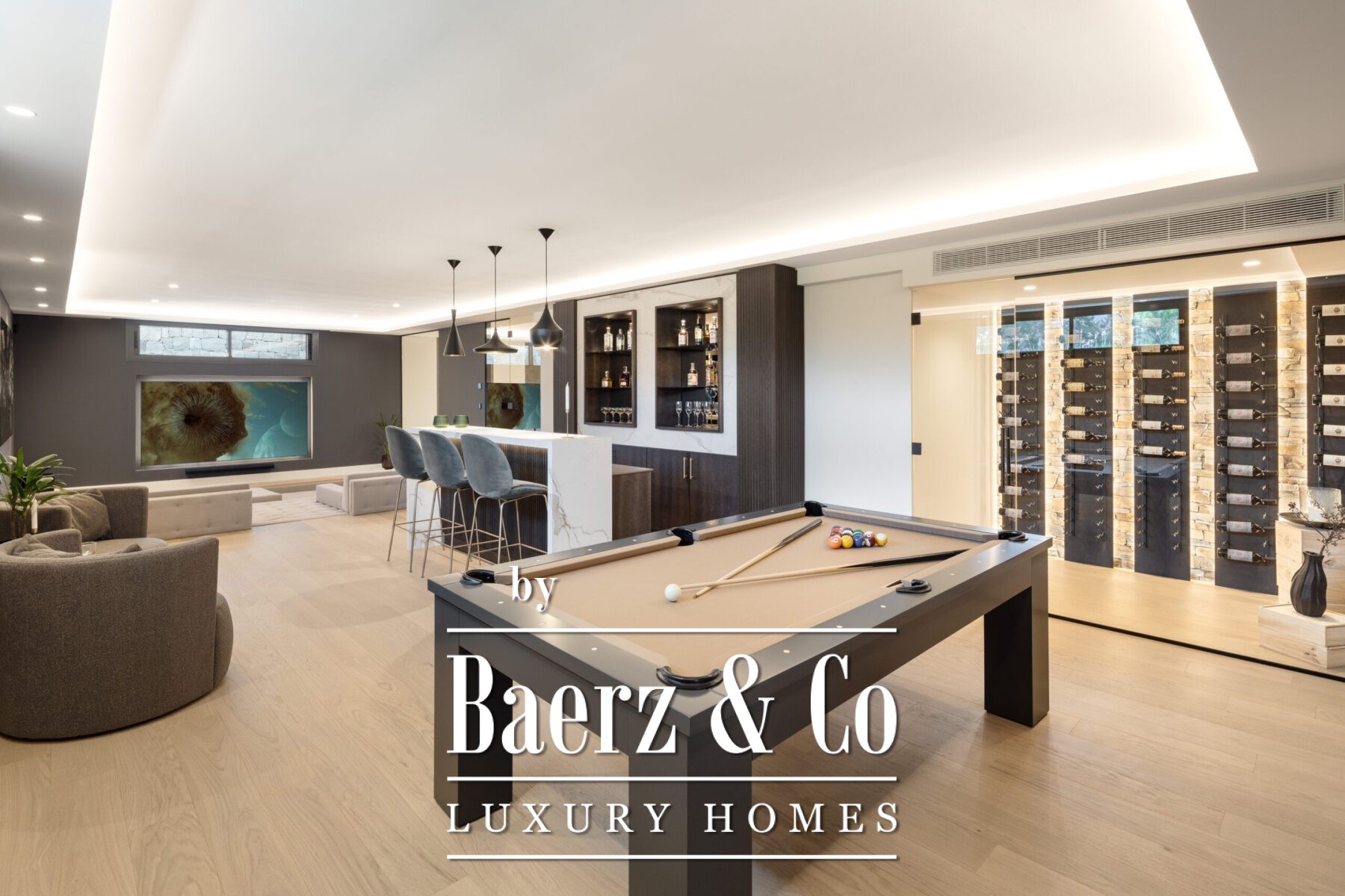 Below, a social level reveals the true spirit of relaxation and entertainment: bar, cinema, pool table, wine bodega, gym, and sauna, alongside another guest suite. Outdoor living is amplified through multiple terraces, a secluded garden, and a sun-drenched poolside lounge. The heated saltwater pool faces both the sea and mountains, reflected in the villa’s exceptional orientation.